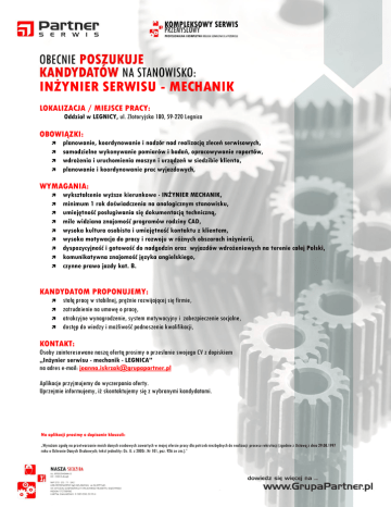INŻYNIER SERWISU - MECHANIK LOKALIZACJA / MIEJSCE PRACY: Oddział w LEGNICY, ul. Złotoryjska 180, 59-220 Legnica OBOWIĄZKI: planowanie, koordynowanie i nadzór nad realizacją zleceń serwisowych, samodzielne wykonywanie pomiarów i badań, opracowywanie raportów, wdrożenia i uruchomienia maszyn i urządzeń w siedzibie klienta, planowanie i koordynowanie prac wyjazdowych, WYMAGANIA: wykształcenie wyższe kierunkowe - INŻYNIER MECHANIK, minimum 1 rok doświadczenia na analogicznym stanowisku, umiejętność posługiwania się dokumentacją techniczną, mile widziana znajomość programów rodziny CAD, wysoka kultura osobista i umiejętność kontaktu z klientem, wysoka motywacja do pracy i rozwoju w różnych obszarach inżynierii, dyspozycyjność i gotowość do nadgodzin oraz wyjazdów wdrożeniowych na terenie całej Polski, komunikatywna znajomość języka angielskiego, czynne prawo jazdy kat. B. KANDYDATOM PROPONUJEMY: stałą pracę w stabilnej, prężnie rozwijającej się firmie, zatrudnienie na umowę o pracę, atrakcyjne wynagrodzenie, system motywacyjny i zabezpieczenie socjalne, dostęp do wiedzy i możliwość podnoszenia kwalifikacji, KONTAKT: Osoby zainteresowane naszą ofertą prosimy o przesłanie swojego CV z dopiskiem „Inżynier serwisu - mechanik - LEGNICA” na adres e-mail: [email protected] Aplikacje przyjmujemy do wyczerpania oferty. Uprzejmie informujemy, iż skontaktujemy się z wybranymi kandydatami. Na aplikacji prosimy o dopisanie klauzuli: „Wyrażam zgodę na przetwarzanie moich danych osobowych zawartych w mojej ofercie pracy dla potrzeb niezbędnych do realizacji procesu rekrutacji (zgodnie z Ustawą z dnia 29.08.1997 roku o Ochronie Danych Osobowych; tekst jednolity: Dz. U. z 2002r. Nr 101, poz. 926 ze zm.).”