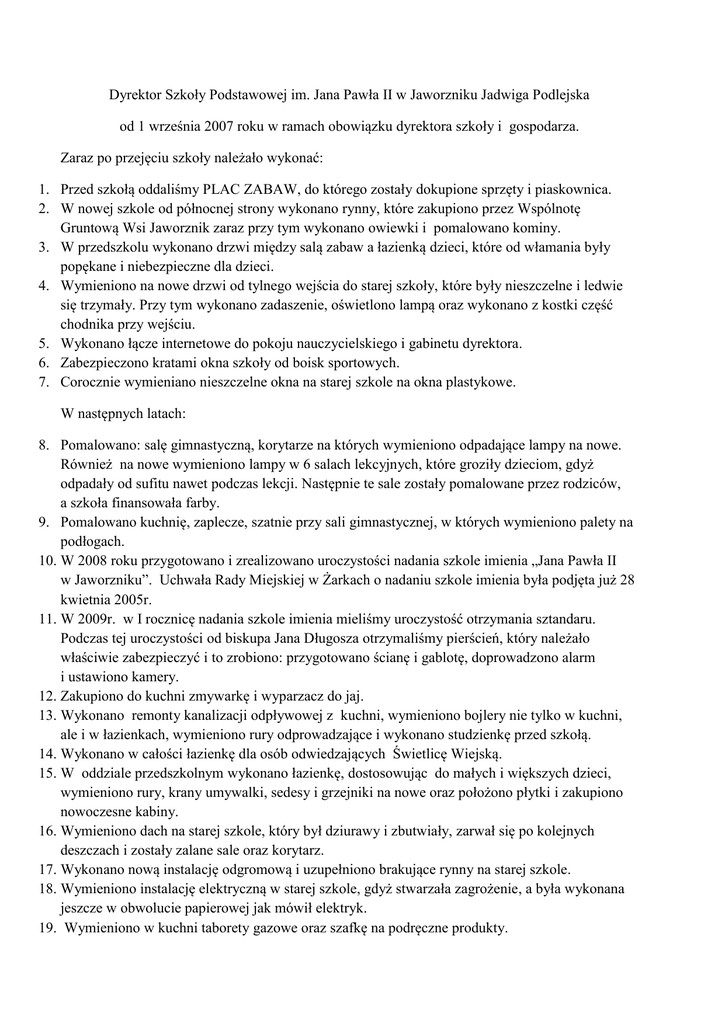 Dyrektor Szkoły Podstawowej im. Jana Pawła II w Jaworzniku Jadwiga Podlejska od 1 września 2007 roku w ramach obowiązku dyrektora szkoły i gospodarza. Zaraz po przejęciu szkoły należało wykonać: 1. Przed szkołą oddaliśmy PLAC ZABAW, do którego zostały dokupione sprzęty i piaskownica. 2. W nowej szkole od północnej strony wykonano rynny, które zakupiono przez Wspólnotę Gruntową Wsi Jaworznik zaraz przy tym wykonano owiewki i pomalowano kominy. 3. W przedszkolu wykonano drzwi między salą zabaw a łazienką dzieci, które od włamania były popękane i niebezpieczne dla dzieci. 4. Wymieniono na nowe drzwi od tylnego wejścia do starej szkoły, które były nieszczelne i ledwie się trzymały. Przy tym wykonano zadaszenie, oświetlono lampą oraz wykonano z kostki część chodnika przy wejściu. 5. Wykonano łącze internetowe do pokoju nauczycielskiego i gabinetu dyrektora. 6. Zabezpieczono kratami okna szkoły od boisk sportowych. 7. Corocznie wymieniano nieszczelne okna na starej szkole na okna plastykowe. W następnych latach: 8. Pomalowano: salę gimnastyczną, korytarze na których wymieniono odpadające lampy na nowe. Również na nowe wymieniono lampy w 6 salach lekcyjnych, które groziły dzieciom, gdyż odpadały od sufitu nawet podczas lekcji. Następnie te sale zostały pomalowane przez rodziców, a szkoła finansowała farby. 9. Pomalowano kuchnię, zaplecze, szatnie przy sali gimnastycznej, w których wymieniono palety na podłogach. 10. W 2008 roku przygotowano i zrealizowano uroczystości nadania szkole imienia „Jana Pawła II w Jaworzniku”. Uchwała Rady Miejskiej w Żarkach o nadaniu szkole imienia była podjęta już 28 kwietnia 2005r. 11. W 2009r. w I rocznicę nadania szkole imienia mieliśmy uroczystość otrzymania sztandaru. Podczas tej uroczystości od biskupa Jana Długosza otrzymaliśmy pierścień, który należało właściwie zabezpieczyć i to zrobiono: przygotowano ścianę i gablotę, doprowadzono alarm i ustawiono kamery. 12. Zakupiono do kuchni zmywarkę i wyparzacz do jaj. 13. Wykonano remonty kanalizacji odpływowej z kuchni, wymieniono bojlery nie tylko w kuchni, ale i w łazienkach, wymieniono rury odprowadzające i wykonano studzienkę przed szkołą. 14. Wykonano w całości łazienkę dla osób odwiedzających Świetlicę Wiejską. 15. W oddziale przedszkolnym wykonano łazienkę, dostosowując do małych i większych dzieci, wymieniono rury, krany umywalki, sedesy i grzejniki na nowe oraz położono płytki i zakupiono nowoczesne kabiny. 16. Wymieniono dach na starej szkole, który był dziurawy i zbutwiały, zarwał się po kolejnych deszczach i zostały zalane sale oraz korytarz. 17. Wykonano nową instalację odgromową i uzupełniono brakujące rynny na starej szkole. 18. Wymieniono instalację elektryczną w starej szkole, gdyż stwarzała zagrożenie, a była wykonana jeszcze w obwolucie papierowej jak mówił elektryk. 19. Wymieniono w kuchni taborety gazowe oraz szafkę na podręczne produkty. 20. Dokupiono do sali komputerowej i gabinetu dyrektora komputery. 21. Wykonano monitoring na korytarzach i przed szkołą podnosząc bezpieczeństwo uczniów oraz zabezpieczenie mienia. 22. Przeprowadzona została termomodernizacja i modernizacja układu grzewczego. 23. Zakupiono meble do szatni, kolorowe szafki dla klas I-III, białe i korkowe tablice dla wszystkich klas i na korytarze, ławeczki i krzesełka regulowane do klasy I, szafy do sali matematycznej oraz przenośną tablicę interaktywną wraz z rzutnikiem, sprzęt nagłaśniający oraz 4 radiomagnetofony. 24. Zakupiono zestaw nagłaśniający, wieżę stereo oraz 4 radiomagnetofony. 25. Co rocznie zakupujemy programy do pracowni komputerowej; do języka polskiego, matematyki, przyrody, historii, języka angielskiego, techniki, logopedii, przygotowanie do karty rowerowej oraz do zajęć pozalekcyjnych i rewalidacji. Nasza baza jest ciągle unowocześniana i aktualizowana. 26. Zakupiono pomoce dydaktyczne oraz zabawki do oddziału przedszkolnego. Został również zakupiony zestaw kształtek piankowych oraz ławeczki gimnastyczne do bezpiecznych ćwiczeń oraz zabaw na sali. 27. Doposażono sale gimnastyczną w nowe materace, Mini hokej dla młodszych i starszych dzieci, Hula hop i piłki do siatkówki i piłki nożnej, komplety do tenisa stołowego oraz piłkarzyki. 28. Na bieżąco jest doposażona biblioteka oraz biblioteczki w salach lekcyjnych klas młodszych i w oddziale przedszkolnym 29. W miarę posiadanych środków dokupujemy pomoce dydaktyczne, sprzęt dla klas I-III do aktywnych przerw śródlekcyjnych i pomoce dydaktyczne. 30. Organizowaliśmy Pikniki Rodzinne, na które były zaproszone zespoły folklorystyczne z naszej gminy, zespoły z Miejskiego Ośrodka w Myszkowie oraz 2 krotnie na te uroczystości środowiskowe zaprosiliśmy ORKIESTRĘ GÓRNICZĄ KW Bielszowice. 31. Dyrektor był współorganizatorem oddania ulicy Wschodniej. 32. Oddanie boiska wielofunkcyjnego „Orlik”, współorganizator oddania ulicy Szkolnej. 33. W roku szkolnym 2014/2015 - zakupiono programy i pomoce dydaktyczne do nauczania języka angielskiego, matematyki, języka polskiego, edukacji wczesnoszkolnej oraz doposażono oddział przedszkolny 34. Zakupiono przenośna tablicę interaktywną, telewizor i odtwarzacz, rolety do sal 3,5,8,12 oraz do kuchni. 35. Dokupiono regały do sali 5, 16,17 by zabezpieczyć zakupiony telewizor, rzutniki i tablice interaktywną. Przygotowano i zrealizowano projekty podnoszące umiejętności i wiedzę naszych uczniów: A) W ramach Radosnej Szkoły „Kraina Sprawności i Zdrowia Na Deszcz” został przygotowany projekt przez dyr. J.Podlejską p. B. Ledwoch i K. Deptułę B) Przygotowane zostały dwa wnioski do Fundacji Ekologicznej „SILESJA” przygotowane: pierwszy przez dyr. J. Podlejską, drugi przez p. M. Gurbałę i B. Ledwoch, w ramach których obsadziliśmy drzewkami i krzewami boisko szkolne. C) W ramach współpracy ze Stowarzy
