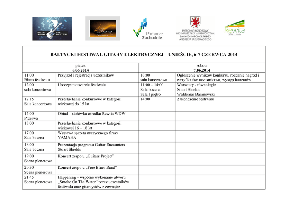 BAŁTYCKI FESTIWAL GITARY ELEKTRYCZNEJ – UNIEŚCIE, 6-7 CZERWCA 2014 11:00 Biuro festiwalu 12:00 sala koncertowa piątek 6.06.2014 Przyjazd i rejestracja uczestników Uroczyste otwarcie festiwalu 12:15 Sala koncertowa Przesłuchania konkursowe w kategorii wiekowej do 15 lat 14:00 Przerwa 15:00 Obiad – stołówka ośrodka Rewita WDW 17:00 Sala boczna Przesłuchania konkursowe w kategorii wiekowej 16 – 18 lat Wystawa sprzętu muzycznego firmy YAMAHA 18:00 Sala boczna Prezentacja programu Guitar Encounters – Stuart Shields 19:00 Scena plenerowa Koncert zespołu „Guitars Project” 20:30 Scena plenerowa 21:45 Scena plenerowa Koncert zespołu „Free Blues Band” Happening – wspólne wykonanie utworu „Smoke On The Water” przez uczestników festiwalu oraz gitarzystów z zewnątrz 10:00 sala koncertowa 11:00 – 14:00 Sala boczna Sala I piętro 14:00 sobota 7.06.2014 Ogłoszenie wyników konkursu, rozdanie nagród i certyfikatów uczestnictwa, występ laureatów Warsztaty - równolegle Stuart Shields Waldemar Baranowski Zakończenie festiwalu