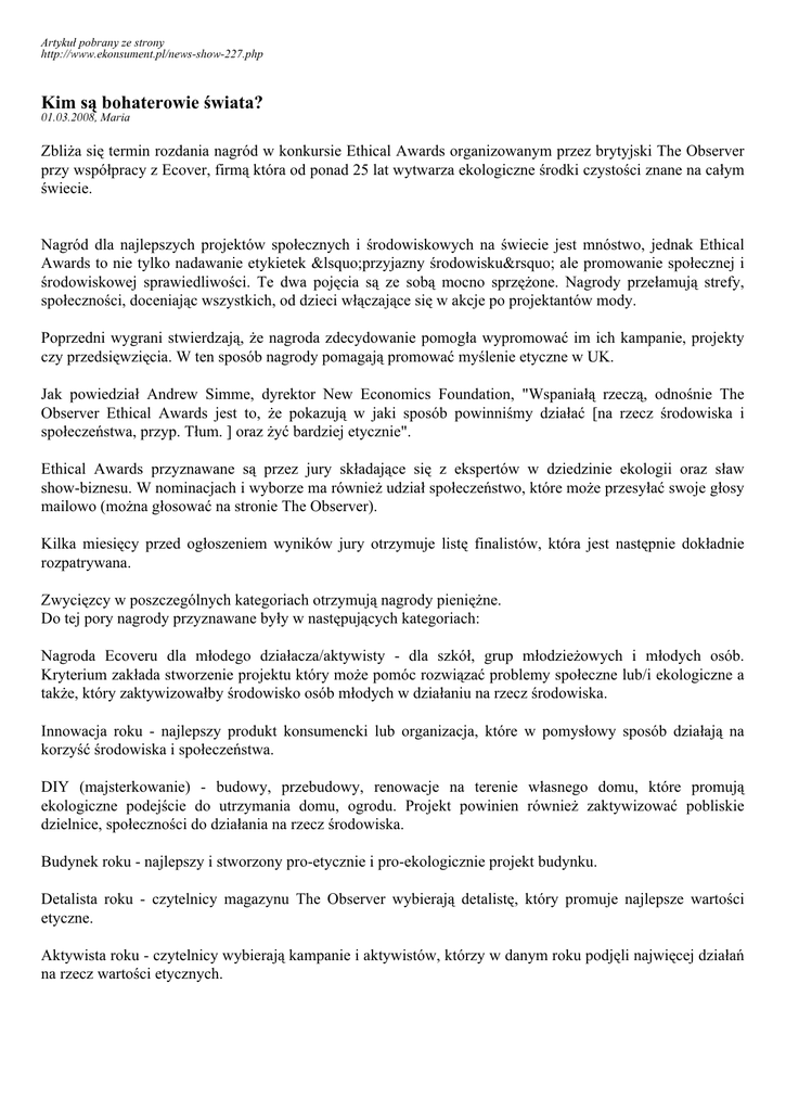 Artykuł pobrany ze strony http://www.ekonsument.pl/news-show-227.php Kim są bohaterowie świata? 01.03.2008, Maria Zbliża się termin rozdania nagród w konkursie Ethical Awards organizowanym przez brytyjski The Observer przy współpracy z Ecover, firmą która od ponad 25 lat wytwarza ekologiczne środki czystości znane na całym świecie. Nagród dla najlepszych projektów społecznych i środowiskowych na świecie jest mnóstwo, jednak Ethical Awards to nie tylko nadawanie etykietek ‘przyjazny środowisku’ ale promowanie społecznej i środowiskowej sprawiedliwości. Te dwa pojęcia są ze sobą mocno sprzężone. Nagrody przełamują strefy, społeczności, doceniając wszystkich, od dzieci włączające się w akcje po projektantów mody. Poprzedni wygrani stwierdzają, że nagroda zdecydowanie pomogła wypromować im ich kampanie, projekty czy przedsięwzięcia. W ten sposób nagrody pomagają promować myślenie etyczne w UK. Jak powiedział Andrew Simme, dyrektor New Economics Foundation, "Wspaniałą rzeczą, odnośnie The Observer Ethical Awards jest to, że pokazują w jaki sposób powinniśmy działać [na rzecz środowiska i społeczeństwa, przyp. Tłum. ] oraz żyć bardziej etycznie". Ethical Awards przyznawane są przez jury składające się z ekspertów w dziedzinie ekologii oraz sław show-biznesu. W nominacjach i wyborze ma również udział społeczeństwo, które może przesyłać swoje głosy mailowo (można głosować na stronie The Observer). Kilka miesięcy przed ogłoszeniem wyników jury otrzymuje listę finalistów, która jest następnie dokładnie rozpatrywana. Zwycięzcy w poszczególnych kategoriach otrzymują nagrody pieniężne. Do tej pory nagrody przyznawane były w następujących kategoriach: Nagroda Ecoveru dla młodego działacza/aktywisty - dla szkół, grup młodzieżowych i młodych osób. Kryterium zakłada stworzenie projektu który może pomóc rozwiązać problemy społeczne lub/i ekologiczne a także, który zaktywizowałby środowisko osób młodych w działaniu na rzecz środowiska. Innowacja roku - najlepszy produkt konsumencki lub organizacja, które w pomysłowy sposób działają na korzyść środowiska i społeczeństwa. DIY (majsterkowanie) - budowy, przebudowy, renowacje na terenie własnego domu, które promują ekologiczne podejście do utrzymania domu, ogrodu. Projekt powinien również zaktywizować pobliskie dzielnice, społeczności do działania na rzecz środowiska. Budynek roku - najlepszy i stworzony pro-etycznie i pro-ekologicznie projekt budynku. Detalista roku - czytelnicy magazynu The Observer wybierają detalistę, który promuje najlepsze wartości etyczne. Aktywista roku - czytelnicy wybierają kampanie i aktywistów, którzy w danym roku podjęli najwięcej działań na rzecz wartości etycznych. Tłumaczenie: Dorota Sołtysikowska Na podstawie: The Observer Ethical Awards (http://observer.guardian.co.uk/ethicalawards )