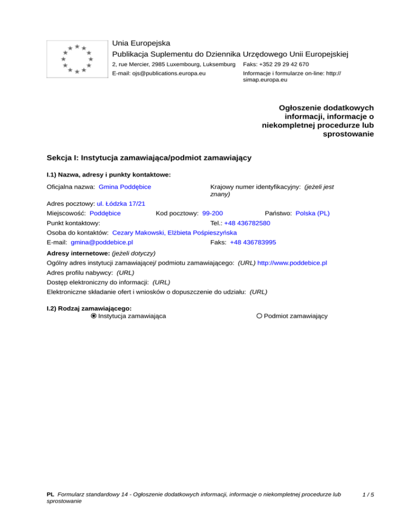 Unia Europejska Publikacja Suplementu do Dziennika Urzędowego Unii Europejskiej 2, rue Mercier, 2985 Luxembourg, Luksemburg Faks: +352 29 29 42 670 E-mail: [email protected] Informacje i formularze on-line: http:// simap.europa.eu Ogłoszenie dodatkowych informacji, informacje o niekompletnej procedurze lub sprostowanie Sekcja I: Instytucja zamawiająca/podmiot zamawiający I.1) Nazwa, adresy i punkty kontaktowe: Krajowy numer identyfikacyjny: (jeżeli jest znany) _____ Oficjalna nazwa: Gmina Poddębice Adres pocztowy: ul. Łódzka 17/21 Miejscowość: Poddębice Kod pocztowy: 99-200 Punkt kontaktowy: _____ Państwo: Polska (PL) Tel.: +48 436782580 Osoba do kontaktów: Cezary Makowski, Elżbieta Pośpieszyńska E-mail: [email protected] Faks: +48 436783995 Adresy internetowe: (jeżeli dotyczy) Ogólny adres instytucji zamawiającej/ podmiotu zamawiającego: (URL) http://www.poddebice.pl Adres profilu nabywcy: (URL) _____ Dostęp elektroniczny do informacji: (URL) _____ Elektroniczne składanie ofert i wniosków o dopuszczenie do udziału: (URL) _____ I.2) Rodzaj zamawiającego: Instytucja zamawiająca Podmiot zamawiający PL Formularz standardowy 14 - Ogłoszenie dodatkowych informacji, informacje o niekompletnej procedurze lub sprostowanie 1/5 Sekcja II: Przedmiot zamówienia II.1.1) Nazwa nadana zamówieniu: Opracowanie dokumentacji projektowo – kosztorysowej wraz z niezbędnymi uzgodnieniami do uzbrojenia terenu dla potrzeb budowy kompleksu pn. „Przeciw wykluczeniu – Kraina Bez Barier w Poddębicach – rewitalizacja kompleksu geotermalnego” przy ul. Mickiewicza nr 19 II.1.2) Krótki opis zamówienia lub zakupu: (podano w pierwotnym ogłoszeniu) Przedmiotem zamówienia jest wykonanie dokumentacji projektowo - kosztorysowej z wykorzystaniem obiektów wchodzących w skład wielofunkcyjnego ośrodka sportu, turystyki i rekreacji usytuowanego przy ul. Mickiewicza 19 w Poddębicach, dla potrzeb budowy przedsięwzięcia pn. Przeciw wykluczeniu – Kraina Bez Barier w Poddębicach – rewitalizacja kompleksu geotermalnego. Szczegółowy opis przedmiotu zamówienia znajduje się w załączniku Nr 7 do SIWZ - Opis przedmiotu zamówienia. II.1.3) Wspólny Słownik Zamówień (CPV) Główny przedmiot Dodatkowe przedmioty Słownik główny 71000000 71200000 71220000 71221000 71242000 71244000 71245000 71246000 71250000 71251000 71300000 71313400 71313420 71313440 71314000 71314100 71314310 71315300 71318100 71320000 71321000 71321200 71321300 71321400 71323100 71325000 71327000 71332000 71334000 71351100 71351200 Słownik uzupełniający (jeżeli dotyczy) PL Formularz standardowy 14 - Ogłoszenie dodatkowych informacji, informacje o niekompletnej procedurze lub sprostowanie 2/5 Słownik główny 71351210 71351220 71354000 72700000 75251110 79934000 79930000 79932000 79931000 71356000 71352000 71351000 71350000 71520000 71510000 71500000 71420000 71400000 71340000 71330000 71210000 71240000 71310000 79933000 Słownik uzupełniający (jeżeli dotyczy) PL Formularz standardowy 14 - Ogłoszenie dodatkowych informacji, informacje o niekompletnej procedurze lub sprostowanie 3/5 Sekcja IV: Procedura IV.1)Rodzaj procedury (podano w pierwotnym ogłoszeniu) Otwarta Ograniczona Ograniczona przyspieszona Negocjacyjna Negocjacyjna przyspieszona Dialog konkurencyjny Negocjacyjna z uprzednim ogłoszeniem Negocjacyjna bez uprzedniego ogłoszenia Negocjacyjna z publikacją ogłoszenia o zamówieniu Negocjacyjna bez publikacji ogłoszenia o zamówieniu Udzielenie zamówienia bez uprzedniej publikacji ogłoszenia o zamówieniu w Dzienniku Urzędowym Unii Europejskiej IV.2)Informacje administracyjne IV.2.1)Numer referencyjny: (podano w pierwotnym ogłoszeniu) IGKM.271.18.2015 IV.2.2)Dane referencyjne ogłoszenia w przypadku ogłoszeń przesłanych drogą elektroniczną: Pierwotne ogłoszenie przesłane przez eNotices TED eSender Login: ENOTICES_gminapoddebice Dane referencyjne ogłoszenia: 2015-157506 rok i numer dokumentu IV.2.3)Ogłoszenie, którego dotyczy niniejsza publikacja: Numer ogłoszenia w Dz.U.: 2015/S 231-420318 z dnia: 28/11/2015 (dd/mm/rrrr) IV.2.4)Data wysłania pierwotnego ogłoszenia: 25/11/2015 (dd/mm/rrrr) PL Formularz standardowy 14 - Ogłoszenie dodatkowych informacji, informacje o niekompletnej procedurze lub sprostowanie 4/5 Sekcja VI: Informacje uzupełniające VI.1) Ogłoszenie dotyczy: Procedury niepełnej Sprostowania Informacji dodatkowych VI.2) Informacje na temat niepełnej procedury udzielenia zamówienia: Postępowanie o udzielenie zamówienia zostało przerwane Postępowanie o udzielenie zamówienia uznano za nieskuteczne Zamówienia nie udzielono Zamówienie może być przedmiotem ponownej publikacji VI.3) Informacje do poprawienia lub dodania : VI.3.1) Zmiana oryginalnej informacji podanej przez instytucję zamawiającą Publikacja w witrynie TED niezgodna z oryginalną informacją, przekazaną przez instytucję zamawiającą Oba przypadki VI.3.2) W ogłoszeniu pierwotnym W odpowiedniej dokumentacji przetargowej (więcej informacji w odpowiedniej dokumentacji przetargowej) W obu przypadkach (więcej informacji w odpowiedniej dokumentacji przetargowej) VI.3.3) Tekst, który należy poprawić w pierwotnym ogłoszeniu Miejsce, w którym znajduje się Zamiast: zmieniany tekst: Opracowanie dokumentacji II.1.1)Nazwa nadana zamówieniu projektowo – kosztorysowej wraz przez instytucję zamawiającą: z niezbędnymi uzgodnieniami do uzbrojenia terenu dla potrzeb budowy kompleksu pn. „Przeciw wykluczeniu – Kraina Bez Barier w Poddębicach – rewitalizacja kompleksu geotermalnego” przy ul. Mickiewicza nr 19. VI.3.4) Daty, które należy poprawić w pierwotnym ogłoszeniu Miejsce, w którym znajdują się Zamiast: zmieniane daty: Powinno być: Opracowanie dokumentacji projektowo – kosztorysowej dla potrzeb budowy przedsięwzięcia pn. „Przeciw wykluczeniu – Kraina Bez Barier w Poddębicach – rewitalizacja kompleksu geotermalnego” przy, ul. Mickiewicza nr 19. Powinn