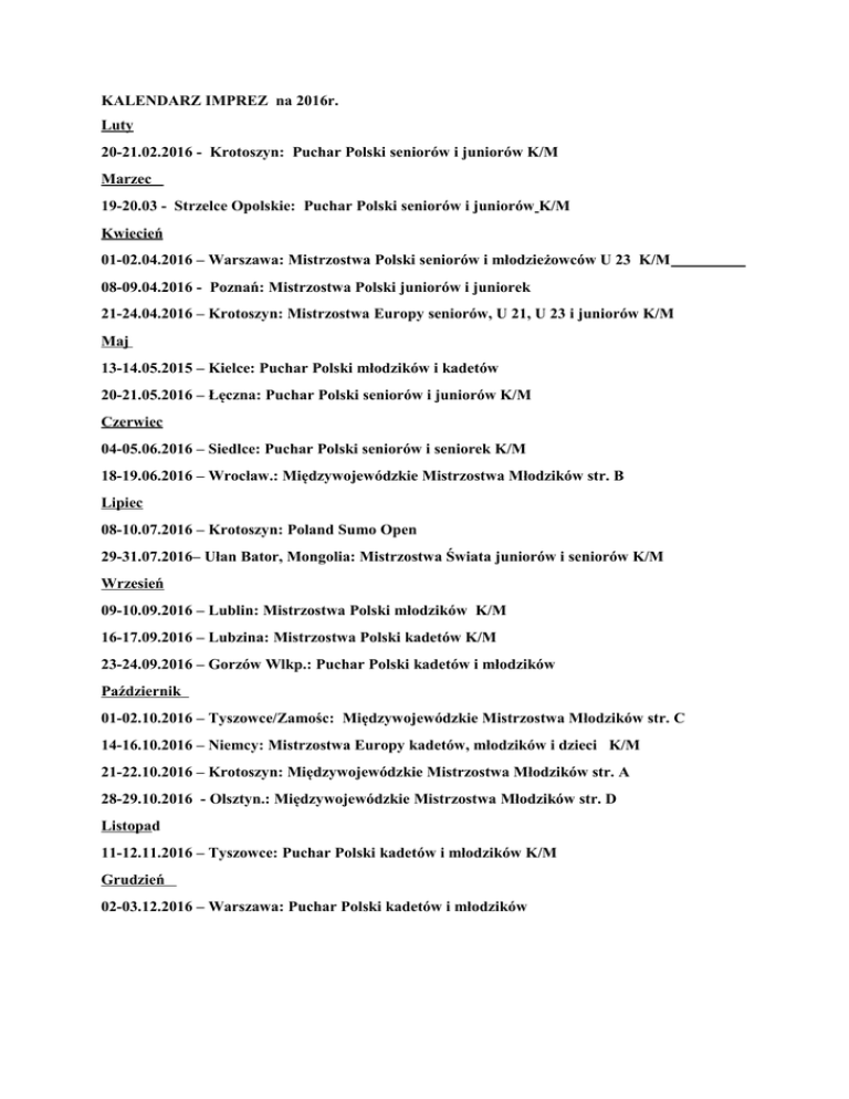 KALENDARZ IMPREZ na 2016r. Luty 20-21.02.2016 - Krotoszyn: Puchar Polski seniorów i juniorów K/M Marzec 19-20.03 - Strzelce Opolskie: Puchar Polski seniorów i juniorów K/M Kwiecień 01-02.04.2016 – Warszawa: Mistrzostwa Polski seniorów i młodzieżowców U 23 K/M 08-09.04.2016 - Poznań: Mistrzostwa Polski juniorów i juniorek 21-24.04.2016 – Krotoszyn: Mistrzostwa Europy seniorów, U 21, U 23 i juniorów K/M Maj 13-14.05.2015 – Kielce: Puchar Polski młodzików i kadetów 20-21.05.2016 – Łęczna: Puchar Polski seniorów i juniorów K/M Czerwiec 04-05.06.2016 – Siedlce: Puchar Polski seniorów i seniorek K/M 18-19.06.2016 – Wrocław.: Międzywojewódzkie Mistrzostwa Młodzików str. B Lipiec 08-10.07.2016 – Krotoszyn: Poland Sumo Open 29-31.07.2016– Ułan Bator, Mongolia: Mistrzostwa Świata juniorów i seniorów K/M Wrzesień 09-10.09.2016 – Lublin: Mistrzostwa Polski młodzików K/M 16-17.09.2016 – Lubzina: Mistrzostwa Polski kadetów K/M 23-24.09.2016 – Gorzów Wlkp.: Puchar Polski kadetów i młodzików Październik 01-02.10.2016 – Tyszowce/Zamośc: Międzywojewódzkie Mistrzostwa Młodzików str. C 14-16.10.2016 – Niemcy: Mistrzostwa Europy kadetów, młodzików i dzieci K/M 21-22.10.2016 – Krotoszyn: Międzywojewódzkie Mistrzostwa Młodzików str. A 28-29.10.2016 - Olsztyn.: Międzywojewódzkie Mistrzostwa Młodzików str. D Listopad 11-12.11.2016 – Tyszowce: Puchar Polski kadetów i młodzików K/M Grudzień 02-03.12.2016 – Warszawa: Puchar Polski kadetów i młodzików