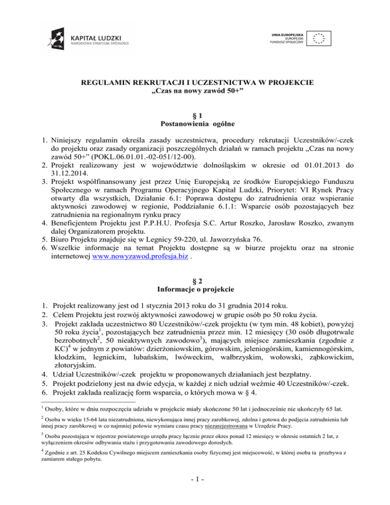 REGULAMIN REKRUTACJI I UCZESTNICTWA W PROJEKCIE „Czas na nowy zawód 50+” §1 Postanowienia ogólne 1. Niniejszy regulamin określa zasady uczestnictwa, procedury rekrutacji Uczestników/-czek do projektu oraz zasady organizacji poszczególnych działań w ramach projektu „Czas na nowy zawód 50+” (POKL.06.01.01.-02-051/12-00). 2. Projekt realizowany jest w województwie dolnośląskim w okresie od 01.01.2013 do 31.12.2014. 3. Projekt współfinansowany jest przez Unię Europejską ze środków Europejskiego Funduszu Społecznego w ramach Programu Operacyjnego Kapitał Ludzki, Priorytet: VI Rynek Pracy otwarty dla wszystkich, Działanie 6.1: Poprawa dostępu do zatrudnienia oraz wspieranie aktywności zawodowej w regionie, Poddziałanie 6.1.1: Wsparcie osób pozostających bez zatrudnienia na regionalnym rynku pracy 4. Beneficjentem Projektu jest P.P.H.U. Profesja S.C. Artur Roszko, Jarosław Roszko, zwanym dalej Organizatorem projektu. 5. Biuro Projektu znajduje się w Legnicy 59-220, ul. Jaworzyńska 76. 6. Wszelkie informacje na temat Projektu dostępne są w biurze projektu oraz na stronie internetowej www.nowyzawod.profesja.biz . §2 Informacje o projekcie 1. Projekt realizowany jest od 1 stycznia 2013 roku do 31 grudnia 2014 roku. 2. Celem Projektu jest rozwój aktywności zawodowej w grupie osób po 50 roku życia. 3. Projekt zakłada uczestnictwo 80 Uczestników/-czek projektu (w tym min. 48 kobiet), powyżej 50 roku życia1, pozostających bez zatrudnienia przez min. 12 miesięcy (30 osób długotrwale bezrobotnych2, 50 nieaktywnych zawodowo3), mających miejsce zamieszkania (zgodnie z KC)4 w jednym z powiatów: dzierżoniowskim, górowskim, jeleniogórskim, kamiennogórskim, kłodzkim, legnickim, lubańskim, lwóweckim, wałbrzyskim, wołowski, ząbkowickim, złotoryjskim. 4. Udział Uczestników/-czek projektu w proponowanych działaniach jest bezpłatny. 5. Projekt podzielony jest na dwie edycja, w każdej z nich udział weźmie 40 Uczestników/-czek. 6. Projekt zakłada realizację form wsparcia, o których mowa w § 4. 1 Osoby, które w dniu rozpoczęcia udziału w projekcie miały skończone 50 lat i jednocześnie nie ukończyły 65 lat. 2 Osoba w wieku 15-64 lata niezatrudniona, niewykonująca innej pracy zarobkowej, zdolna i gotowa do podjęcia zatrudnienia lub innej pracy zarobkowej w co najmniej połowie wymiaru czasu pracy niezarejestrowana w Urzędzie Pracy. 3 Osoba pozostająca w rejestrze powiatowego urzędu pracy łącznie przez okres ponad 12 miesięcy w okresie ostatnich 2 lat, z wyłączeniem okresów odbywania stażu i przygotowania zawodowego dorosłych. 4 Zgodnie z art. 25 Kodeksu Cywilnego miejscem zamieszkania osoby fizycznej jest miejscowość, w której osoba ta przebywa z zamiarem stałego pobytu. -1- §3 Zasady rekrutacji do projektu 1. Osobą odpowiedzialną za rekrutację uczestników do projektu jest Specjalista ds. rekrutacji. Ostateczna decyzja o zakwalifikowaniu Kandydatów/-tek do projektu należy do Komisji Rekrutacyjnej, w składzie: Specjalista ds. rekrutacji, Koordynator projektu oraz Doradca zawodowy. 2. Informacje o terminie rekrutacji dostępne są w Biurze Projektu, materiałach promocyjnych oraz zostaną zamieszczone na stronie internetowej Organizatora projektu: www.nowyzawod.profesja.biz . 3. Nabór Uczestników/-czek projektu odbywać się będzie przed planowanym rozpoczęciem wsparcia. 4. W przypadku niewyłonienia spośród zgłoszonych aplikacji wymaganej liczby Uczestników/czek projektu lub w przypadku dużej liczby zgłoszeń termin rekrutacji i/lub oceny może zostać przedłużony. Informacje o terminie przedłużenia lub zakończenia rekrutacji będą dostępne w biurze projektu oraz zostaną umieszczone na stronie internetowej Organizatora projektu www.nowyzawod.profesja.biz . 5. Uczestnikiem/-czką projektu może być osoba, która spełnia łącznie wszystkie niżej wymienione kryteria formalne: − jest osobą w wieku 50 – 64 lata, − pozostawała bez zatrudnienia przez okres min. 12 miesięcy przed przystąpieniem do projektu, − zamieszkuje w jednym ze wskazanych powiatów: dzierżoniowskim, górowskim, jeleniogórskim, kamiennogórskim, kłodzkim, legnickim (bez miasta Legnica), lubańskim, lwóweckim, wałbrzyskim, wołowski, ząbkowickim, złotoryjskim. 6. W trakcie trwania procesu rekrutacji wyłonionych zostanie łącznie 80 Uczestników/-czek projektu. 7. Dla każdego planowanego naboru przeprowadzony zostanie osobny proces rekrutacji. Osoby zainteresowane uczestnictwem w projekcie, także z listy rezerwowej, muszą każdorazowo składać odrębny komplet dokumentów i ponownie przejść cały proces rekrutacji, chyba że Organizator projektu podejmie inną decyzję. 8. Procedura rekrutacji obejmuje: Etap I: a. Wypełnienie i złożenie przez kandydatów/-tki Formularza zgłoszeniowego wraz z ankietą motywacyjną (załącznik nr 1); − formularz zgłoszeniowy dostępny jest na stronie internetowej projektu oraz w biurze projektu, − formularz należy wypełnić czytelnie i odesłać na adres poczty elektronicznej Organizatora projektu – [email protected], dostarczyć osobiście lub przez osobę trzecią do biura projektu w godzinach 9.00 – 15.00, przesłać pocztą tradycyjną na adres, ul. Jaworzyńska 76, 59-220 Legnica lub przesłać faxem pod numer 76/ 721-01-60 − brak wymaganego własnoręcznego, czytelnego podpisu pod oświadczeniami znajdującymi się w formularzu zgłoszeniowym (nie dotyczy formularzy zgłoszeniowych przesłanych e-mailem) traktowany jest jako błąd formalny i skutkuje odrzuceniem formularza i odstąpieniem od jego oceny, -2- − formularze zgłoszeniowe dostarczone poza ogłoszonymi na stronie internetowej Organizatora projektu oraz w biurze projektu terminami naboru nie podlegają ocenie, − dla dokumentów przesłanych pocztą oraz dostarczonych osobiście za dzień wpływu uważa się dzień, w którym dokumenty te zostały doręczone do Organizatora projektu. 