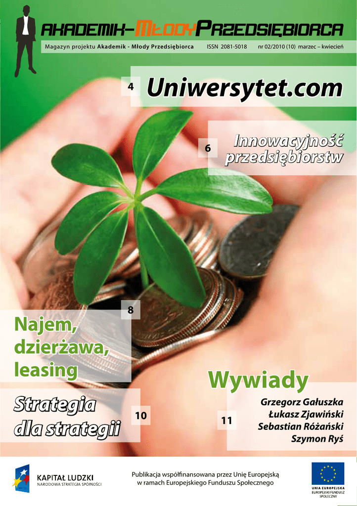 Akademik - Młody Przedsiębiorca AKADEMIK-MŁODYPRZEDSIĘBIORCA Magazyn projektu Akademik - Młody Przedsiębiorca 4 ISSN 2081-5018 Uniwersytet.com 6 Najem, dzierżawa, leasing Strategia dla strategii nr 02/2010 (10) marzec – kwiecień Innowacyjność przedsiębiorstw 8 Wywiady 10 11 Grzegorz Gałuszka Łukasz Zjawiński Sebastian Różański Szymon Ryś Publikacja współfinansowana przez Unię Europejską w ramach Europejskiego Funduszu Społecznego 1 Spis treści O nas Stowarzyszenie Przyjaciół Uniwersytetu Śląskiego jest wspólnotą ludzi z troską myślących o Uniwersytecie Śląskim. Jest to organizacja non-profit działająca na rzecz Uniwersytetu Śląskiego w Katowicach. Zebranie założycielskie odbyło się 25 lutego 1998 r., a 15 maja 1998 r. Sąd Wojewódzki w Katowicach wpisał Stowarzyszenie do rejestru stowarzyszeń. Stowarzyszenie włącza się pomocniczo w prace i inicjatywy Uniwersytetu, organizuje konferencje, mające na celu zwiększenie świadomości roli trzeciego sektora wśród studentów i akademików, „Celem Stowarzyszenia jest promowanie i upowszechnianie najważniejszych osiągnięć naukowych i dydaktycznych UŚ w regionie i w kraju, tworzenie lobby prouniwersyteckiego w środowiskach gospodarki i biznesu”. (§ 5. Statutu) Akademik - Młody Przedsiębiorca List powitalny Spis treści 02/ 10 Słowo od redakcji 3 Akademia sukcesu Uniwersytet.com 4 Innowacyjność przedsiębiorstw 6 Akademia Młodego Przedsiębiorcy Najem, dzierżawa, leasing 8 Słowood redakcji Trudno wyobrazić sobie nowoczesną firmę bez komputerów, samochodów dostawczych, czy wreszcie maszyn produkcyjnych. Jednak niewielu przedsiębiorców stać na ich zakup, czyli nabycie na własność. Kodeks cywilny przewiduje jednak możliwość zawarcia umów, które choć nie przenoszę od razu własności rzeczy, pozwalają na ich używanie. Zamiast więc kupować samochód czy komputer, można go wynajęć, wydzierżawić będą wzięć w leasing. Strategia dla strategii? 10 Inspiracja przez przykład Biznes to bardzo ciężka praca 11 …wywiad z Grzegorzem Gałuszką Jeśli wierzysz w siebie to jest szansa, że inni też uwierzą 14 …wywiad z Łukaszem Zjawińskim Trzeba myśleć przyszłościowo 16 …wywiad z Sebastianem Różańskim Własna firma to niezwykle ważna elastyczność czasowa 18 …wywiad z Szymonem Rysiem O projekcie 2 Akademik - Młody Przedsiębiorca 20 Najprzyjemniejszą rzeczą dotyczącą problemów jest fakt, że wiele z nich nie istnieje nigdzie z wyjątkiem wyobraźni Steve Allen Drogi Czytelniku! Wiosną wraz z przyrodą my także obudźmy się do życia. Może to nieco infantylne, gdy zestawiamy budzącą się do życia z zimowego uśpienia przyrodę z odradzaniem się w nas sił, chęci i energii do działania. Czy to jednak ważne, co zainspiruje nas do działania? Ważne, by miało na nas pozytywny wpływ i służyło dobremu. Możemy tworzyć w wyobraźni i wizualizować nasz własny wzrost. Co skłania rośliny, by rosnąć? Trudno znaleźć inną odpowiedz, niż ich natura. Podobnie w ludzką naturę wpisany jest rozwój i wzrost. Człowiek idealnie przystosowuje się do środowiska w jakim żyje i o ile kiedyś o stopniu rozwoju świadczyła jego siła czy sprawność fizyczna, tak w XXI wieku nabrał on innego znaczenia. Dziś rozwój to podnoszenie swoich kwalifikacji, zdobywanie wiedzy z co raz to nowych dziedzin, zdolność do jeszcze bardziej kreatywnego myślenia. Rozwój rozpatrywany z perspektywy przedsiębiorstwa, to wdrażanie innowacji, robienie czegoś sprawniej, lepiej dla pełniejsze- go zaspokojenia potrzeb. Rozważania na temat szeroko pojętego rozwoju oraz specjalizacji podejmuje Szymon Kołodziej w „Uniwersytet.com”. Pamiętajmy, że studia to taka wiosna naszego życia, czas na określenie kierunków wzrostu, rozkwitnięcia kwiatem dającym piękne owoce. Zdobywanie wiedzy to jednak nie wszystko, dziś elity tworzą ludzie, którzy nie tylko nabyli pewną wiedzę i umiejętności, ale ci, którzy potrafili ją wykorzystać w praktyce. Tak jak rośliny, by cieszyły oko są odpowiednio pielęgnowane, przycinane, tak samo i my nie możemy sobie pozwolić na niechlujność. By uniknąć „dzikiego wzrostu” należy mieć odpowiednią strategię, określony styl i sposób działania. O tym właśnie rozprawia w swoim tekście Zbigniew Kadłubek, a nasi rozmówcy dają praktyczne potwierdzenie tych słów. Życzymy Wam miłej lektury i owocnego wzrostu. Realizatorzy Jesteś żyjącym magnesem. To, co przyciągasz do swojego życia jest w harmonii z Twoimi dominującymi myślami. Brian Tracy 3 Akademia sukcesu Akademik - Młody Przedsiębiorca Uniwersytet.com Szymon Kołodziej Cechą mądrości jest nie postępować w sposób desperacki. Henry David Thoreau Dziś dominują dwa nurty postrzegania Uniwersytetu. Pierwsze podejście zakłada przekształcenie Uniwersytetu w dobrze prosperujące przedsiębiorstwo odpowiadające na potrzeby rynku, innowacyjnej gospodarki. Zwolennicy tak pojmowanej otwartości promują nową wizję uczelni, która ma się przyczynić do budowania dobrobytu. Drugi nurt nie zachwala „umiejętności znajdowania wiedzy”, ale jej umiłowanie. (zwolenników tej koncepcji określa się mianem „zamkniętych w murach uczelni”). Faktycznie jednak, uznają oni wyższość mądrości nad sprawnością. Czy Uniwersytet może odpowiadać na potrzeby rynku i jednocześnie faworyzować mądrość, a nie sprawność? Uniwersytet jest instytucją autonomiczną, pewną niszą funkcjonującą w danym miejscu. To spór między ludźmi tworzy Uniwersytet. Elity funkcjonujące w ramach społeczeństwa są nikim innym, jak właśnie najlepiej wykształconymi absolwentami Uniwersytetów, którzy potrafią się „odnaleźć”, czyli wykorzystać wiedzę, jaką nabyli podczas studiów. Należy zapomnieć o pełnej niezależności uczelni, bo Uniwersytet istnieje o tyle, o ile jest dyskutowany, wówczas staje się czę