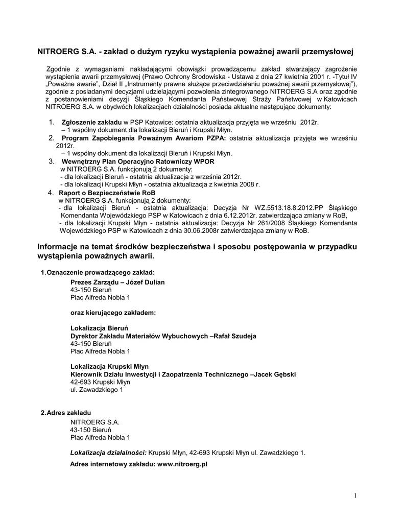 NITROERG S.A. - zakład o duŜym ryzyku wystąpienia powaŜnej awarii przemysłowej Zgodnie z wymaganiami nakładającymi obowiązki prowadzącemu zakład stwarzający zagroŜenie wystąpienia awarii przemysłowej (Prawo Ochrony Środowiska - Ustawa z dnia 27 kwietnia 2001 r. -Tytuł IV „PowaŜne awarie”, Dział II „Instrumenty prawne słuŜące przeciwdziałaniu powaŜnej awarii przemysłowej”), zgodnie z posiadanymi decyzjami udzielającymi pozwolenia zintegrowanego NITROERG S.A oraz zgodnie z postanowieniami decyzji Śląskiego Komendanta Państwowej StraŜy Państwowej w Katowicach NITROERG S.A. w obydwóch lokalizacjach działalności posiada aktualne następujące dokumenty: 1. Zgłoszenie zakładu w PSP Katowice: ostatnia aktualizacja przyjęta we wrześniu 2012r. – 1 wspólny dokument dla lokalizacji Bieruń i Krupski Młyn. 2. Program Zapobiegania PowaŜnym Awariom PZPA: ostatnia aktualizacja przyjęta we wrześniu 2012r. – 1 wspólny dokument dla lokalizacji Bieruń i Krupski Młyn. 3. Wewnętrzny Plan Operacyjno Ratowniczy WPOR w NITROERG S.A. funkcjonują 2 dokumenty: - dla lokalizacji Bieruń - ostatnia aktualizacja z września 2012r. - dla lokalizacji Krupski Młyn - ostatnia aktualizacja z kwietnia 2008 r. 4. Raport o Bezpieczeństwie RoB w NITROERG S.A. funkcjonują 2 dokumenty: - dla lokalizacji Bieruń - ostatnia aktualizacja: Decyzja Nr WZ.5513.18.8.2012.PP Śląskiego Komendanta Wojewódzkiego PSP w Katowicach z dnia 6.12.2012r. zatwierdzająca zmiany w RoB, - dla lokalizacji Krupski Młyn - ostatnia aktualizacja: Decyzja Nr 261/2008 Śląskiego Komendanta Wojewódzkiego PSP w Katowicach z dnia 30.06.2008r zatwierdzająca zmiany w RoB. Informacje na temat środków bezpieczeństwa i sposobu postępowania w przypadku wystąpienia powaŜnych awarii. 1. Oznaczenie prowadzącego zakład: Prezes Zarządu – Józef Dulian 43-150 Bieruń Plac Alfreda Nobla 1 oraz kierującego zakładem: Lokalizacja Bieruń Dyrektor Zakładu Materiałów Wybuchowych –Rafał Szudeja 43-150 Bieruń Plac Alfreda Nobla 1 Lokalizacja Krupski Młyn Kierownik Działu Inwestycji i Zaopatrzenia Technicznego –Jacek Gębski 42-693 Krupski Młyn ul. Zawadzkiego 1 2. Adres zakładu NITROERG S.A. 43-150 Bieruń Plac Alfreda Nobla 1 Lokalizacja działalności: Krupski Młyn, 42-693 Krupski Młyn ul. Zawadzkiego 1. Adres internetowy zakładu: www.nitroerg.pl 1 3. Charakter prowadzonej działalności NITROERG SA. Przedmiotem działalności zakładu jest m.in. produkcja: • materiałów wybuchowych; • chemikaliów nieorganicznych i organicznych; oraz • świadczenie usług związanych z działalnością produkcyjną; • prace badawczo – rozwojowe; • działalność w zakresie inŜynierii i związane z nią doradztwo techniczne; • świadczenie usług transportowych, remontowych; • gospodarowanie odpadami; • odzysk i unieszkodliwiania odpadów; • import i eksport towarów i usług; • prowadzenie działalności handlowej w kraju i zagranicą. Szczegółowy opis działalności zawiera KRS z dnia 28.04.2011r stanowiący załącznik do niniejszego pisma. 4. Rodzaj instalacji funkcjonujących w NITROERG S.A. –lokalizacja Krupski Młyn: 1. Instalacje do wytwarzania, przy zastosowaniu procesów chemicznych, podstawowych produktów lub półproduktów chemii organicznej: • Instalacja do produkcji mieszanek nitrogliceryny z nitroglikolem; • Instalacja do produkcji azotanu izooktylu. 2. Instalacja do odzysku odpadów niebezpiecznych o zdolności przetwarzania 50 ton na dobę: • Instalacja denitracji kwasów ponitracyjnych. 3. Instalacje do wytwarzania, przy zastosowaniu procesów chemicznych, materiałów wybuchowych: • Instalacja do produkcji azydku ołowiu; • Instalacja do produkcji dwunitroortokrezolanu ołowiu, tzw. DNOKO; • Instalacja do produkcji trójnitrorezorcynianu ołowiu, tzw. TNRO. 4. Instalacja do produkcji materiałów wybuchowych nitroglicerynowych. 5. Instalacja do produkcji materiałów wybuchowych amonowosaletrzanych. 6. Instalacja do produkcji lontów. 7. Instalacja do produkcji zapalników. 8. Instalacja poboru wody ze studni głębinowych. 9. Instalacja oczyszczania i odprowadzania ścieków. 10. Instalacja energetycznego spalania paliw – kotłownie. 2 Lokalizacja Bieruń 11. Instalacja do produkcji materiałów wybuchowych (GMW). 12. Instalacja do produkcji środków strzałowych (górnicze zapalniki elektryczne i nieelektryczne). 13. Instalacja poboru wody ze studni głębinowych. 14. Instalacja oczyszczania i odprowadzania ścieków. 15. Instalacja energetycznego spalania paliw – kotłownie. 5. Funkcjonujące systemy zabezpieczeń: Instalacje wraz z ich infrastrukturą są zabezpieczone na wypadek zaistnienia powaŜnej awarii przemysłowej zgodnie z obowiązującymi przepisami, poprzez: przechowywanie i magazynowanie surowców w pomieszczeniach magazynowych wyposaŜonych w wentylację naturalną bądź mechaniczną; przechowywanie i magazynowanie substancji i preparatów niebezpiecznych zgodnie z zaleceniami producentów (Karty charakterystyki); określone strefy zagroŜenia wybuchem; wyposaŜenie instalacji w detektory i układy blokujące; zabezpieczenie przed elektrycznością statyczną; przestrzeganie normatywów obładowania magazynowanych surowców i wyrobów; prowadzenie bieŜącego monitoringu procesu produkcyjnego (prawidłowość przebiegu procesu); zabezpieczenia wstrzymujące proces produkcji w przypadku zakłóceń procesu; moŜliwość natychmiastowego wyłączenia instalacji; zabezpieczenia konstrukcyjne obiektów (obwałowania, ściany oporowe); stosowanie urządzeń iskrobezpiecznych; stosowanie instalacji elektrycznej i oświetleniowej odpowiedniej do obiektów zagroŜonych wybuchem; stosowanie uziemień urządzeń; przestrzeganie normatywów materiałowych i osobowych ograniczających ilość materiału wybuchowego w obiektach oraz ilość obsługi; system szkoleń i badań psychotechnicznych obsługi, szczelne tace bezpiecze
