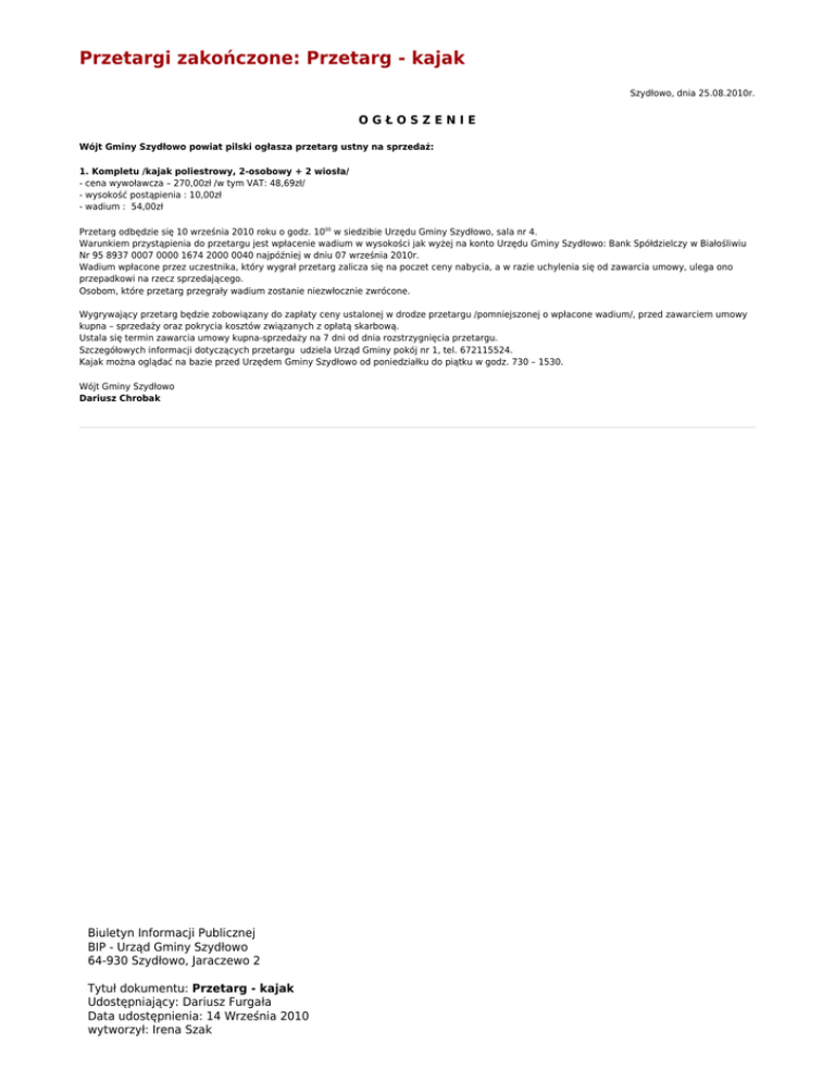 Przetargi zakończone: Przetarg - kajak Szydłowo, dnia 25.08.2010r. OGŁOSZENIE Wójt Gminy Szydłowo powiat pilski ogłasza przetarg ustny na sprzedaż: 1. Kompletu /kajak poliestrowy, 2-osobowy + 2 wiosła/ - cena wywoławcza – 270,00zł /w tym VAT: 48,69zł/ - wysokość postąpienia : 10,00zł - wadium : 54,00zł Przetarg odbędzie się 10 września 2010 roku o godz. 1000 w siedzibie Urzędu Gminy Szydłowo, sala nr 4. Warunkiem przystąpienia do przetargu jest wpłacenie wadium w wysokości jak wyżej na konto Urzędu Gminy Szydłowo: Bank Spółdzielczy w Białośliwiu Nr 95 8937 0007 0000 1674 2000 0040 najpóźniej w dniu 07 września 2010r. Wadium wpłacone przez uczestnika, który wygrał przetarg zalicza się na poczet ceny nabycia, a w razie uchylenia się od zawarcia umowy, ulega ono przepadkowi na rzecz sprzedającego. Osobom, które przetarg przegrały wadium zostanie niezwłocznie zwrócone. Wygrywający przetarg będzie zobowiązany do zapłaty ceny ustalonej w drodze przetargu /pomniejszonej o wpłacone wadium/, przed zawarciem umowy kupna – sprzedaży oraz pokrycia kosztów związanych z opłatą skarbową. Ustala się termin zawarcia umowy kupna-sprzedaży na 7 dni od dnia rozstrzygnięcia przetargu. Szczegółowych informacji dotyczących przetargu udziela Urząd Gminy pokój nr 1, tel. 672115524. Kajak można oglądać na bazie przed Urzędem Gminy Szydłowo od poniedziałku do piątku w godz. 730 – 1530. Wójt Gminy Szydłowo Dariusz Chrobak Biuletyn Informacji Publicznej BIP - Urząd Gminy Szydłowo 64-930 Szydłowo, Jaraczewo 2 Tytuł dokumentu: Przetarg - kajak Udostępniający: Dariusz Furgała Data udostępnienia: 14 Września 2010 wytworzył: Irena Szak