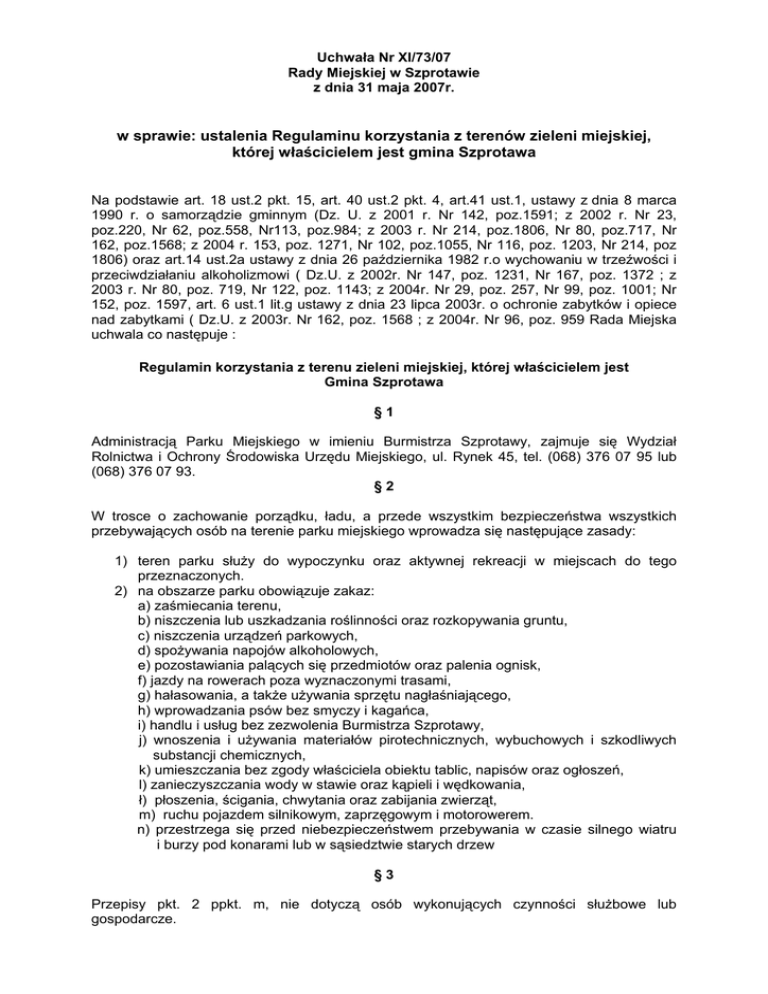 Uchwała Nr XI/73/07 Rady Miejskiej w Szprotawie z dnia 31 maja 2007r. w sprawie: ustalenia Regulaminu korzystania z terenów zieleni miejskiej, której właścicielem jest gmina Szprotawa Na podstawie art. 18 ust.2 pkt. 15, art. 40 ust.2 pkt. 4, art.41 ust.1, ustawy z dnia 8 marca 1990 r. o samorządzie gminnym (Dz. U. z 2001 r. Nr 142, poz.1591; z 2002 r. Nr 23, poz.220, Nr 62, poz.558, Nr113, poz.984; z 2003 r. Nr 214, poz.1806, Nr 80, poz.717, Nr 162, poz.1568; z 2004 r. 153, poz. 1271, Nr 102, poz.1055, Nr 116, poz. 1203, Nr 214, poz 1806) oraz art.14 ust.2a ustawy z dnia 26 października 1982 r.o wychowaniu w trzeźwości i przeciwdziałaniu alkoholizmowi ( Dz.U. z 2002r. Nr 147, poz. 1231, Nr 167, poz. 1372 ; z 2003 r. Nr 80, poz. 719, Nr 122, poz. 1143; z 2004r. Nr 29, poz. 257, Nr 99, poz. 1001; Nr 152, poz. 1597, art. 6 ust.1 lit.g ustawy z dnia 23 lipca 2003r. o ochronie zabytków i opiece nad zabytkami ( Dz.U. z 2003r. Nr 162, poz. 1568 ; z 2004r. Nr 96, poz. 959 Rada Miejska uchwala co następuje : Regulamin korzystania z terenu zieleni miejskiej, której właścicielem jest Gmina Szprotawa §1 Administracją Parku Miejskiego w imieniu Burmistrza Szprotawy, zajmuje się Wydział Rolnictwa i Ochrony Środowiska Urzędu Miejskiego, ul. Rynek 45, tel. (068) 376 07 95 lub (068) 376 07 93. §2 W trosce o zachowanie porządku, ładu, a przede wszystkim bezpieczeństwa wszystkich przebywających osób na terenie parku miejskiego wprowadza się następujące zasady: 1) teren parku służy do wypoczynku oraz aktywnej rekreacji w miejscach do tego przeznaczonych. 2) na obszarze parku obowiązuje zakaz: a) zaśmiecania terenu, b) niszczenia lub uszkadzania roślinności oraz rozkopywania gruntu, c) niszczenia urządzeń parkowych, d) spożywania napojów alkoholowych, e) pozostawiania palących się przedmiotów oraz palenia ognisk, f) jazdy na rowerach poza wyznaczonymi trasami, g) hałasowania, a także używania sprzętu nagłaśniającego, h) wprowadzania psów bez smyczy i kagańca, i) handlu i usług bez zezwolenia Burmistrza Szprotawy, j) wnoszenia i używania materiałów pirotechnicznych, wybuchowych i szkodliwych substancji chemicznych, k) umieszczania bez zgody właściciela obiektu tablic, napisów oraz ogłoszeń, l) zanieczyszczania wody w stawie oraz kąpieli i wędkowania, ł) płoszenia, ścigania, chwytania oraz zabijania zwierząt, m) ruchu pojazdem silnikowym, zaprzęgowym i motorowerem. n) przestrzega się przed niebezpieczeństwem przebywania w czasie silnego wiatru i burzy pod konarami lub w sąsiedztwie starych drzew §3 Przepisy pkt. 2 ppkt. m, nie dotyczą osób wykonujących czynności służbowe lub gospodarcze. §4 Turystyka konna dozwolona jest po wyznaczonych trasach, za zgodą Burmistrza Szprotawy. §5 Organizowanie imprez masowych jest dopuszczalne jedynie za zgodą i na warunkach uzgodnionych z Burmistrzem Szprotawy. §6 Naruszenie postanowień regulaminu podlega karze wymierzanej w trybie i na zasadach określonych w Kodeksie postępowania w sprawach o wykroczeniach. §7 Niniejszy regulamin ma zastosowanie na obszarach: 1. Parku Miejskiego przy ul. Ogrodowej wraz z terenami przyległymi w Świerczewskiego i Mickiewicza. 2. Parku Miejskiego przy ul. Basztowej wraz z terenami przyległymi w Mickiewicza i Traugutta. 3. Parku Miejskiego przy ul. Bronka Kozaka wraz z terenami przyległymi w Traugutta. 4. Parku Miejskiego przy ul. Głogowskiej wraz z terenami przyległymi w Bronka Kozaka, Kochanowskiego i Kopernika. 5. Parku Miejskiego przy ul. Kościuszki wraz z terenami przyległymi. 6. Parku Miejskiego przy ul. Niepodległości wraz z terenami przyległymi. 7. Parku Miejskiego przy ul. 3-Maja, wraz z terenami przyległymi. 8. Parku Miejskiego przy ul. Henrykowskiej, wraz z terenami przyległymi w Ceglanej. granicach ulic: granicach ulic: granicach ulicy granicach ulic: granicach ulicy §8 Regulamin korzystania z terenów zieleni miejskiej winien być umieszczony na tablicach informacyjnych. §9 Wykonanie uchwały powierza się Burmistrzowi Szprotawy. § 10 Uchwała podlega ogłoszeniu w Dzienniku Urzędowym Województwa Lubuskiego i wchodzi w życie po upływie 14 dni od dnia ogłoszenia. Przewodniczący Rady /-/ Jan Chmielewski UZASADNIENIE W trosce o bezpieczeństwo użytkowników parków miejskich oraz w związku z tym, że w ostatnim czasie coraz częściej dewastowane są urządzenia parkowe, budynki i budowle koniecznym jest wprowadzenie regulaminu korzystania z Parków Miejskich przy ulicach Ogrodowej, Basztowej, Bronka Kozaka, Głogowskiej, Kościuszki, Niepodległości, 3-Maja, Henrykowskiej. Wprowadzenie regulaminu ułatwi Policji egzekwowanie zachowania ładu i porządku na terenie Parków Miejskich. W związku z tym wnoszę o przyjęcie wspomnianej uchwały. Szprotawa, dnia 18 maja 2007 r JR/JR