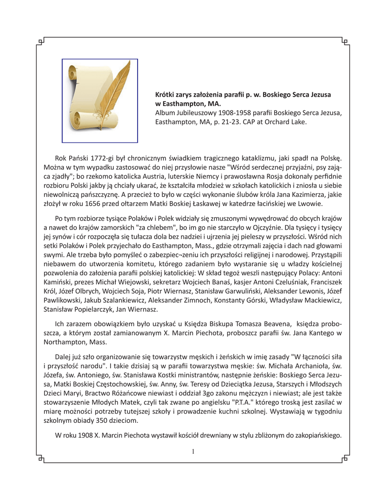 Krótki zarys założenia parafii p. w. Boskiego Serca Jezusa w Easthampton, MA. Album Jubileuszowy 1908-1958 parafii Boskiego Serca Jezusa, Easthampton, MA, p. 21-23. CAP at Orchard Lake. Rok Pański 1772-gi był chronicznym świadkiem tragicznego kataklizmu, jaki spadł na Polskę. Można w tym wypadku zastosować do niej przysłowie nasze "Wśród serdecznej przyjaźni, psy zająca zjadły"; bo rzekomo katolicka Austria, luterskie Niemcy i prawosławna Rosja dokonały perfidnie rozbioru Polski jakby ją chciały ukarać, że kształciła młodzież w szkołach katolickich i zniosła u siebie niewolniczą pańszczyznę. A przecież to było w części wykonanie ślubów króla Jana Kazimierza, jakie złożył w roku 1656 przed ołtarzem Matki Boskiej Łaskawej w katedrze łacińskiej we Lwowie. Po tym rozbiorze tysiące Polaków i Polek widziały się zmuszonymi wywędrować do obcych krajów a nawet do krajów zamorskich "za chlebem", bo im go nie starczyło w Ojczyźnie. Dla tysięcy i tysięcy jej synów i cór rozpoczęła się tułacza dola bez nadziei i ujrzenia jej pieleszy w przyszłości. Wśród nich setki Polaków i Polek przyjechało do Easthampton, Mass., gdzie otrzymali zajęcia i dach nad głowami swymi. Ale trzeba było pomyśleć o zabezpiec¬zeniu ich przyszłości religijnej i narodowej. Przystąpili niebawem do utworzenia komitetu, którego zadaniem było wystaranie się u władzy kościelnej pozwolenia do założenia parafii polskiej katolickiej: W skład tegoż weszli następujący Polacy: Antoni Kamiński, prezes Michał Wiejowski, sekretarz Wojciech Banaś, kasjer Antoni Czeluśniak, Franciszek Król, Józef Olbrych, Wojciech Soja, Piotr Wiernasz, Stanisław Garwuliński, Aleksander Lewonis, Józef Pawlikowski, Jakub Szalankiewicz, Aleksander Zimnoch, Konstanty Górski, Władysław Mackiewicz, Stanisław Popielarczyk, Jan Wiernasz. Ich zarazem obowiązkiem było uzyskać u Księdza Biskupa Tomasza Beavena, księdza proboszcza, a którym został zamianowanym X. Marcin Piechota, proboszcz parafii św. Jana Kantego w Northampton, Mass. Dalej już szło organizowanie się towarzystw męskich i żeńskich w imię zasady "W łączności siła i przyszłość narodu". I takie dzisiaj są w parafii towarzystwa męskie: św. Michała Archanioła, św. Józefa, św. Antoniego, św. Stanisława Kostki ministrantów, następnie żeńskie: Boskiego Serca Jezusa, Matki Boskiej Częstochowskiej, św. Anny, św. Teresy od Dzieciątka Jezusa, Starszych i Młodszych Dzieci Maryi, Bractwo Różańcowe niewiast i oddział 3go zakonu mężczyzn i niewiast; ale jest także stowarzyszenie Młodych Matek, czyli tak zwane po angielsku "P.T.A." którego troską jest zasilać w miarę możności potrzeby tutejszej szkoły i prowadzenie kuchni szkolnej. Wystawiają w tygodniu szkolnym obiady 350 dzieciom. W roku 1908 X. Marcin Piechota wystawił kościół drewniany w stylu zbliżonym do zakopiańskiego. 1 Niestety w kilkadziesiąt lat potem zostały rozebrane dymniki, które były jego atrakcją. W tym roku objął rządy proboszcza X. Jan Mard lwowianin, on też wystawił plebanię. Po nim w rok potem przyszedł X. Wacław Lenz, rodem Czech, ale nie zdradzał wrogiego nastroju szowinizmu i czuł się, jako Polak wśród parafian. Niestety! Nie mógł rozwinąć akcji gospodarczej, bo był chorowity. Jemu X. Bp. Tomasz Beaven przydzielił na wikarego księdza Bartłomieja Sławińskiego, który, gdy X. Wacław Lenz umarł 8 grudnia, 1914 r., objął po nim rządy parafii, naturalnie, z rozporządzenia Księdza Biskupa Tomasza O'Learego. Po 10-ciu latach w skutek przepracowania się ustąpił ze stanowiska swego, a przyszedł na jego stanowisko X. Andrzej Lekarczyk z ustanowienia tegoż Księdza Biskupa, ale po 10ciu latach swych rządów przeniesiony został w tym samym charakterze do Webster, Mass. W roku 1935, dnia 27 lipca zamianował X. Biskup Tomasz O'Leary proboszczem Księdza Stanisława Zdebel, który mimo rozczarowania, jakiego tu doznał, nie opuścił rąk, lecz "zakasał rękawy" i wziął się do pracy pasterskiej i gospodarczej. Nie szła mu ona gładko, ale przy pomocy Boskiego Serca Jezusa i dobrej woli troskliwych parafian prowadził dalej szkołę, która miała być zamkniętą z roku 1935go na 1936ty. Prowadziły ją i prowadzą ją po dziś dzień Wielebne Siostry Felicjanki. Jest to praca nie lada wychowywać cudze dzieci i urabiać je do życia katolickiego i narodowego. Tu wymagalną jest współpraca rodziców, którzy często od niej się uchylają, nie wiedząc, że w ten sposób wyrządzają im krzywdę moralną. A jednak tak jest. Prawda, była tu wielka depresja w tym okresie, nie brakło jednak parafian, którzy, jak mówi nasze przysłowie "jagodą dzielili się z księdzem proboszczem”; dzięki tym wysiłkom zdołał X. Proboszcz wypłacić dług parafialny, choć padały głosy z ust nie życzliwych, że nigdy się nie uda Księdzu proboszczowi wypłacić go. Zadał kłam im swoją ufnością w życzliwość parafian i przystąpił w roku 1952 do odmalowania kościoła wewnątrz i zewnątrz, które kosztowało przeszło 23 tysiące dolarów. Nie było nałożonego na nas żadnego podatku tylko składaliśmy dobrowolne datki. W skutek tego, że dach kościelny swym ciężarem rozepchnął obie ściany kościoła na kilka cali, konieczność doraźna, jak orzekli architekt p. A.Roy i p. Mieczysław Bożek, kontraktor, wymagała, żeby pod tymi ścianami postawić filary lub je ściągnąć ankrami. Pierwsza propozycja została przyjęta i filary te ujęte zostały w ściany boczne i nakryte zostały dachami. W skutek tej struktury nabrały wyglądu kaplic bocznych, które upiększyły kościół a nadto usunęły monotonność długości kościoła, same zaś kaplice znalazły tu wielkie zastosowanie; bo jedna z nich przeznaczona została na kaplicę Najświętszej Maryi Panny Niepokalanie Poczętej i w niej umieszczona została chrzcielnica, która do te