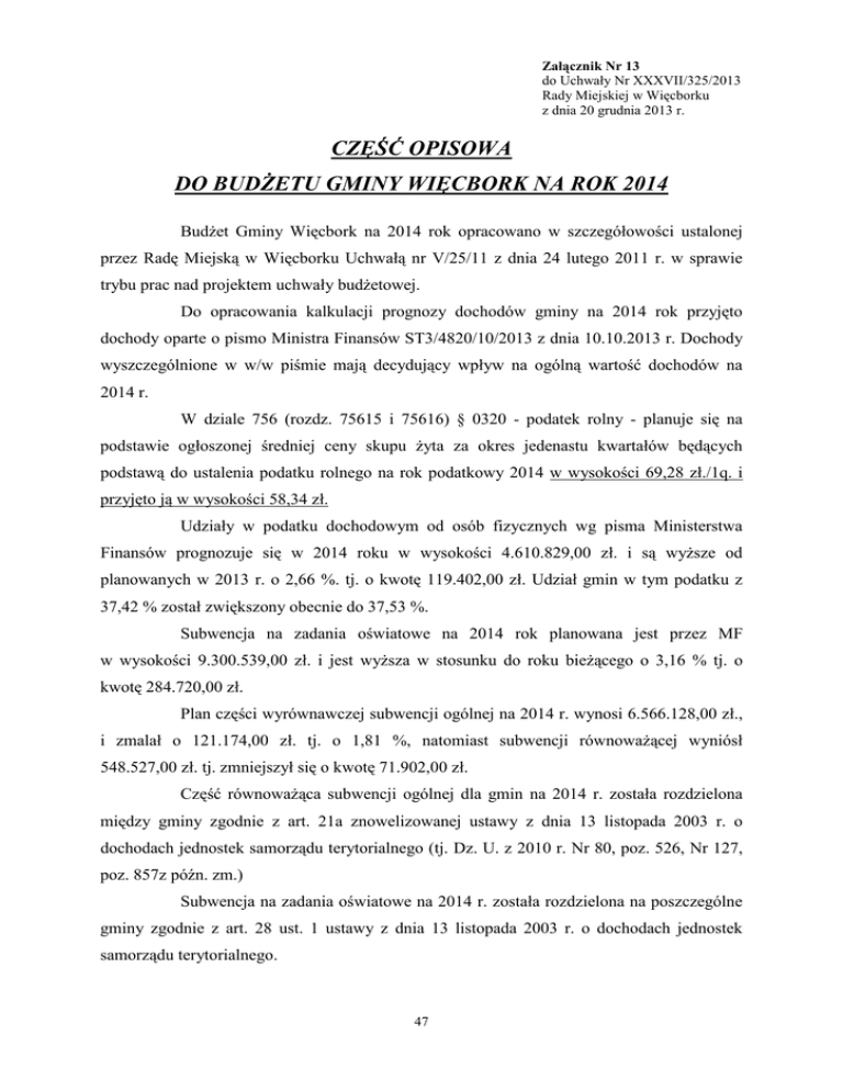 Załącznik Nr 13 do Uchwały Nr XXXVII/325/2013 Rady Miejskiej w Więcborku z dnia 20 grudnia 2013 r. CZĘŚĆ OPISOWA DO BUDŻETU GMINY WIĘCBORK NA ROK 2014 Budżet Gminy Więcbork na 2014 rok opracowano w szczegółowości ustalonej przez Radę Miejską w Więcborku Uchwałą nr V/25/11 z dnia 24 lutego 2011 r. w sprawie trybu prac nad projektem uchwały budżetowej. Do opracowania kalkulacji prognozy dochodów gminy na 2014 rok przyjęto dochody oparte o pismo Ministra Finansów ST3/4820/10/2013 z dnia 10.10.2013 r. Dochody wyszczególnione w w/w piśmie mają decydujący wpływ na ogólną wartość dochodów na 2014 r. W dziale 756 (rozdz. 75615 i 75616) § 0320 - podatek rolny - planuje się na podstawie ogłoszonej średniej ceny skupu żyta za okres jedenastu kwartałów będących podstawą do ustalenia podatku rolnego na rok podatkowy 2014 w wysokości 69,28 zł./1q. i przyjęto ją w wysokości 58,34 zł. Udziały w podatku dochodowym od osób fizycznych wg pisma Ministerstwa Finansów prognozuje się w 2014 roku w wysokości 4.610.829,00 zł. i są wyższe od planowanych w 2013 r. o 2,66 %. tj. o kwotę 119.402,00 zł. Udział gmin w tym podatku z 37,42 % został zwiększony obecnie do 37,53 %. Subwencja na zadania oświatowe na 2014 rok planowana jest przez MF w wysokości 9.300.539,00 zł. i jest wyższa w stosunku do roku bieżącego o 3,16 % tj. o kwotę 284.720,00 zł. Plan części wyrównawczej subwencji ogólnej na 2014 r. wynosi 6.566.128,00 zł., i zmalał o 121.174,00 zł. tj. o 1,81 %, natomiast subwencji równoważącej wyniósł 548.527,00 zł. tj. zmniejszył się o kwotę 71.902,00 zł. Część równoważąca subwencji ogólnej dla gmin na 2014 r. została rozdzielona między gminy zgodnie z art. 21a znowelizowanej ustawy z dnia 13 listopada 2003 r. o dochodach jednostek samorządu terytorialnego (tj. Dz. U. z 2010 r. Nr 80, poz. 526, Nr 127, poz. 857z późn. zm.) Subwencja na zadania oświatowe na 2014 r. została rozdzielona na poszczególne gminy zgodnie z art. 28 ust. 1 ustawy z dnia 13 listopada 2003 r. o dochodach jednostek samorządu terytorialnego. 47 Wydatki rzeczowe na 2014 rok proponuje się w wysokości tj. 102 % wydatków 2013 r. Wzrost płac planuje się w wysokości tj. 104 % wydatków 2013 r. powiększoną o kwotę niezbędną na pokrycie wzrostu zatrudnienia, wzrostu dodatku za wysługę oraz wynagrodzeń wynikających z nagród jubileuszowych. Dochody na 2014 rok skalkulowano w wysokości 39.362.577,63 zł. Wydatki na 2014 rok skalkulowano w wysokości 42.030.872,85 zł. W 2014 roku planuje się spłacić pobrane pożyczki z WFOŚiGW w Toruniu w wysokości 274.000,00 zł., kredyt w Banku Ochrony Środowiska w Bydgoszczy w wysokości 660.000,00 zł., kredyt z Banku Spółdzielczego w Bydgoszcz w wysokości 6.000,00 zł. Ponadto planuje się zaciągnąć kredyt w wysokości 2.536.792,27 zł. oraz pożyczkę z WFOŚiGW w Toruniu w wysokości 323.955,00 zł. DZIAŁ 010 – ROLNICTWO I ŁOWIECTWO Dochody w tym dziale planuje się w wysokości 10.000,00 zł. z tytułu: dzierżaw obwodów łowieckich Wydatki w tym dziale planuje się w wysokości 43.100,00 zł. Rozdział 01030 – Izby rolnicze Wydatki w tym rozdziale planuje się w wysokości 25.000,00 zł., są to wpłaty gmin na rzecz izb rolniczych w wysokości 2 % uzyskanych wpływów z podatku rolnego. Rozdział 01095 – Pozostała działalność Dochody w tym rozdziale planuje się w wysokości 10.000,00 zł., są to dochody z dzierżawy terenów łowieckich Wydatki w tym rozdziale planuje się w wysokości 18.100,00 zł., przeznaczone będą na: − prenumeratę czasopism specjalistycznych, konkurs estetyka zagród wiejskich, dożynki, targi rolnicze – 8.000,00 zł. − badania gleby, transport na targi rolnicze – 3.400,00 zł. − składkę na lokalna grupę rybacką – 6.700,00 zł. DZIAŁ 050 – RYBOŁÓWSTWO I RYBACTWO Dochody w tym dziale planuje się w wysokości 230.950,00 zł. Wydatki w tym dziale planuje się w wysokości 260.000,00 zł. 48 Rozdział 05011– Program Operacyjny Zrównoważony rozwój sektora rybołówstwa i nadbrzeżnych obszarów rybackich 2007–2013 Dochody w tym rozdziale planuje się w wysokości 230.950,00 zł. są to środki unijne na wykonanie następujących zadań pn.: − Przebudowa, remont pomostu oraz remont budynku hangaru służącego wędkarstwu, rekreacji i turystyce ogólnodostępnej wraz z jego wyposażeniem – 175.700,00 zł. − Budowa łowiska wędkarskiego przy Jeziorze Gardzinowo w Lubczy – 55.250,00 zł. Wydatki w tym rozdziale planuje się w wysokości 260.000,00 zł. są to wydatki inwestycyjne na: − Przebudowa, remont pomostu oraz remont budynku hangaru służącego wędkarstwu, rekreacji i turystyce ogólnodostępnej wraz z jego wyposażeniem – 260.000,00 zł. − − − § 6050 – 5.728,80 zł. § 6057 – 175.700,00 zł. § 6059 – 78.571,20 zł. DZIAŁ 600 – TRANSPORT I ŁĄCZNOŚĆ Dochody w tym dziale planuje się w wysokości 290.989,26 zł. Wydatki w tym dziale planuje się w wysokości 2.078.774,97 zł. Rozdział 60014 – Drogi publiczne powiatowe Wydatki w tym rozdziale planuje się w wysokości 90.000,00 zł. Jest to dotacja celowa na pomoc finansową udzieloną jst na wykonanie zadań inwestycyjnych pn.: − Przebudowa drogi powiatowej nr 1125 C relacji Sypniewo - Borzyszkowo na odcinku Lubcza Borzyszkowo – 55.000,00 zł. − Budowa chodnika we wsi Jastrzębiec (fundusz sołecki – 5.000,00 zł.) – 25.000,00 zł. − I etap budowy parkingu przy Centrum Kształcenia Zawodowego i Ustawicznego w Więcborku – 10.000,00 zł. Rozdział 60016 – Drogi publiczne gminne Dochody w tym rozdziale planuje się w wysokości 290.989,26 zł. są to: − środki unijne na inwestycje pn.: „Przebudowa oraz podniesienie standardu przestrzeni rynku miejskiego oraz części ciągu spacerowego (promenady) w Więcborku oraz zagospodarowanie i uporządkowanie terenów zieleni Placu Jana Pawła II z wyposażeniem w ele