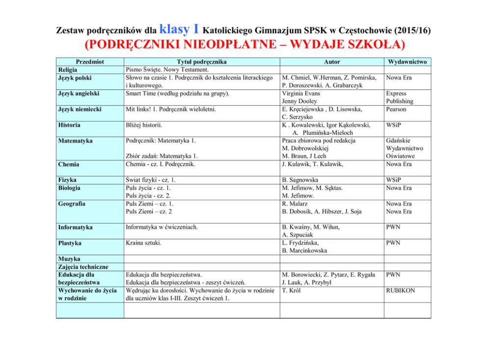 Zestaw podręczników dla klasy I Katolickiego Gimnazjum SPSK w Częstochowie (2015/16) (PODRĘCZNIKI NIEODPŁATNE – WYDAJE SZKOŁA) Język angielski Tytuł podręcznika Pismo Święte. Nowy Testament. Słowo na czasie 1. Podręcznik do kształcenia literackiego i kulturowego. Smart Time (według podziału na grupy). Język niemiecki Mit links! 1. Podręcznik wieloletni. Historia Bliżej historii. Matematyka Podręcznik: Matematyka 1. Chemia Zbiór zadań: Matematyka 1. Chemia - cz. I. Podręcznik. M. Chmiel, W.Herman, Z. Pomirska, P. Doroszewski. A. Grabarczyk Virginia Evans Jenny Dooley E. Kręciejewska , D. Lisowska, C. Serzysko K . Kowalewski, Igor Kąkolewski, A. Plumińska-Mieloch Praca zbiorowa pod redakcja M. Dobrowolskiej M. Braun, J Lech J. Kulawik, T. Kulawik, Świat fizyki - cz. 1. Puls życia - cz. 1. Puls życia - cz. 2. Puls Ziemi – cz. 1. Puls Ziemi – cz. 2 B. Sagnowska M. Jefimow, M. Sęktas. M. Jefimow. R. Malarz B. Dobosik, A. Hibszer, J. Soja WSiP Nowa Era Informatyka Informatyka w ćwiczeniach. PWN Plastyka Kraina sztuki. B. Kwaśny, M. Wiłun, A. Szpuciak L. Frydzińska, B. Marcinkowska Muzyka Zajęcia techniczne Edukacja dla bezpieczeństwa Wychowanie do życia w rodzinie Edukacja dla bezpieczeństwa. Edukacja dla bezpieczeństwa - zeszyt ćwiczeń. Wędrując ku dorosłości. Wychowanie do życia w rodzinie dla uczniów klas I-III. Zeszyt ćwiczeń 1. M. Borowiecki, Z. Pytarz, E. Rygała J. Lauk, A. Przybył T. Król PWN Przedmiot Religia Język polski Fizyka Biologia Geografia Autor Wydawnictwo Nowa Era Express Publishing Pearson WSiP Gdańskie Wydawnictwo Oświatowe Nowa Era Nowa Era Nowa Era PWN RUBIKON Zestaw podręczników dla klasy II Katolickiego Gimnazjum SPSK w Częstochowie (2015/16) Język niemiecki Tytuł podręcznika Podręcznik wskazany w miesiącu wrześniu. Słowo na czasie 2. Podręcznik do kształcenia literackiego i kulturowego. Słowo na czasie 2. Podręcznik do kształcenia języka z ćwiczeniami. Grupa 1: Voices 3. Grupa 2: Voices 4. (ze względu na zmiany w grupach podręczniki należy zakupić we wrześniu) Mit links! 2 Podręcznik z ćwiczeniami. Historia WOS Matematyka Historia 2. Wiedza o społeczeństwie 1. Podręcznik: Matematyka 2. Przedmiot Religia Język polski Język angielski Chemia Fizyka Biologia Geografia Informatyka Zajęcia techniczne Wychowanie do życia w rodzinie Zbiór zadań: Matematyka 2. Chemia - cz. I, II. Podręcznik. Zeszyt ćwiczeń - cz. I i II. Świat fizyki - cz. 2. Puls życia. Cz. 2. Puls Ziemi – cz. 2. Zeszyt ćwiczeń. Puls Ziemi – cz. 3. Zeszyt ćwiczeń. Informatyka w ćwiczeniach. Zajęcia techniczne – podręcznik (kontynuacja). Zajęcia techniczne - zeszyt ćwiczeń (Zajęcia komunikacyjne). Wędrując ku dorosłości. Wychowanie do życia w rodzinie dla uczniów klas I-III (kontynuacja). Zeszyt ćwiczeń 2. Autor Wydawnictwo M. Chmiel, W.Herman, Z. Pomirska, P. Doroszewski. W. Herman Nowa Era C. McBeth C. McBeth Macmillan E. Kręciejewska , B. Sekulski, C. Serzysko J. Ustrzycki Pearson E. Dobrzycka, K. Makara Operon Praca zbiorowa pod redakcja M. Dobrowolskiej M. Braun, J Lech J. Kulawik, T. Kulawik, M. Litwin B. Sagnowska M. Jefimow B. Dobosik, J. Soja R. Malarz B. Kwaśny, M. Wiłun, A. Szpuciak U. Białka M. Rybarska Gdańskie Wydawnictwo Oświatowe Nowa Era T. Król RUBIKON Operon ZamKor Nowa Era Nowa Era PWN Operon Zestaw podręczników dla klasy III Katolickiego Gimnazjum SPSK w Częstochowie (2015/16) Język angielski Język niemiecki Tytuł podręcznika Podręcznik wskazany w miesiącu wrześniu. Słowo na czasie 3. Podręcznik do kształcenia literackiego i kulturowego. Słowo na czasie 3. Podręcznik do kształcenia języka z ćwiczeniami. Repetytorium gimnazjalne. Mit links! 3. Podręcznik z ćwiczeniami. Historia WOS Matematyka Historia 3. Wiedza o społeczeństwie 2. Podręcznik: Matematyka 3. Przedmiot Religia Język polski Fizyka Biologia Zbiór zadań: Matematyka 3. Chemia - cz. II i III. Podręcznik. Zeszyt ćwiczeń - cz. II i III. Świat fizyki - cz. 3. Biologia – cz.3. Podręcznik dla gimnazjum. Geografia Wychowanie do życia w rodzinie Puls Ziemi – cz. 3. Zeszyt ćwiczeń. Wędrując ku dorosłości. Wychowanie do życia w rodzinie dla uczniów klas I-III (kontynuacja). Zeszyt ćwiczeń 3. Chemia Autor Wydawnictwo M. Chmiel, W.Herman, Z. Pomirska, P. Doroszewski. W. Herman Nowa Era R. Fricker, J. Gaszewski E. Kręciejewska, B. Sekulski, C. Serzysko J. Ustrzycki J. Ustrzycki Praca zbiorowa pod redakcja M. Dobrowolskiej M. Braun, J Lech J. Kulawik, T. Kulawik, M. Litwin B. Sagnowska J. Loritz - Dobrowolska, E. Wierbiłowicz, Z. Sendecka, E. Szedzianis. R. Malarz T. Król Longman Pearson Operon Operon Gdańskie Wydawnictwo Oświatowe Nowa Era ZamKor Operon Nowa Era RUBIKON