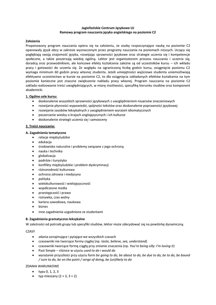 Jagiellońskie Centrum Językowe UJ Ramowy program nauczania języka angielskiego na poziomie C2 Założenia Proponowany program nauczania opiera się na założeniu, że osoby rozpoczynające naukę na poziomie C2 opanowały język obcy w zakresie wyznaczonym przez programy nauczania na poziomach niższych. Uczący się pogłębiają swoją znajomość języka, rozwijając sprawności językowe oraz strategie uczenia się i kompetencje społeczne, a także poszerzają wiedzę ogólną. Lektor jest organizatorem procesu nauczania i uczenia się, doradcą oraz przewodnikiem, ale końcowe efekty kształcenia zależne są od uczestników kursu – ich wkładu pracy i gotowości do uczenia się. Ze względu na ograniczoną liczbę godzin kursu, osiągnięcie poziomu C2 wymaga minimum 60 godzin pracy własnej studenta. Jeżeli umiejętności wyjściowe studenta uniemożliwiają efektywne uczestnictwo w kursie na poziomie C2, to dla osiągnięcia zakładanych efektów kształcenia na tym poziomie konieczne jest znaczne zwiększenie nakładu pracy własnej. Program nauczania na poziomie C2 zakłada realizowanie treści uwzględniających, w miarę możliwości, specyfikę kierunku studiów oraz komponent akademicki. 1. Ogólne cele kursu: doskonalenie wszystkich sprawności językowych z uwzględnieniem niuansów znaczeniowych rozwijanie płynności wypowiedzi, spójności tekstów oraz doskonalenie poprawności językowej rozwijanie zasobów leksykalnych z uwzględnieniem wyrażeń idiomatycznych poszerzanie wiedzy o krajach anglojęzycznych i ich kulturze doskonalenie strategii uczenia się i samooceny 2. Treści nauczania: A. Zagadnienia tematyczne relacje międzyludzkie edukacja środowisko naturalne i problemy związane z jego ochroną nauka i technika globalizacja podróże i turystyka konflikty międzyludzkie i problem dyskryminacji różnorodność kulturowa ochrona zdrowia i medycyna polityka wielokulturowość i wielojęzyczność współczesne media przestępczość i prawo rozrywka, czas wolny kariera zawodowa, naukowa biznes inne zagadnienia uzgodnione ze studentami B. Zagadnienia gramatyczno-leksykalne W zależności od potrzeb grupy lub specyfiki studiów, lektor może zdecydować się na powtórkę dynamiczną. CZASY zdania oznajmujące i pytające we wszystkich czasach czasowniki nie tworzące formy ciągłej (np. taste, believe, see, understand) czasowniki tworzące formę ciągłą przy zmianie znaczenia (np. You’re being silly: I’m loving it) Past Simple – różnice w użyciu used to do i would do wyrażanie przyszłości przy użyciu form be going to do, be about to do, be due to do, be to do, be bound / sure to do, be on the point / verge of doing, be (un)likely to do ZDANIA WARUNKOWE typu 0, 1, 2, 3 typ mieszany (2 + 3, 3 + 2) zdania warunkowe z pominięciem if (np. Had you taken a taxi, you would have got here on time.) zdania warunkowe z czasownikami modalnymi (np. might, could, should) inwersja w zdaniach warunkowych (np. Had I seen him, I could have told you.) zdania warunkowe z wyrażeniami np. unless, provided that, as long as, imagine, assuming, but for your help, but for the fact that, otherwise, in case STRONA BIERNA w odniesieniu do wszystkich czasów konstrukcja make sb do sth w stronie biernej (np. He was made to stand at the front.) czasownik let (nie używany w stronie biernej, np. They let him stand at the front. He is usually allowed to stand at the front.) KONSTRUKCJE CZASOWNIKOWE konstrukcje gerundialne z wyrażeniami, np. look forward to, be / get used to, be accustomed to, be busy, it’s no use, it’s (no) good/worth, what’s the use, can’t help, there’s no point in, can’t stand, have difficulty (in), have trouble, in addition to, prefer doing sth to sth else przyczynowe użycie have (have sth done) wyrażenia I wish / If only, it’s time, I’d rather, I’d prefer czasowniki modalne i wyrażenia typu it’s possible / conceivable, there’s a strong possibility, possibly / perhaps, it’s quite likely, the likelihood is, the chances are, there’s very little chance, they are not likely to see him, it’s highly unlikely TRYB ŁĄCZĄCY po czasownikach advise, demand, insist, propose, recommend, require, suggest, urge i po przymiotnikach vital, preferable, desirable, essential, obligatory (np. It is vital that every employee attend the meeting. I suggest that large fines be introduced.) ZDANIA PODRZĘDNE okolicznikowe czasowe (np. when, after, as soon as, by the time, while, once) okolicznikowe przyzwalające (np. although / even though, however, while / whilst / whereas, whatever, no matter what, much as, strange as, hard though) okolicznikowe celu (to-infinitive, in order to, so as (not) to, so that, in case, for + ing form, with a view to + ing form) okolicznikowe skutkowe (as a result, therefore, consequently / as a consequence, so, so / such ... that) zdania przydawkowe określające i uzupełniające zdania formalne (z whom) i nieformalne (z who) (np. He’s the man to whom the prize was awarded. He’s the man who the prize was given to.) zdania, w których możemy opuścić zaimek względny (np. I need to talk to someone I can really trust.) zdania z imiesłowami – present: doing (np. I fell asleep watching television.) – past: done (np. The job had taken a long time.) – perfect: having done (np. Having cleared the snow, they were able to driver on.) – passive: being done, having been done (np. They watched the snow being cleared away. The snow having been cleared, they were able to drive on.) zdania emfatyczne-rozszczepione – z it (np. It was Jane who I saw.) – z what / all (np. What I enjoyed was going to the park. All I wanted was my own car.) – w zdaniach podrzędnych (np. The person who is doing the best Job is Simon.) INWERSJA po wyrażeniach przysłówkowych, np. On no account, At no time , Not once, Not until, Never (before), Seldom, Only by chance, Hardly / Scarcely, In no circumstances, Not one … / No
