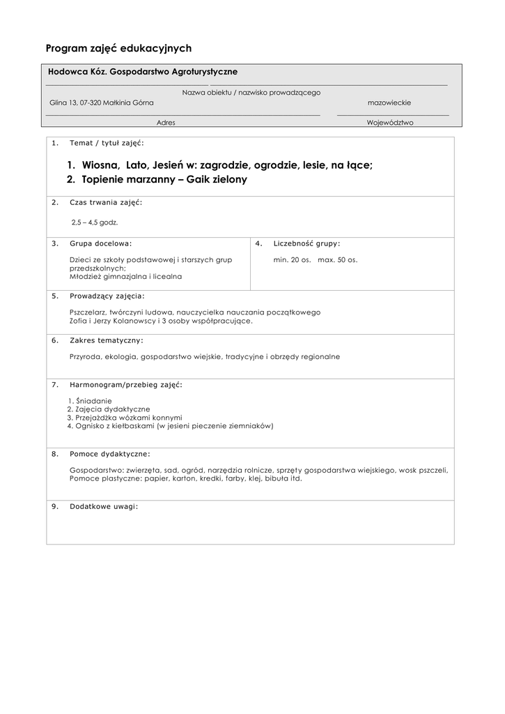 Program zajęć edukacyjnych Hodowca Kóz. Gospodarstwo Agroturystyczne ________________________________________________ ______________________________________________________________________ Nazwa obiektu / nazwisko prowadzącego Glina 13, 07-320 Małkinia Górna mazowieckie _________________________________________________________________________________ _________________________________ Adres Województwo 1. Temat / tytuł zajęć: 1. Wiosna, Lato, Jesień w: zagrodzie, ogrodzie, lesie, na łące; 2. Topienie marzanny – Gaik zielony 2. Czas trwania zajęć: 2,5 – 4,5 godz. 3. Grupa docelowa: 4. Dzieci ze szkoły podstawowej i starszych grup przedszkolnych; Młodzież gimnazjalna i licealna 5. Liczebność grupy: min. 20 os. max. 50 os. Prowadzący zajęcia: Pszczelarz, twórczyni ludowa, nauczycielka nauczania początkowego Zofia i Jerzy Kolanowscy i 3 osoby współpracujące. 6. Zakres tematyczny: Przyroda, ekologia, gospodarstwo wiejskie, tradycyjne i obrzędy regionalne 7. Harmonogram/przebieg zajęć: 1. Śniadanie 2. Zajęcia dydaktyczne 3. Przejażdżka wózkami konnymi 4. Ognisko z kiełbaskami (w jesieni pieczenie ziemniaków) 8. Pomoce dydaktyczne: Gospodarstwo: zwierzęta, sad, ogród, narzędzia rolnicze, sprzęt y gospodarstwa wiejskiego, wosk pszczeli, Pomoce plastyczne: papier, karton, kredki, farby, klej, bibuła itd. 9. Dodatkowe uwagi: