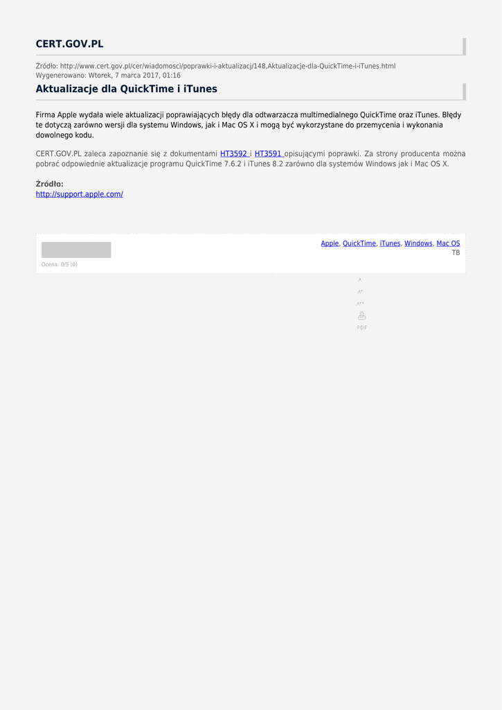 CERT.GOV.PL Źródło: http://www.cert.gov.pl/cer/wiadomosci/poprawki-i-aktualizacj/148,Aktualizacje-dla-QuickTime-i-iTunes.html Wygenerowano: Wtorek, 7 marca 2017, 01:16 Aktualizacje dla QuickTime i iTunes Firma Apple wydała wiele aktualizacji poprawiających błędy dla odtwarzacza multimedialnego QuickTime oraz iTunes. Błędy te dotyczą zarówno wersji dla systemu Windows, jak i Mac OS X i mogą być wykorzystane do przemycenia i wykonania dowolnego kodu. CERT.GOV.PL zaleca zapoznanie się z dokumentami HT3592 i HT3591 opisującymi poprawki. Za strony producenta można pobrać odpowiednie aktualizacje programu QuickTime 7.6.2 i iTunes 8.2 zarówno dla systemów Windows jak i Mac OS X. Źródło: http://support.apple.com/ Apple, QuickTime, iTunes, Windows, Mac OS TB Ocena: 0/5 (0)