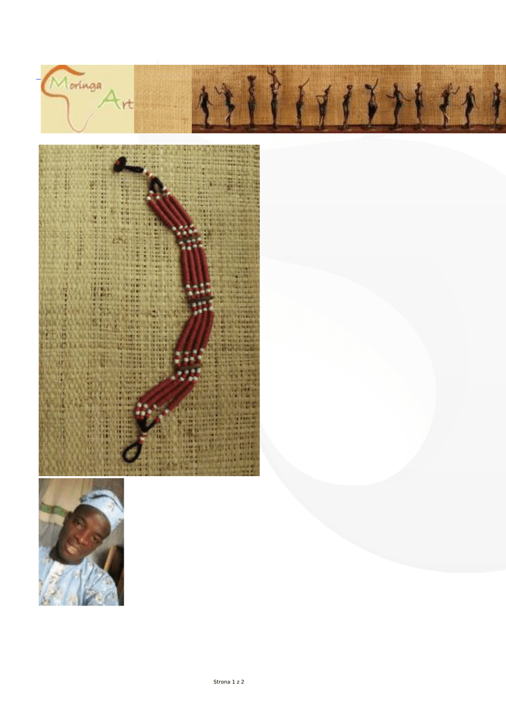 Strona 1 z 2 Niepowtarzalny naszyjnik - obroża wykonany z koralików kofi w kolorze czerwonym, elementów z drewna oraz z koralików w kolorze czerwonym, białym i czarnym. Posiada oryginalne afrykańskie zapięcie zrobione z koralików kofi. Wymiary: obwód: 36 cm. Naszyjnik pochodzi z Wybrzeża Kości Słoniowej. Idealnie nadaje się na wyjątkowy prezent. Strona 2 z 2