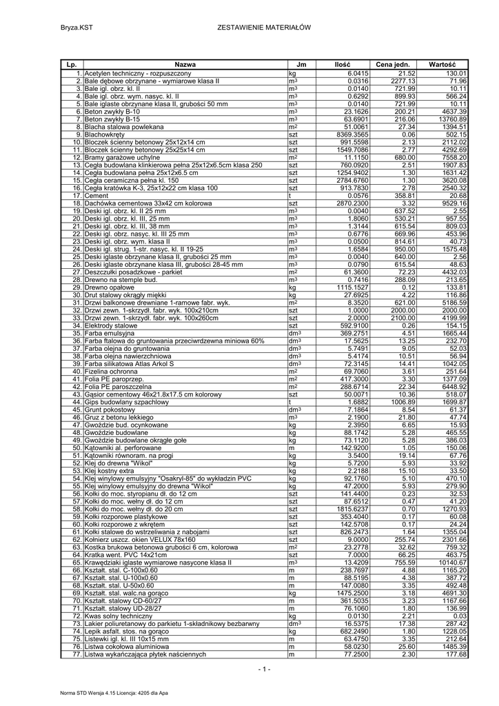 Bryza.KST Lp. 1. 2. 3. 4. 5. 6. 7. 8. 9. 10. 11. 12. 13. 14. 15. 16. 17. 18. 19. 20. 21. 22. 23. 24. 25. 26. 27. 28. 29. 30. 31. 32. 33. 34. 35. 36. 37. 38. 39. 40. 41. 42. 43. 44. 45. 46. 47. 48. 49. 50. 51. 52. 53. 54. 55. 56. 57. 58. 59. 60. 61. 62. 63. 64. 65. 66. 67. 68. 69. 70. 71. 72. 73. 74. 75. 76. 77. ZESTAWIENIE MATERIAŁÓW Nazwa Acetylen techniczny - rozpuszczony Bale dębowe obrzynane - wymiarowe klasa II Bale igl. obrz. kl. II Bale igl. obrz. wym. nasyc. kl. II Bale iglaste obrzynane klasa II, grubości 50 mm Beton zwykły B-10 Beton zwykły B-15 Blacha stalowa powlekana Blachowkręty Bloczek ścienny betonowy 25x12x14 cm Bloczek ścienny betonowy 25x25x14 cm Bramy garaŜowe uchylne Cegła budowlana klinkierowa pełna 25x12x6.5cm klasa 250 Cegła budowlana pełna 25x12x6.5 cm Cegła ceramiczna pełna kl. 150 Cegła kratówka K-3, 25x12x22 cm klasa 100 Cement Dachówka cementowa 33x42 cm kolorowa Deski igl. obrz. kl. II 25 mm Deski igl. obrz. kl. III, 25 mm Deski igl. obrz. kl. III, 38 mm Deski igl. obrz. nasyc. kl. III 25 mm Deski igl. obrz. wym. klasa II Deski igl. strug. 1-str. nasyc. kl. II 19-25 Deski iglaste obrzynane klasa II, grubości 25 mm Deski iglaste obrzynane klasa III, grubości 28-45 mm Deszczułki posadzkowe - parkiet Drewno na stemple bud. Drewno opałowe Drut stalowy okrągły miękki Drzwi balkonowe drewniane 1-ramowe fabr. wyk. Drzwi zewn. 1-skrzydł. fabr. wyk. 100x210cm Drzwi zewn. 1-skrzydł. fabr. wyk. 100x260cm Elektrody stalowe Farba emulsyjna Farba ftalowa do gruntowania przeciwrdzewna miniowa 60% Farba olejna do gruntowania Farba olejna nawierzchniowa Farba silikatowa Atlas Arkol S Fizelina ochronna Folia PE paroprzep. Folia PE paroszczelna Gąsior cementowy 46x21.8x17.5 cm kolorowy Gips budowlany szpachlowy Grunt pokostowy Gruz z betonu lekkiego Gwoździe bud. ocynkowane Gwoździe budowlane Gwoździe budowlane okrągłe gołe Kątowniki al. perforowane Kątowniki równoram. na progi Klej do drewna "Wikol" Klej kostny extra Klej winylowy emulsyjny "Osakryl-85" do wykładzin PVC Klej winylowy emulsyjny do drewna "Wikol" Kołki do moc. styropianu dł. do 12 cm Kołki do moc. wełny dł. do 12 cm Kołki do moc. wełny dł. do 20 cm Kołki rozporowe plastykowe Kołki rozporowe z wkrętem Kołki stalowe do wstrzeliwania z nabojami Kołnierz uszcz. okien VELUX 78x160 Kostka brukowa betonowa grubości 6 cm, kolorowa Kratka went. PVC 14x21cm Krawędziaki iglaste wymiarowe nasycone klasa II Kształt. stal. C-100x0.60 Kształt. stal. U-100x0,60 Kształt. stal. U-50x0.60 Kształt. stal. walc.na gorąco Kształt. stalowy CD-60/27 Kształt. stalowy UD-28/27 Kwas solny techniczny Lakier poliuretanowy do parkietu 1-składnikowy bezbarwny Lepik asfalt. stos. na gorąco Listewki igl. kl. III 10x15 mm Listwa cokołowa aluminiowa Listwa wykańczająca płytek naściennych -1- Norma STD Wersja 4.15 Licencja: 4205 dla Apa Jm kg m3 m3 m3 m3 m3 m3 m2 szt szt szt m2 szt szt szt szt t szt m3 m3 m3 m3 m3 m3 m3 m3 m2 m3 kg kg m2 szt szt szt dm3 dm3 dm3 dm3 dm3 m2 m2 m2 szt t dm3 m3 kg kg kg m kg kg kg kg kg szt szt szt szt szt szt szt m2 szt m3 m m m kg m m kg dm3 kg m m m Ilość 6.0415 0.0316 0.0140 0.6292 0.0140 23.1626 63.6901 51.0061 8369.3565 991.5598 1549.7086 11.1150 760.0920 1254.9402 2784.6760 913.7830 0.0576 2870.2300 0.0040 1.8060 1.3144 0.6776 0.0500 1.6584 0.0040 0.0790 61.3600 0.7416 1115.1527 27.6925 8.3520 1.0000 2.0000 592.9100 369.2751 17.5625 5.7491 5.4174 72.3145 69.7060 417.3000 288.6714 50.0071 1.6882 7.1864 2.1900 2.3950 88.1742 73.1120 142.9200 3.5400 5.7200 2.2188 92.1760 47.2000 141.4400 87.6512 1815.6237 353.4040 142.5708 826.2473 9.0000 23.2778 7.0000 13.4209 238.7697 88.5195 147.0080 1475.2500 361.5035 76.1060 0.0130 16.5375 682.2490 63.4750 58.0230 77.2500 Cena jedn. 21.52 2277.13 721.99 899.93 721.99 200.21 216.06 27.34 0.06 2.13 2.77 680.00 2.51 1.30 1.30 2.78 358.81 3.32 637.52 530.21 615.54 669.96 814.61 950.00 640.00 615.54 72.23 288.09 0.12 4.22 621.00 2000.00 2100.00 0.26 4.51 13.25 9.05 10.51 14.41 3.61 3.30 22.34 10.36 1006.89 8.54 21.80 6.65 5.28 5.28 1.05 19.14 5.93 15.10 5.10 5.93 0.23 0.47 0.70 0.17 0.17 1.64 255.74 32.62 66.25 755.59 4.88 4.38 3.35 3.18 3.23 1.80 2.21 17.38 1.80 3.35 25.60 2.30 Wartość 130.01 71.96 10.11 566.24 10.11 4637.39 13760.89 1394.51 502.15 2112.02 4292.69 7558.20 1907.83 1631.42 3620.08 2540.32 20.68 9529.16 2.55 957.55 809.03 453.96 40.73 1575.48 2.56 48.63 4432.03 213.65 133.81 116.86 5186.59 2000.00 4199.99 154.15 1665.44 232.70 52.03 56.94 1042.05 251.64 1377.09 6448.92 518.07 1699.87 61.37 47.74 15.93 465.55 386.03 150.06 67.76 33.92 33.50 470.10 279.90 32.53 41.20 1270.93 60.08 24.24 1355.04 2301.66 759.32 463.75 10140.67 1165.20 387.72 492.48 4691.30 1167.66 136.99 0.03 287.42 1228.05 212.64 1485.39 177.68 Bryza.KST Lp. 78. 79. 80. 81. 82. 83. 84. 85. 86. 87. 88. 89. 90. 91. 92. 93. 94. 95. 96. 97. 98. 99. 100. 101. 102. 103. 104. 105. 106. 107. 108. 109. 110. 111. 112. 113. 114. 115. 116. 117. 118. 119. 120. 121. 122. 123. 124. 125. 126. 127. 128. 129. 130. 131. 132. 133. 134. 135. 136. 137. 138. 139. 140. 141. 142. 143. 144. 145. 146. 147. 148. 149. 150. 151. 152. 153. ZESTAWIENIE MATERIAŁÓW Nazwa Listwy przyścienne z drewna iglastego Listwy przyść. z drewna liść. Łaty igl. nasycone kl. II Łączniki krzyŜowe PD 60/60 Łączniki wzdłuŜne PL 60/110 Masa asfaltowa izolacyjna Masa uszcz. AQUAFIN-2K ObrzeŜe trawnikowe betonowe 100x30x8 cm szare Okładzina stopni schodowych z drewna liściastego Okna drewniane fabr. wyk. ind. o pow. do 2,0 m2 Okna drewniane fabr. wyk. ind. o pow. ponad 2,0 m2 Okno dachowe" VELUX M10" 78x160 Okucia włazów dachowych OścieŜnica drzwiowa drewniana Papa asfaltowa izolacyjna Papier ścierny Pianka poliuretanowa Piasek Płyta gipsowo-kartonowa wodo- i ognioochronna, 12,5 mm Płyta styrodurowa Płyta styropianowa samogasnąca Płytki "Gres" o wymiarach 30.0x30.0x1.0 cm gatunek I Płytki kamionkowe GRES Płytki klinkierowe elewacyjne Płytki klinkierowe sz