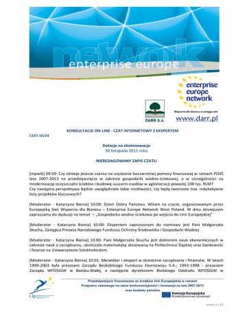 www.darr.pl KONSULTACJE ON-LINE - CZAT INTERNETOWY Z EKSPERTEM CZAT 10/24 Dotacje na ekoinnowacje 30 listopada 2011 roku NIEREDAGOWANY ZAPIS CZATU *mpwik+ 09:59: Czy istnieje jeszcze szansa na uzyskanie bezzwrotnej pomocy finansowej w ramach POIiŚ lata 2007-2013 na przedsięwzięcia w zakresie gospodarki wodno-ściekowej, a w szczególności na modernizację oczyszczalni ścieków i budowę suszarni osadów w aglomeracji powyżej 100 tys. RLM? Czy następna perspektywa będzie uwzględniała takie możliwości, czy będą tworzone tzw. indykatywne listy projektów kluczowych? [Moderator - Katarzyna Bienia+ 10:00: Dzieo Dobry Paostwu. Witam na czacie, organizowanym przez Europejską Sied Wsparcia dla Biznesu – Enterprise Europe Network West Poland. W dniu dzisiejszym zapraszamy do dyskusji na temat – „Gospodarka wodno-ściekowa po wejściu do Unii Europejskiej” [Moderator - Katarzyna Bienia+ 10:00: Ekspertem zaproszonym do rozmowy jest Pani Małgorzata Skucha, Zastępca Prezesa Narodowego Funduszu Ochrony Środowiska i Gospodarki Wodnej [Moderator - Katarzyna Bienia+ 10:00: Pani Małgorzata Skucha jest doktorem nauk ekonomicznych w zakresie nauk o zarządzaniu, ukooczyła matematykę stosowaną na Politechnice Śląskiej oraz bankowośd i finanse na Uniwersytecie Sztokholmskim. [Moderator - Katarzyna Bienia+ 10:01: Menedżer i ekspert w dziedzinie zarządzania i finansów. W latach 1999-2003 była prezesem Zarządu Beskidzkiego Funduszu Ekorozwoju S.A.; 1993-1998 - prezesem Zarządu WFOSiGW w Bielsku-Białej, a następnie dyrektorem Bielskiego Oddziału WFOŚiGW w Przedsięwzięcie finansowane ze środków Unii Europejskiej w ramach Programu ramowego na rzecz konkurencyjności i innowacji na lata 2007-2013 oraz budżetu państwa strona 1 z 12 Katowicach. W latach 2005-2010 współpracowała z Wyższą Szkołą Bankowości i Finansów w BielskuBiałej. *Główny+: Olkusz wszedł o godz. 10:01 [Ekspert - Małgorzata Skucha+ 10:01: mpwik taka możliwośd potencjalnie istnieje ale w tym zakresie w przypadku ogłoszenia przez Ministerstwo Środowiska 7 konkursu w ramach I osi POIiŚ [Moderator - Katarzyna Bienia+ 10:01: Informacje na temat Eksperta znajdą Paostwo na naszej stronie (www.darr.pl) w zakładce: Projekty / Enterprise Europe Network / Więcej informacji / Porozmawiaj z ekspertem – czaty (http://www.darr.pl/pl/1037/Czaty_internetowe) [Moderator - Katarzyna Bienia+ 10:02: Szanowni Paostwo powtórzę pytanie zadane na samym początku przez użytkownika mpwik: Czy istnieje jeszcze szansa na uzyskanie bezzwrotnej pomocy finansowej w ramach POIiŚ lata 2007-2013 na przedsięwzięcia w zakresie gospodarki wodno-ściekowej, a w szczególności na modernizację oczyszczalni ścieków i budowę suszarni osadów w aglomeracji powyżej 100 tys. RLM? [Moderator - Katarzyna Bienia] 10:03: Informacja techniczna - Ekspert koocząc wypowiedź użyje znak ">" [Moderator - Katarzyna Bienia] 10:03: Jeszcze jedna informacja techniczna - maksymalna ilośd znaków do jednorazowego wpisu to 500. [Moderator - Katarzyna Bienia+ 10:03: W międzyczasie osoby, które weszły do czatu z lekkim opóźnieniem chciałam wyjaśnid, że zapis czatu widoczny jest tylko od momentu, kiedy wejdzie się do systemu. [Ekspert - Małgorzata Skucha+ 10:03: mpwik ogłoszenie konkursu uzależnione jest od zwiększenia alokacji przez Komisję Europejską na I oś, po zmianie kryteriów pozytywnie ocenione mogą byd tylko projekty z pełną dokumentacja i pozwoleniami i tylko w zakresie gospodarki ściekowej [Moderator - Katarzyna Bienia+ 10:03: Pełny zapis czatu zostanie zamieszczony na stronie www.darr.pl w zakładce: Projekty / Enterprise Europe Network / Więcej informacji / Porozmawiaj z ekspertem – czaty (http://www.darr.pl/pl/1037/Czaty_internetowe) *Główny+: Stanko wszedł o godz. 10:04 *Główny+: Hater wszedł o godz. 10:05 [Moderator - Katarzyna Bienia+ 10:05: Proszę jeszcze Eksperta o wyjaśnienia czy Polska wywiąże się z zobowiązao w zakresie gospodarki odpadami względem Unii Europejskiej? *mpwik+ 10:06: Dziękuję za odpowiedź i proszę jeszcze o informacje o przyszłej perspektywie [Ekspert - Małgorzata Skucha+ 10:09: wprowadzona zmiana w ustawie o utrzymaniu czystości i porządku w gminach, która wejdzie w życie od 01.01.2012 r. daje szansę na zrealizowanie większości zobowiązao w zakresie gospodarki odpadami, bez tej zmiany inwestorzy nie podejmowaliby ryzyka realizacji koniecznych inwestycji ze względu na brak gwarancji w zakresie strumienia odpadów, duże środki Unii Europejskiej mogą pomóc w realizacji tych zobowiązao [Ekspert - Małgorzata Skucha] 10:09: mpwik strona 2 z 12 www.darr.pl KONSULTACJE ON-LINE - CZAT INTERNETOWY Z EKSPERTEM CZAT 10/24 [Ekspert - Małgorzata Skucha+ 10:12: mpwik co do przyszłej perspektywy na dzisiaj trudno powiedzied, jakie środki przeznaczone będą na gospodarkę wodno-ściekową ponieważ do 2015 mamy wywiązad się ze zobowiązao Traktatu Akcesyjnego, dyskusja trwa nad formą dofinansowania coraz częściej mowa jest o zwrotnych formach wsparcia [Moderator - Katarzyna Bienia+ 10:13: Bardzo dziękuję za odpowiedzi. Zapraszam Paostwa do zadawania pytao. [Mirek] 10:14: Co z tymi firmami, które nie dostosują się do wymogów UE w dziedzinie gospodarki wodno-ściekowej? [Ekspert - Małgorzata Skucha+ 10:16: Mirek w pierwszej kolejności zostanie obciążone paostwo członkowskie, które przełoży na konkretny podmiot gospodarczy/gminę obciążenia z tego tytułu, kolejna sankcją może byd decyzja o zamknięciu firmy niespełniającej wymogów nałożonych przez prawo wspólnotowe> *Olkusz+ 10:18: Czy mógłbym uzyskad informacje kto jest głównym beneficjentem NFOŚiGW jeśli chodzi o poprawę jakości wody? [Mirek] 10:20: Czy są jakieś określone branże, które mogą liczyd na specjalne traktowanie, odnośnie norm unijnych? *Główny+: aaa wszedł o godz. 10:20 *Główny+: aaa wyszedł o godz. 10:20 Przedsięwzięcie finansowane ze