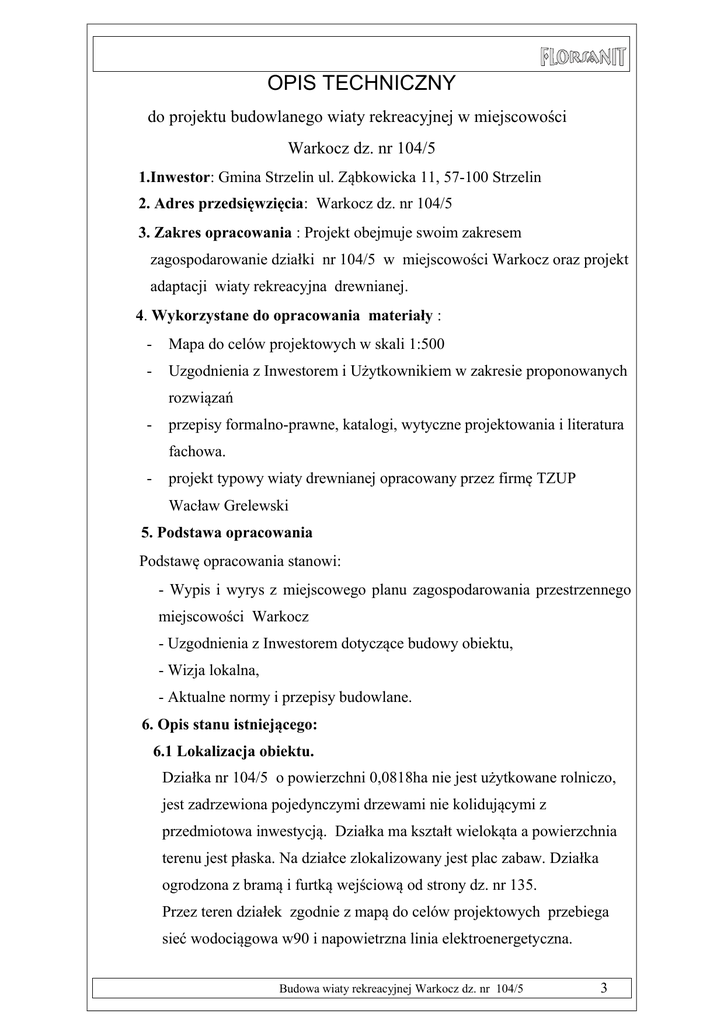OPIS TECHNICZNY do projektu budowlanego wiaty rekreacyjnej w miejscowości Warkocz dz. nr 104/5 1.Inwestor: Gmina Strzelin ul. Ząbkowicka 11, 57-100 Strzelin 2. Adres przedsięwzięcia: Warkocz dz. nr 104/5 3. Zakres opracowania : Projekt obejmuje swoim zakresem zagospodarowanie działki nr 104/5 w miejscowości Warkocz oraz projekt adaptacji wiaty rekreacyjna drewnianej. 4. Wykorzystane do opracowania materiały : - Mapa do celów projektowych w skali 1:500 - Uzgodnienia z Inwestorem i Użytkownikiem w zakresie proponowanych rozwiązań - przepisy formalno-prawne, katalogi, wytyczne projektowania i literatura fachowa. - projekt typowy wiaty drewnianej opracowany przez firmę TZUP Wacław Grelewski 5. Podstawa opracowania Podstawę opracowania stanowi: - Wypis i wyrys z miejscowego planu zagospodarowania przestrzennego miejscowości Warkocz - Uzgodnienia z Inwestorem dotyczące budowy obiektu, - Wizja lokalna, - Aktualne normy i przepisy budowlane. 6. Opis stanu istniejącego: 6.1 Lokalizacja obiektu. Działka nr 104/5 o powierzchni 0,0818ha nie jest użytkowane rolniczo, jest zadrzewiona pojedynczymi drzewami nie kolidującymi z przedmiotowa inwestycją. Działka ma kształt wielokąta a powierzchnia terenu jest płaska. Na działce zlokalizowany jest plac zabaw. Działka ogrodzona z bramą i furtką wejściową od strony dz. nr 135. Przez teren działek zgodnie z mapą do celów projektowych przebiega sieć wodociągowa w90 i napowietrzna linia elektroenergetyczna. Budowa wiaty rekreacyjnej Warkocz dz. nr 104/5 3 6.2 Istniejący układ komunikacyjny: Działka 104/5 posiada połączenie z drogą publiczną (gminną) dz. nr 135. 6.3 Zieleń: Działka zadrzewiona pojedynczymi drzewami nie kolidującymi z przedmiotową inwestycją 7. Projektowane zagospodarowanie działki: 7.1 Projektowane obiekty: Na terenie działki nr 104/5 projektuje się: - budowę wiaty rekreacyjnej drewnianej - utwardzenia dla ruchu pieszego - chodniki - wewnętrzną linię zasilającą elektroenergetyczną n/n (wlz) 7.2 Wiata rekreacyjna: Projektowana wiata rekreacyjna zlokalizowany zostanie na dz. nr 104/5 w jej północnej części. Projektuje się wiatę drewnianą jako obiekt parterowy, niepodpiwniczony z dachem dwuspadowym o kącie 200 pokrytym blachodachówką. Wiata drewniana składa się z dwóch części, jedna jest wydzielona ścianami pełnymi drewnianymi, natomiast druga część jest wydzielona ściankami do wys. 1,1m. W projektowanej wiacie zaprojektowano kominek – od strony pomieszczenia zamkniętego kominek będzie posiadał wkład kominowy, od zewnątrz kominek z otwartym paleniskiem. Do wiaty zaprojektowano utwardzone dojścia z kostki betonowej. 7.3 Projektowane przyłącza: - linii kablowej WLZ nn z projektowanej szafki energetycznej zlokalizowanej na dz. nr 104/5 8. Ochrona Konserwatorska, wpływ eksploatacji górniczej: Obiekt nie jest zlokalizowany w strefie ochrony Konserwatorskiej. Działka nie jest wpisana do rejestru zabytków zgodnie z Wypisem i wyrysem z miejscowego planu zagospodarowania przestrzennego wsi Warkocz nie podlega ochronie Konserwatorskiej. Działka nie podlega wpływowi eksploatacji górniczej i nie stwarza zagrożenia dla środowiska. 9. Wpływ inwestycji na środowisko: Budowa wiaty rekreacyjnej Warkocz dz. nr 104/5 4 - dla założonego programu użytkowego nie występuje związana z eksploatacją obiektów emisja hałasu, wibracji i promieniowania w tym jonizującego jak również nie powstaje pole elektromagnetyczne czy inne zakłócenia charakter, program użytkowy i wielkość oraz sposób posadowienia obiektu –nie wpływa negatywnie na istniejący drzewostan, powierzchnie ziemi, glebę oraz wody powierzchniowe i podziemne. Gleba zebrana podczas prac ziemnych w całości zostanie powtórnie rozplantowana na trenie Inwestora Wody opadowe odprowadzane będą na teren Inwestora. 10. Zagrożenia dla środowiska i ludzi: Nie przewiduje się negatywnych - innych od typowych dla tego typu obiektu wpływów na środowisko. Nie przewiduje się zagrożeń dla higieny i zdrowia użytkowników obiektu budowlanego i jego otoczenia. 11. Dane o zatrudnieniu: Nie przewiduje się zatrudnienia osób w obiekcie – w świetle przepisów obiekt nie jest miejscem pracy. 12. Warunki geotechniczne posadowienia: Posadowienie geotechniczne obiektu zaprojektowano na podstawie badań geotechnicznych terenowych wykonanych przez Projektanta. Celem określenia geotechnicznych właściwości gruntów wykonano trzy próbne wykopy w miejscach lokalizacji obiektu do głębokości 1,5m. Po dokonaniu oględzin i pomiarów stwierdzono następujące warstwy gruntu: • warstwa gleby brunatnej do gł. 0,4m warstwa geotechniczna I • piaski średnioziarniste od głębokości 0,4 m; warstwa geotechniczna IIa • piaski gruboziarniste od głębokości 1,4m warstwa geotechniczna IIb Do głębokości 1,50 m wody gruntowej nie stwierdzono. Zgodnie z Rozporządzeniem w sprawie ustalenia geotechnicznych warunków posadowienia obiektów budowlanych określa się istniejące warunki gruntowe jako proste. Uwzględniając rodzaj warunków gruntowych oraz czynniki konstrukcyjne zakwalifikowano obiekt do pierwszej kategorii geotechnicznej. 13. Zestawienie powierzchni: Powierzchnia działki 104/5 Budowa wiaty rekreacyjnej Warkocz dz. nr 104/5 818,00 m2 5 Powierzchnia zabudowy wiaty 50,00 m2 Powierzchnia podejść 12,88m2 Powierzchnia opasek 13,0m2 13.1 Charakterystyczne parametry techniczne obiektu w projektu typowego: - długość 10,00m - szerokość 5,00 m - wysokość 5,00 m - powierzchnia użytkowa 49,11m2 - powierzchnia zabudowy 50,00m2 - kubatura 168,0m3 14. Bezpieczeństwo i higiena pracy: Materiały i wyroby zastosowane do wbudowania w obiekt, muszą posiadać: - aprobatę techniczną, obowiązkowy certyfikat zgodności i oznaczenie znakiem bezpieczeństwa „B” - świadectwo dopuszczenia urzędu dozoru technicznego dla urządzeń podozorowych - dobrowolny certyfikat zgodności i oznaczenie nadanymi zna