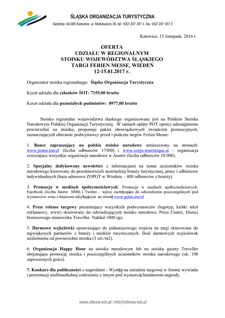 ŚLĄSKA ORGANIZACJA TURYSTYCZNA Siedziba: 40-085 Katowice, ul. Mickiewicza 29, tel.: 032/ 207 207 1, fax: 032/ 207 207 2 Katowice, 15 listopada 2016 r. OFERTA UDZIAŁU W REGIONALNYM STOISKU WOJEWÓDZTWA ŚLĄSKIEGO TARGI FERIEN MESSE, WIEDEŃ 12-15.01.2017 r. Organizator stoiska regionalnego: Śląska Organizacja Turystyczna Koszt udziału dla członków ŚOT: 7155,00 brutto Koszt udziału dla pozostałych podmiotów: 8977,00 brutto Stoisko regionalne województwa śląskiego organizowane jest na Polskim Stoisku Narodowym Polskiej Organizacji Turystycznej. W ramach opłaty POT oprócz udostępnienia powierzchni na stoisku, proponuje pakiet obowiązkowych świadczeń promocyjnych, zaznaczających obecność podwystawcy przed i podczas targów Ferien Messe: 1. Baner zapraszający na polskie stoisko narodowe umieszczony na stronach: www.polen.travel (liczba odbiorców 17500) i www.corps-touristique.at - organizacja zrzeszajaca wszystkie organizacje narodowe w Austrii (liczba odbiorców 18 000). 2. Specjalny dedykowany newsletter z informacjami na temat uczestników stoiska narodowego kierowany do przedstawicieli austriackiej branży turystycznej, prasy i odbiorców indywidualnych (baza adresowa ZOPOT w Wiedniu – 400 odbiorców z branży). 3. Promocja w mediach społecznościowych: Promocja w mediach społecznościowych: Facebook (liczba fanów: 3000) i Twitter – wpisy zachęcające do odwiedzenia poszczególnych pod wystawców wraz z banerem odsyłającym na stronę www.polen.travel 4. Press release targowy prezentujący wszystkich podwystawców (logotyp, krótki tekst reklamowy, www) skierowany do odwiedzających stoisko narodowe, Press Center, klienci biznesowego stanowiska Traveller. Nakład 1000 egz. 5. Darmowe wejściówki uprawniające do jednorazowego wejścia na targi skierowane do największych partnerów z branży i mediów turystycznych. Ilość darmowych wejściówek uzależniona od powierzchni stoiska (3 szt./m2). 6. Organizacja Happy Hour na stoisku narodowym lub na stoisku gazety Traveller obejmująca promocję stoiska i poszczególnych uczestników stoiska narodowego (ok. 100 zaproszonych gości). 7. Konkurs dla publiczności z nagrodami - Występ na estradzie targowej w formie wywiadu i prezentacji multimedialnej codziennie z innym pod wystawcą fundatorem nagrody. www.silesia-sot.pl; [email protected] ŚLĄSKA ORGANIZACJA TURYSTYCZNA Siedziba: 40-085 Katowice, ul. Mickiewicza 29, tel.: 032/ 207 207 1, fax: 032/ 207 207 2 8. Zaproszenie na Polskie Stoisko Narodowe w oficjalnym informatorze targowym – Ogłoszenie w formacie 1/2 strony, zapraszające do odwiedzenia Polskiego Stoiska Narodowego z logotypami podwystawców - konieczność dostarczenia gotowego materiału do 1 grudnia 2016. Nakład 50 tys. egz, liczba odbiorców: 160 tys. czytelników. 9. Prezentacja multimedialna w kinie targowym – Codziennie w kinie targowym 30 minutowy program prezentujący Region w formie prezentacji multimedialnej. Materiał i lektor w wersji niemieckiej Pojemność sali kinowej: do 130 osób; odwiedzający targi: 153 tys. osób. Powyższy pakiet targowy jest integralną częścią wystąpienia targowego. Koszty udziału oprócz pakietu targowego i rezerwacji powierzchni obejmują: jednolitą zabudowę i wystrój stoisk (zgodnie z projektem POT), podłączenia techniczne na stoisku narodowym (elektryczność), montaż i demontaż stoiska, transport materiałów promocyjnych (limity wagowe ustalone przez POT) codzienne sprzątanie stoiska, obsługę i zaopatrzenie barku znajdującego się na stoisku (napoje zimne i gorące, drobne słodycze), ✓ przyznanie bezpłatnych kart wstępu na tereny targowe (pulę bezpłatnych kart określa organizator targów). Koszt zakupu kart dodatkowych jest p łatny i nie zosta ł ujęty w kosztach pakietu ✓ ✓ ✓ ✓ ✓ ✓ Zgłoszenia udziału w stoisku regionalnym Województwa Śląskiego (skan karty zgłoszenia) podczas targów Ferien Messe w Wiedniu przyjmujemy do dnia 18 listopada 2016 r. do g. 12:00 Osoba do kontaktu: Natalia Wójcik Specjalista ds. Promocji Śląska Organizacja Turystyczna tel. 32 207 207 1 [email protected] www.silesia-sot.pl; [email protected]
