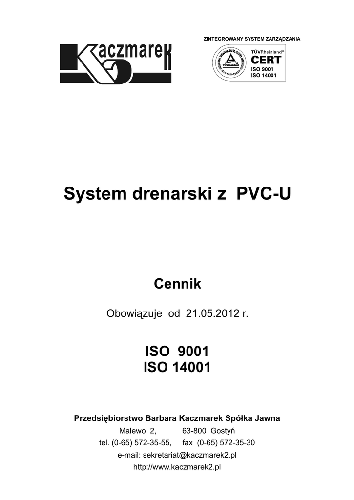 ZINTEGROWANY SYSTEM ZARZĄDZANIA System drenarski z PVC-U Cennik Obowiązuje od 21.05.2012 r. ISO 9001 ISO 14001 Przedsiębiorstwo Barbara Kaczmarek Spółka Jawna Malewo 2, tel. (0-65) 572-35-55, 63-800 Gostyń fax (0-65) 572-35-30 e-mail: [email protected] http://www.kaczmarek2.pl SYSTEM DRENARSKI PVC - U Normy, aprobaty techniczne: PN-C-89221, IBDiM AT/2009-03-0666 Nazwa artykułu Wymiar Indeks J.M. [mm] Cena Ilość w op. [PLN] Worek Paleta Rura drenarska PVC - U Rura drenarska PVC - U z filtrem z włókna kokosowego Rura drenarska PVC - U z filtrem z PP 50/ 44 x50 m 80/ 72 x50 m 100/ 91 x50 m 125/113 x50 m 160/144 x50 m 1511425740 1511725740 1511925740 1512125740 1512325740 mb. mb. mb. mb. mb. 2,04 3,34 3,93 7,00 15,77 50/ 44 x50 m 80/ 72 x50 m 100/ 91 x50 m 125/113 x50 m 160/144 x25 m 1521425740 1521725740 1521925740 1522125740 1522325710 mb. mb. mb. mb. mb. 6,85 10,84 12,92 16,91 22,52 50/ 44 x50 m 80/ 72 x50 m 100/ 91 x50 m 125/113 x50 m 160/144 x25 m 160/144 x50 m 1531425740 1531725740 1531925740 1532125740 1532325710 1532325740 mb. mb. mb. mb. mb. mb. 5,36 8,30 8,93 10,40 17,64 17,64 50 80 100 125 160 1603143900 1603173900 1603193900 1603213900 1603233900 szt. szt. szt. szt. szt. 1,37 2,57 2,89 5,77 10,82 250 100 60 40 20 50 80 100 125 160 1614141990 1614171990 1614193990 1614211990 1614231990 szt. szt. szt. szt. szt. 4,10 8,51 10,92 17,90 16,80 100 40 25 10 10 50/ 50 80/ 50 80/ 80 100/ 50 100/ 80 100/100 125/125 160/160 1624151990 1624271990 1624301990 1624403990 1624433990 1624453990 1624641990 1624751990 szt. szt. szt. szt. szt. szt. szt. szt. 8,19 12,08 12,60 13,65 13,86 13,97 28,67 18,90 80 30 30 15 15 15 10 6 Mufa łączeniowa Kolano 90 o Trójnik 90 o Data: 21.05.2012 r. Obowiązuje cena w dniu odbioru towaru Podatek VAT - 23 % SYSTEM DRENARSKI PVC - U Normy, aprobaty techniczne: PN-C-89221, IBDiM AT/2009-03-0666 Nazwa artykułu Wymiar Indeks J.M. [mm] Cena Ilość w op. [PLN] Worek Paleta Trójnik siodłowy redukcyjny 80 - 100/ 50 100/ 80 125/ 50 125/ 80 160/ 50 160/ 80 160-125/100 160/125 1627403990 1627433990 1627573990 1627603990 1627671990 1627701990 1627721990 1627741990 szt. szt. szt. szt. szt. szt. szt. szt. 13,74 19,48 20,64 22,33 37,10 37,10 37,35 74,96 15 15 10 10 6 6 6 6 100/ 80 125/100 160/125 1630433900 1630621900 1630741900 szt. szt. szt. 9,71 9,42 14,99 60 20 15 80/110 100/110 160/160 1634513900 1634533900 1634753900 szt. szt. szt. 12,60 15,75 23,10 50 50 15 80 100 125 160 1645171900 1645191900 1645211900 1645231900 szt. szt. szt. szt. 23,63 30,45 46,90 78,75 50 80 100 125 160 1642141900 1642171900 1642193900 1642211900 1642231900 szt. szt. szt. szt. szt. 1,16 2,94 4,15 5,14 5,78 80/80 100/100 160/160 2833230150 2833240150 2833270150 szt. szt. szt. 193,10 195,90 209,40 6 6 6 80/80/80 100/100/100 160/160/160 2833330150 2833340150 2833370150 szt. szt. szt. 210,00 212,60 226,20 6 6 6 80/80/80/80 100/100/100/100 160/160/160/160 2833430150 2833440150 2833470150 szt. szt. szt. 224,40 229,50 242,80 6 6 6 Redukcja Przejście rura drenarska na rurę kanałową Element rura wylotowa Korek Studnia drenarska kontrolna L=1500 mm Data: 21.05.2012 r. Obowiązuje cena w dniu odbioru towaru Podatek VAT - 23 % SYSTEM DRENARSKI PVC - U Normy, aprobaty techniczne: PN-C-89221, IBDiM AT/2009-03-0666 Nazwa artykułu Wymiar Indeks J.M. [mm] Pokrywa / dno PP studni drenarskiej Cena Ilość w op. [PLN] Worek Paleta 315 2539911090 szt. 54,20 8 72 315 5162131050 szt. 22,00 A 15 - 1,5 t B 125 - 12,5 t B 125 - 12,5 t K D 400 - 40 t D 400 - 40 t K 2901131100 2901132100 2902132100 2901134100 2902134100 szt. szt. szt. szt. szt. 201,00 265,00 275,00 365,00 480,00 24 24 24 24 24 3 3 Uszczelka Właz żeliwny 315 K kratka- wpust Rura teleskopowa do włazu żeliwnego 315 Pokrywa 315 z PP przeznaczona bezpośrednio na rurę wznoszącą Geowłóknina 2 90 g / m Data: 21.05.2012 r. 315 L400 315 L800 2781321040 2781321080 szt. szt. 70,00 120,00 A15 - 1,5 t 2539405090 szt. 65,70 2,0 m. x 200 m 1590220500 m 2 3,59 Obowiązuje cena w dniu odbioru towaru 10 Podatek VAT - 23 %