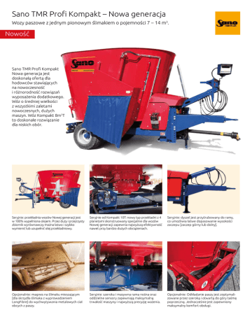 Sano TMR Profi Kompakt – Nowa generacja Wozy paszowe z jednym pionowym ślimakiem o pojemności 7 – 14 m3. Nowość Sano TMR Profi Kompakt Nowa generacja jest doskonałą ofertą dla hodowców stawiających na nowoczesność i różnorodność rozwiązań wyposażenia dodatkowego. Wóz o średniej wielkości z wszystkimi zaletami nowoczesnych, dużych maszyn. Wóz Kompakt 8m3T to doskonałe rozwiązanie dla niskich obór. Seryjnie: przekładnia wozów Nowej generacji jest w 100% wypełniona olejem. Przez duży i przejrzysty zbiornik wyrównawczy można łatwo i szybko wymienić lub uzupełnić olej przekładniowy. Seryjnie od Kompakt 10T: nowy typ przekładni z 4 planetami skonstruowany specjalnie dla wozów Nowej generacji zapewnia najwyższą efektywność nawet przy bardzo dużych obciążeniach. Seryjnie: dyszel jest przyśrubowany do ramy, co umożliwia łatwe dopasowanie wysokości zaczepu [zaczep górny lub dolny]. Opcjonalnie: magnes na ślimaku mieszającym [dla skrzydła ślimaka z wyprowadzeniem LongFibre] do wychwytywania metalowych ciał obcych z paszy. Seryjnie: szeroka i masywna rama nośna oraz oddzielne sensory zapewniają maksymalną trwałość maszyny i najwyższą precyzję ważenia. Opcjonalnie: Odkładanie paszy jest zoptymalizowane przez szeroką i otwartą do góry taśmę poprzeczną. Jednocześnie jest zapewniony maksymalny komfort obsługi. Sano TMR Profi Kompakt – Nowa generacja Wozy paszowe z jednym pionowym ślimakiem o pojemności 7 – 14 m3. Model 7m³ 8m³ 8m³ T 9m³ 10m³ 10m³ T 12m³ 14m3 Nr artykułu 459007459008 459085459009 459010 459105459012459145 Wyposażenie podstawowe: } } } } } } } } } } } } } } } zasuwa wysypu z przodu z prawej strony waga sumująca ustawiane, hartowane noże tnące XS wałek przekaźnika mocy [ułożyskowany dla modeli 7-10m3] przekładnia zmniejszająca [modele 10m3T-14] kanciasty pojemnik obręcz przytwierdzona na stałe turbo-ślimak dwa mechaniczne przeciwnoże stopka mechaniczna zaczep górny drabinka przekładnia planetarna zintegrowana ze ślimakiem hamulce hydrauliczne obsługa z ciągnika: ciągnik musi być zaopatrzony w 1 podwójnie działający sterownik [dla zasuwy] i jeden pojedynczy sterownik [dla hamulców hydraulicznych] Dalsze wyposażenie standardowe znajduje się na stronie 8 [Konfiguracja]. Warianty wysypu z przodu Należy wybrać maksymalnie jeden wariant. Nr art. Nazwa wymagana ilość podwójnych sterowników Uwagi 450001 Zasuwa z przodu z prawej strony 1 450008 Taśma z przodu z 2 silnikami napędzającymi 2 Warianty wysypu z tyłu Należy wybrać maksymalnie jeden wariant. 4500101 Zasuwa z tyłu z prawej strony [zamiast zasuwy z przodu z prawej strony] 1 4500111 Zasuwa z tyłu z lewej strony [zamiast zasuwy z przodu z prawej strony] 1 4500112 Dodatkowa zasuwa z tyłu z lewej strony 1 4500121 Zasuwa z tyłu z prawej strony i z tyłu z lewej strony [zamiast zasuwy z przodu z prawej strony] 2 4500131 Zasuwa z tyłu pośrodku [zamiast zasuwy z przodu z prawej strony] 1 4500132 Dodatkowa zasuwa z tyłu pośrodku 1 4500161 Taśma z tyłu z 2 silnikami napędzającymi [zamiast zasuwy z przodu z prawej strony 2 niemożliwe przy zastosowaniu taśmy z przodu 4500162 Dodatkowa taśma z tyłu z 2 silnikami napędzającymi 2 niemożliwe przy zastosowaniu taśmy z przodu Sano TMR Profi Kompakt – Nowa generacja Wozy paszowe z jednym pionowym ślimakiem o pojemności 7 – 14 m3. Konfiguracja Z każdej grupy należy wybrać jeden wariant. Nr art. Nazwa wymagana ilość podwójnych sterowników Uwagi 450080 Skrzydło ślimaka standardowe 450081 Skrzydło ślimaka z wyprowadzeniem LongFibre 450090 Przeciwnoże mechaniczne 2 szt. 450091 Przeciwnoże hydrauliczne 2 szt. 450240 Ogumienie 30x11.5-14.5 dla modeli 7/8 450241 Ogumienie 400/60-15.5 dla modeli 8T/9/10/10T/12 450242 Ogumienie 435/50 R19.5 dla modelu 14 450243 Ogumienie 30x11.5-14.5 [zamiast 400/60-15.5] dla modeli 8T/9/10/10T/12 450244 Ogumienie 215/75 R17.5 bliźniacze [zamiast 435/50 R19.5] dla modelu 14 450110 Hamulce hydrauliczne konieczny jest jeden pojedynczy sterownik 450111 Hamulce pneumatyczne dwuobwodowe 450112 Hamulce pneumatyczne jednoobwodowe 450120 Stopka mechaniczna 450121 Stopka hydrauliczna 450130 Dyszel przestawiany pionowo, górny 450131 Dyszel przestawiany pionowo, dolny 450140 Zaczep 40 mm, sztywny 450141 Zaczep 50 mm, sztywny 450142 Zaczep 50 mm, obracany 450143 Zaczep z głowicą kulową 80 mm 450250 Wałek pośredni dla modeli 7-10 450150 Przekładnia zmniejszająca dla modeli 10T-14 450251 Przekładnia redukcyjna z obsługą hydrauliczną 1 dla modeli 7-10 450151 Przekładnia redukcyjna z obsługą hydrauliczną 1 dla modeli 10T-14 450252 Przekładnia redukcyjna z systemem sterowania linkami dla modeli 7-10 450152 Przekładnia redukcyjna z systemem sterowania linkami dla modeli 10T-14 450163 Wałek przekaźnika mocy wyprowadzenie ciągnika 1 3/8 Z6 450164 Wałek przekaźnika mocy z wyprowadzeniem Beralus wyprowadzenie ciągnika 1 3/8 Z8 450160 Wałek przekaźnika mocy z podwójnym przegubem wyprowadzenie ciągnika 1 3/8 Z6 450161 Wałek przekaźnika mocy z podwójnym przegubem z wyprowadzeniem Beralus wyprowadzenie ciągnika 1 3/8 Z8 450202 Waga sumująca 1 1 450264 Wireless z wagą standardową Hydraulika ciągnika [SWT] dla Kompakt – Nowa generacja Bezprzewodowy system ważenia, obsługa funkcji hydraulicznych przez sterowniki ciągnika lub przez mechaniczne sterowanie linkami, z 2 terminalami podstawowymi 450204 Wireless z wagą standardową z obsługą elektryczną [SWE] Elektryczna obsługa bezprzewodowa ze zintegrowanym systemem ważenia, z 2 terminalami podstawowymi. 450260 Obsługa przez sterowniki ciągnika możliwe tylko z wagą sumującą lub Wireless SWT 450261 Mechaniczne sterowanie mechaniczne z linkami 3m z niezbędnymi funkcjami możliwe tylko z wagą sumującą lub Wireless SWT 450210 Olej wypełniający przekładnię – olej mineralny 450212 Olej wypełniający przekładnię – olej ARCTIC olej przekła