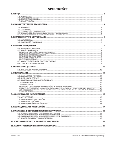 SPIS TREŚCI 1. WSTĘP .............................................................................................................................................................. 3 1.1. WSKAZANIA ................................................................................................................................... 3 1.2. PRZECIWWSKAZANIA .................................................................................................................... 3 1.3. KLASYFIKACJA ............................................................................................................................... 3 2. CHARAKTERYSTYKA TECHNICZNA ........................................................................................................... 4 2.1. 2.2. 2.3. 2.4. GABARYTY ..................................................................................................................................... 4 ZASILANIE...................................................................................................................................... 4 ZAWARTOŚĆ OPAKOWANIA .......................................................................................................... 5 WARUNKI PRZECHOWYWANIA, PRACY I TRANSPORTU............................................................... 5 3. BEZPIECZEŃSTWO UŻYTKOWANIA ............................................................................................................ 6 3.1. OZNACZENIA.................................................................................................................................. 6 3.2. ZGODNOŚĆ Z NORMAMI................................................................................................................ 6 4. BUDOWA URZĄDZENIA ............................................................................................................................... 7 4.1. KONSTRUKCJA LAMPY ................................................................................................................... 7 4.2. PULPIT STERUJĄCY ....................................................................................................................... 8 PRZYCISKI ZMIANY PARAMETRÓW PRACY....................................................................................... 8 PRZYCISKI WYBORU ŻARÓWKI ........................................................................................................ 8 PRZYCISKI START I STOP ................................................................................................................. 9 PRZYCISK PROGRAM ......................................................................................................................... 9 4.3. GNIAZDO ZASILANIA Z BEZPIECZNIKAMI..................................................................................... 9 4.4. TABLICZKA ZNAMIONOWA............................................................................................................ 9 5. MONTAŻ URZĄDZENIA............................................................................................................................... 10 5.1. KOLEJNOŚĆ MONTAŻU LAMPY .................................................................................................... 10 6. UŻYTKOWANIE............................................................................................................................................. 11 6.1. ZAKŁADANIE FILTRÓW................................................................................................................ 11 6.2. REGULACJA POZYCJI ................................................................................................................... 12 6.3. NASTAWIANIE PARAMETRÓW PRACY......................................................................................... 12 TRYB POJEDYNCZY.......................................................................................................................... 12 TRYB PROGRAM .............................................................................................................................. 12 PRZYKŁAD USTAWIENIA PARAMETRÓW W TRYBIE PROGRAM ..................................................... 12 WŁĄCZANIE ZABIEGU I MODYFIKACJA PARAMETRÓW PRACY LAMPY PODCZAS ZABIEGU.......... 13 STAN UŚPIENIA ............................................................................................................................... 14 7. .KONSERWACJA I CZYSZCZENIE............................................................................................................. 15 7.1. 7.2. 7.3. 7.4. CZYSZCZENIE............................................................................................................................... 15 WYMIANA BEZPIECZNIKÓW ........................................................................................................ 15 WYMIANA ŻARÓWKI.................................................................................................................... 16 WYMAGANE ŹRÓDŁA ŚWIATŁA ................................................................................................... 16 8. ROZWIĄZYWANIE PROBLEMÓW ............................................................................................................ 17 9. GWARANCJA I ODPOWIEDZIALNOŚĆ WYTWÓRCY............................................................................... 18 9.1. WARUNKI SERWISU W OKRESIE GWARANCJI. .......................................................................... 18 9.2. WARUNKI SERWISU W OKRESIE PO UPŁYWIE GWARANCJI...................................................... 18 9.3. KARTA GWARANCYJNA URZĄDZENIA. ........................................................................................ 18 10. KARTA OKRESOWYCH BADAŃ TECHNICZNYCH................................................................................... 19 11. KOMPATYBILNOŚĆ ELEKTROMAGNETYCZNA.......................................