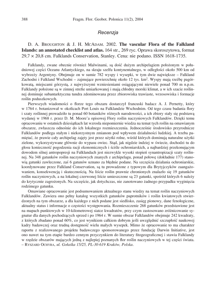 388 Fragm. Flor. Geobot. Polonica 11(2), 2004 Recenzja D. A. Broughton & J. H. McAdam. 2002. The vascular Flora of the Falkland I slands: an annotated checklist and atlas. 164 str., 269 ryc. Oprawa skoroszytowa, format 29,7 × 20,8 cm. Falklands Conservation, Stanley. Cena: nie podano. ISSN 1618-1735. Falklandy, zwane obecnie również Malwinami, są dość dużym archipelagiem położonym w południowej części Oceanu Atlantyckiego, na skraju szelfu kontynentalnego, w odległości około 500 km od wybrzeży Argentyny. Obejmuje on w sumie 782 wyspy i wysepki, w tym dwie największe – Falkland Zachodni i Falkland Wschodni – zajmujące powierzchnię około 12 tys. km2. Wyspy mają rzeźbę pagórkowatą, miejscami górzystą, z najwyższymi wzniesieniami osiągającymi niewiele ponad 700 m n.p.m. Falklandy położone są w zimnej strefie umiarkowanej i mają chłodny morski klimat, a w ich szacie roślinnej dominuje subantarktyczna tundra zdominowana przez zbiorowiska trawiaste, wrzosowiska i formacje roślin poduszkowych. Pierwszych wiadomości o florze tego obszaru dostarczył francuski badacz A. J. Pernetty, który w 1764 r. botanizował w okolicach Port Louis na Falklandzie Wschodnim. Od tego czasu badania flory i szaty roślinnej prowadziło tu ponad 60 botaników różnych narodowości, a ich zbiory stały się podstawą wydanej w 1968 r. przez D. M. Moore’a opisowej Flory roślin naczyniowych Falklandów. Dzięki temu opracowaniu w ostatnich dziesiątkach lat wzrosła niepomiernie wiedza na temat tych roślin na omawianym obszarze, zwłaszcza odnośnie do ich lokalnego rozmieszczenia. Jednocześnie środowisko przyrodnicze Falklandów podlega stałym i niekorzystnym zmianom pod wpływem działalności ludzkiej. A trzeba pamiętać, że prawie cały archipelag zajęty jest przez użytki rolne, wśród których dominują naturalne użytki zielone, wykorzystywane głównie do wypasu owiec. Stąd, jak nigdzie indziej w świecie, dochodzi tu do głosu konieczność pogodzenia racji ekonomicznych i ściśle ochroniarskich, a najbardziej przekonującym dowodem silnej antropopresji na Falklandach jest niezwykle wysoki stopień synantropizacji szaty roślinnej. Na 348 gatunków roślin naczyniowych znanych z archipelagu, ponad połowę (dokładnie 177) stanowią gatunki zawleczone, zaś 6 gatunów uznano za błędnie podane. Na szczęścia działania ochroniarskie, koordynowane przez Falkland Conservation, są tu prowadzone z typowym dla Brytyjczyków zaangażowaniem, konsekwencją i skutecznością. Na liście roślin prawnie chronionych znalazło się 19 gatunków roślin naczyniowych, a na lokalnej czerwonej liście umieszczone są 23 gatunki, spośród których 6 należy do krytycznie zagrożonych. Na szczęście, jak dotychczas, nie zanotowano żadnego przypadku wyginięcia rodzimego gatunku. Omawiane opracowanie jest podsumowaniem aktualnego stanu wiedzy na temat roślin naczyniowych Falklandów. Zawiera ono pełny katalog wszystkich gatunków paprotników i roślin kwiatowych stwierdzonych na tym obszarze, a dla każdego z nich podane jest siedlisko, zasięg pionowy, dane fenologiczne, aktualny status i informacje o częstości występowania. Rozmieszczenie 268 gatunków przedstawione jest na mapach punktowych w 10-kilometrowej siatce kwadratów, przy czym zastosowano zróżnicowanie sygnatur dla danych pochodzących sprzed i po 1964 r. W sumie obszar Falklandów obejmuje 242 kwadraty, z których zbadano ponad 60%, co jest wynikiem całkiem dobrym jeśli uwzględnić szczupłość naukowej kadry badawczej oraz trudną dostępność wielu małych wysepek. Mimo że opracowanie to ma charakter raportu z realizowanego projektu badawczego sponsorowanego przez fundację Darwin Initiative, jest ono nawet na tym etapie bardzo cennym przyczynkiem do literatury fitogeograficznej i stawia Falklandy w rzędzie obszarów mających jedną z najlepiej poznanych flor roślin naczyniowych w tej części świata. – Ryszard Ochyra, ul. Gołaśka 15/25, PL-30-619 Kraków, Polska.