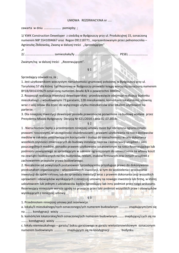 UMOWA REZERWACYJNA nr ….. zawarta w dniu …………………. pomiędzy ; 1/ KWK Construction Deweloper z siedzibą w Bydgoszczy przy ul. Produkcyjnej 15, oznaczoną numerem NIP 5541004667 oraz Regon 091118771 , reprezentowanym przez pełnomocnika – Agnieszkę Żbikowską, Zwaną w dalszej treści „Sprzedającym” ,a 2/………………………………… zamieszkała/ły ……………………………………………….. PESEL ……………………. Zwanym/ną w dalszej treści „Rezerwującym”. §1 Sprzedający oświadcza, że ; 1. Jest użytkownikiem wieczystym nieruchomości gruntowej położonej w Bydgoszczy przy ul. Toruńskiej 57 dla której Sąd Rejonowy w Bydgoszczy prowadzi księgę wieczystą oznaczoną numerem BY1B/00163396/9 oznaczoną numerem działki 8/4 o powierzchni 3880m2 2. Rozpoczął realizację inwestycji deweloperskiej - przedsięwzięcie obejmuje realizację budynku mieszkalnego z wbudowanymi 73 garażami, 128 mieszkaniami, komórkami lokatorskimi, siłownią wraz z salą zabaw dla dzieci do wyłącznego użytku mieszkańców oraz lokalem użytkowym na parterze. 3. Dla niniejszej inwestycji deweloper posiada prawomocne pozwolenie na budowę wydane przez Prezydenta Miasta Bydgoszczy Decyzją Nr 621/2014 z dnia 02.07.2014r. §2 1 . Nieruchomość będąca przedmiotem niniejszej umowy może być obciążona ograniczonymi prawami rzeczowymi, w szczególności służebnościami i prawami użytkowania na rzecz dostawców mediów w zakresie umożliwiającym korzystanie i dostęp do nieruchomości w celu dokonania wszelkich czynności zmierzających do budowy instalacji, napraw i konserwacji urządzeń i sieci poszczególnych mediów, ponadto prawem użytkowania ustanowionym na rzecz Rezerwującego lub podmiotu powiązanego ze sprzedającym w zakresie ograniczonym do umieszczenia na własny koszt na zewnątrz budowanych na niej budynków, reklam, znaków firmowych oraz innych urządzeń z zachowaniem przepisów prawa budowlanego. 2. Niezależnie od powyższych postanowień Sprzedającemu przysługuje prawo do dokonywania przekształceń organizacyjno – własnościowych inwestycji, w tym do wydzielenia i przekazania inwestycji do spółki celowej lub do sprzedaży inwestycji wraz z prawem dokonania cesji wszystkich uprawnień i obowiązków wynikających z niniejszej umowny na nowego inwestora lub firmę, w której udziałowcem lub jednym z udziałowców będzie Sprzedający lub inny podmiot przez niego wskazany. Rezerwujący niniejszym wyraża zgodę na przejęcie przez taki podmiot wszystkich praw i obowiązków wynikających z niniejszej umowy. §3 1. Przedmiotem niniejszej umowy jest rezerwacja: a. lokalu/li mieszkalnego/nych oznaczonego/ych numerem budowlanym ……….. znajdującym/ymi się na ……… kondygnacji wieży ………….. b. komórki/ek lokatorskiej/kich oznaczonej/ych numerem budowlanym……… znajdującej/cych się na ……… kondygnacji wieży ………….. c. lokalu niemieszkalnego – garażu/ boksu garażowego w garażu wielostanowiskowym oznaczonym numerem budowlanym …………… znajdującym się na kondygnacji …………. budynku. d. lokalu niemieszkalnego –miejsca postojowego na zewnątrz budynku oznaczonym numerem budowlanym …………… e. Zapoznał się z lokalizacją nieruchomości, położeniem lokalu/li w budynku oraz rysunkiem rzutu powierzchni przedmiotowego lokalu/li §4 Rezerwujący oświadcza, iż zapoznał się z koncepcją i jest zainteresowany nabyciem nieruchomości opisanej w §3 a tym samym zawarciem umowy deweloperskiej przedmiotowej nieruchomości. §5 1. W ramach rezerwacji Rezerwujący wpłaci w ciągu 3 dni od dnia podpisania niniejszego porozumienia kwotę rezerwacji w wysokości 10 000zł na konto Sprzedającego. 2. Wpłatę należy dokonać na konto prowadzone w: Bank Spółdzielczy w Brodnicy o/ Bydgoszcz o numerze 71 9484 1192 2950 0950 0596 0001 z dopiskiem „rezerwacja lokalu mieszkalnego nr …………. i/lub garażu/ boksu garażowego/miejsca postojowego w garażu wielostanowiskowym nr ……… przy ul. Toruńskiej” 3. Strony postanawiają, iż kwota opłaty rezerwacyjnej zostanie zaliczona na poczet ceny, szczegółowe zasady jej zaliczania lub obowiązku jej zwrotu zostaną opisane w umowie deweloperskiej z zastrzeżeniem §7. 4. Kwota rezerwacji nie podlega oprocentowaniu. §6 1. Niniejsza umowa zostaje zawarta pod warunkiem rozwiązującym tzn. jeżeli Rezerwujący nie dokona opłaty rezerwacyjnej w terminie 3 dni od daty zawarcia niniejszej umowy to niniejsza umowa ulega rozwiązaniu. 2. Niniejsza umowa ulegnie rozwiązaniu również w przypadku gdy którakolwiek ze stron oświadczy w formie pisemnej, iż odstępuje od niniejszej umowy oraz gdy Rezerwujący nie przystąpi do podpisania umowy deweloperskiej w terminie nie później niż do 30.06.2015. Termin podpisania umowy deweloperskiej wyznaczy Sprzedający. §7 W przypadku rezygnacji z kupna przedmiotowego/wych lokalu/li ze strony Rezerwujacego określonego w § 3 niniejszej Umowy Sprzedający zobowiązany jest do zwrotu 50% kwoty rezerwacji na konto wskazane przez Rezerwującego w terminie 21 dni Przedmiotowe zobowiązanie do zwrotu 50% kwoty rezerwacji dotyczy także przypadków i jakich mowa w §6 pkt 2 umowy. §8 Cena brutto1m2 lokalu mieszkalnego została ustalona w kwocie: ………………..…………..., cena komórki lokatorskiej:………………, cena miejsca postojowego zewnętrznego:…………………………………..cena miejsca garażowego:………………….Wartość brutto lokalu mieszkalnego wraz z przynależną komórką lokatorską, miejscem postojowym, miejscem w hali garażowej oraz udziałem w gruncie wyniesie kwotę……………………………………………….., §9 W sprawach dotyczących przedmiotu niniejszej umowy, a nie uregulowanych jego postanowieniami zastosowanie będą mieć odpowiednie przepisy Kodeksu Cywilnego § 10 Wszelkie spory pomiędzy stronami