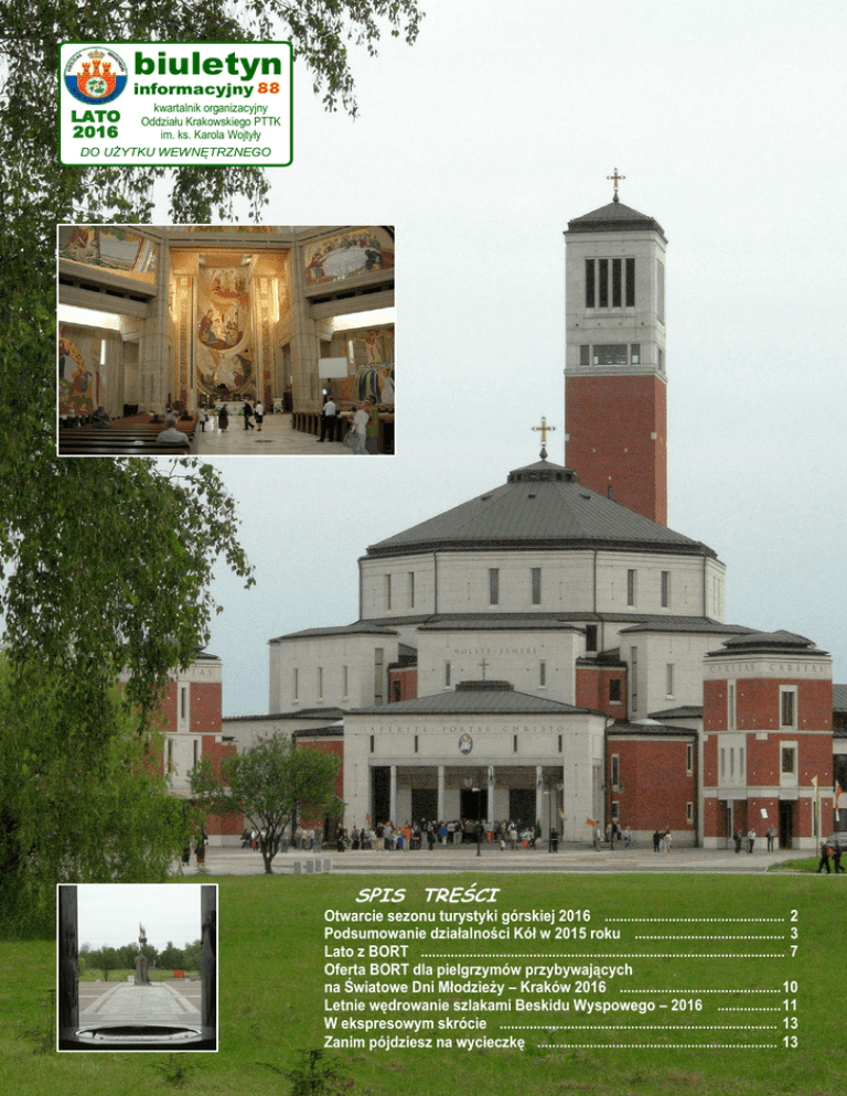 biuletyn informacyjny 88 kwartalnik organizacyjny Oddziału Krakowskiego PTTK im. ks. Karola Wojtyły DO UŻYTKU WEWNĘTRZNEGO LATO 2016 SPIS TREŚCI Otwarcie sezonu turystyki górskiej 2016 ................................................ 2 Podsumowanie działalności Kół w 2015 roku ........................................ 3 Lato z BORT ................................................................................................. 7 Oferta BORT dla pielgrzymów przybywających na Światowe Dni Młodzieży – Kraków 2016 ........................................... 10 Letnie wędrowanie szlakami Beskidu Wyspowego – 2016 ................. 11 W ekspresowym skrócie .......................................................................... 13 Zanim pójdziesz na wycieczkę ................................................................ 13 2 biuletyn informacyjny 88 Biuro Obsługi Ruchu Turystycznego – Oddział Krakowski PTTK 31-029 Kraków, ul. Zyblikiewicza 2b od poniedziałku do piątku w godz. 9 – 17 tel. 12 422 26 76, fax. 12 422 37 23 www.krakow.pttk.pl, e-mail: [email protected] świadczy usługi w zakresie organizowania: obsługi przewodnickiej w języku polskim i w językach obcych noclegów i wyżywienia wycieczek jednodniowych, wielodniowych, krajowych i zagranicznych obozów turystyki kwalifikowanej, zielonych i białych szkół biletów wstępu do muzeów, teatrów i na koncerty dla grup przyjeżdżających do Krakowa: zakwaterowanie, wyżywienie, imprezy regionalne oraz bilety wstępu Otwarcie sezonu turystyki górskiej 2016 W dniu 24 kwietnia 2016 r. Komisje Turystyki Górskiej oddziałów PTTK: Krakowskiego im. ks. Karola Wojtyły, „Beskid” z Nowego Sącza i „Ziemi Tarnowskiej” z Tarnowa imprezą pod nazwą „Wiosna 2016” pod patronatem Marszałka Województwa Małopolskiego zainaugurowały sezon turystyki górskiej w Małopolsce. Tym razem na miejscem rozpoczęcia sezonu była bacówka turystyki kwalifikowanej PTTK na Maciejowej w Gorcach, a głównym organizatorem była Komisja Turystyki Gorskiej Oddziału w Tarnowie. Fatalna pogoda, zimno, wiatr i padający mokry śnieg nie zachęcały turystów do górskich wędrówek. Dlatego też inauguracja sezonu zgromadziła zaledwie około 400 turystów z oddziałów organizujących imprezę oraz z oddziałów z: Krakowa (Oddział Hutniczo-Miejski), Rabki i Nowego Targu. O godzinie 12.00, mszę św. na polanie obok schroniska, w intencji rozpoczynającego się sezonu górskiego, odprawił ks. prof. Maciej Ostrowski z Akademii Papieskiej w Krakowie w asyście ks. Jana Goryla z Pietrzykowic. Po zakończeniu mszy odbyło się oficjalne otwarcie sezonu turystyki górskiej w Małopolsce. Oddziały współorganizujące imprezę reprezentowali: Prezes Oddziału PTTK „Beskid” z Nowego Sącza kol. Adam Sobczyk, Prezes Oddziału Krakowskiego PTTK kol. Janusz Worotniak. Spółkę „Karpaty” Schroniska i Hotele Górskie PTTK reprezentował Prezes Zarządu Spółki kol. Jerzy Kalarus. Zabrakło tym razem zarówno przedstawicieli władz samorządowych województwa jak i przedstawicieli ZG PTTK. W inauguracji sezonu brali udział także członkowie zarządów i komisji rewizyjnych oddziałów organizujących imprezę, przedstawiciele oddziałowych komisji problemowych, nieliczne grono przewodników górskich i przodowników turystyki górskiej. Z kół PTTK zrzeszonych w Oddziale Krakowskim najliczniejsza grupę stanowili członkowie kół: Koła Grodzkiego, koła nr 1 „Pielgrzym”, koła nr 45 oraz szkolnego koła przy Szkole Podstawowej nr 53 i szkolnego koła przy Szkole Podstawowej nr 7. Organizatorzy rozprowadzali odpłatnie znaczki zlotowe, potwierdzali udział w imprezie okolicznościowym stemplem. Członkowie Komisji Turystyki Górskiej Oddziału Krakowskiego PTTK udzielali informacji dotyczących terminów i warunków uczestnictwa w kolejnych tegorocznych imprezach organizowanych przez Oddziałową KTG. Rozpoczęcie sezonu na Maciejowej było dla turystów górskich Oddziału Krakowskiego PTTK pierwszym etapem 50. Jubileuszowego „Rajdu na raty - Siedem Wierchów Beskidzkich”. W związku z tym przedstawiciele KTG rozprowadzali wśród zainteresowanych turystów dzienniczki rajdowe i szczegółowe programy rajdu oraz dokonywali potwierdzeń „zaliczenia” I etapu rajdu. tekst M. Garus KTG zdjęcie J. Worotniak 3 biuletyn informacyjny 88 Podsumowanie działalności Kół w 2015 roku Jak co roku Komisja Kół dokonała oceny działalności kół zrzeszonych w Oddziale Krakowskim PTTK według kryteriów przyjętych w 2009 r. Podobnie jak w roku ubiegłym nie zmieniano tych kryteriów. W naszym Oddziale mamy łącznie 28 kół oraz tzw. Koło Środowiskowe, które nie jest kołem w sensie organizacyjnym. Jest to grupa osób opłacająca składkę w naszym Oddziale, ale z różnych przyczyn osoby te nie należą do żadnego koła. Koło Środowiskowe nie ma wybranych władz, a osoby w nim zrzeszone właściwie wzajemnie się nie znają. Koło nie składa rocznego sprawozdania. Dyscyplina składania sprawozdań, to za rok 2015 wygląda następująco: 15 zarządów kół złożyło sprawozdania i koła te są przedstawione w tabeli nr 2 w poz. 1-15, 13 zarządów kół, nie złożyło sprawozdań i koła te są przedstawione w poz. 16-29 wspomnianej tabeli, w której uwzględniono także tzw. Koło Środowiskowe. Tak mała liczba złożonych sprawozdań (53,6% bez Koła Środowiskowego) powoduje praktycznie niewykonalność dokładniejszego opisu dokonań naszego Oddziału. W dniu 19 stycznia 2016 r. członkowie Komisji Kół w składzie: Anna Nosek, Elżbieta Zając, Edward Koszyk, Czesław Zajączkowski i Janusz Worotniak skontrolowali kartoteki personalne członków Oddziału Krakowskiego PTTK pod kątem opłacania składek. Większość kół dobrze wypełnia karty informacyjne, lecz w niektórych sprawozdaniach pojawiają się informacje błędne lub brak niektórych danych. Wśród błędów należy wy