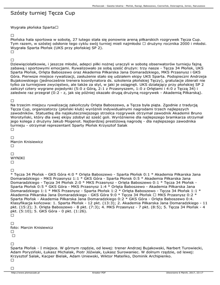 Płońszczak - Gazeta lokalna - Płońsk, Raciąż, Baboszewo, Czerwińsk, Dzierzążnia, Joniec, Naruszewo Szósty turniej Tęcza Cup Wygrała płońska Sparta Płońska hala sportowa w sobotę, 27 lutego stała się ponownie areną piłkarskich rozgrywek Tęcza Cup. Tym razem, w szóstej odsłonie tego cyklu swój turniej mieli najmłodsi drużyny rocznika 2000 i młodsi. Wygrała Sparta Płońsk (UKS przy płońskiej SP 2). Dziewięciolatkowie, i jeszcze młodsi, adepci piłki nożnej uraczyli w sobotę obserwatorów turnieju fajną zabawą i sportowymi emocjami. Rywalizowało ze sobą sześć drużyn: trzy nasze - Tęcza 34 Płońsk, UKS Sparta Płońsk, Orlęta Baboszewo oraz Akademia Piłkarska Jana Domaradzkiego, MKS Przasnysz i GKS Góra. Pierwsze miejsce rywalizacji, zasłużenie stało się udziałem ekipy UKS Sparta. Podopieczni Andrzeja Bujakowskiego (jednocześnie trenera koordynatora ds. szkolenia płońskiej Tęczy), gratulacje zbierali nie tylko za turniejowe zwycięstwo, ale także za styl, w jaki je osiągnęli. UKS działający przy płońskiej SP 2 zaliczył cztery wygrane pojedynki (5:0 z Górą, 2:1 z Przasnyszem, 1:0 z Orlętami i 4:0 z Tęczą 34) i zaledwie raz przegrał (0:2 - z, jak się później okazało drugą drużyną rozgrywek - Akademią Piłkarską). Na trzecim miejscu rywalizację zakończyły Orlęta Baboszewo, a Tęcza była piąta. Zgodnie z tradycją Tęcza Cup, organizatorzy (płoński klub) wyróżnili indywidualnymi nagrodami trzech najlepszych zawodników. Statuetkę dla najskuteczniejszego strzelca rozgrywek otrzymał zawodnik Akademii Bruno Worotyński, który dla swej ekipy zdobył aż sześć goli. Wyróżnienie dla najlepszego bramkarza otrzymał jego kolega z drużyny Jakub Mogenot. Najbardziej prestiżową nagrodę - dla najlepszego zawodnika turnieju - otrzymał reprezentant Sparty Płońsk Krzysztof Salak Marcin Knisiewicz WYNIKI * Tęcza 34 Płońsk - GKS Góra 4:0 * Orlęta Baboszewo - Sparta Płońsk 0:1 * Akademia Piłkarska Jana Domaradzkiego - MKS Przasnysz 1:1 * GKS Góra - Sparta Płonsk 0:5 * Akademia Piłkarska Jana Domaradzkiego - Tęcza 34 Płońsk 2:0 * MKS Przasnysz - Orlęta Baboszewo 0:1 * Tęcza 34 Płońsk Sparta Płońsk 0:5 * GKS Góra - MKS Przasnysz 1:4 * Orlęta Baboszewo - Akademia Piłkarska Jana Domaradzkiego 1:1 * MKS Przasnysz - Sparta Płońsk 1:2 * Orlęta Baboszewo - Tęcza 34 Płońsk 1:1 * Akademia Piłkarska Jana Domaradzkiego - GKS Góra 9:0 * Tęcza 34 Płońsk MKS Przasnysz 0:2 * Sparta Płońsk - Akademia Piłkarska Jana Domaradzkiego 0:2 * GKS Góra - Orlęta Baboszewo 0:4. Klasyfikacja końcowa: 1. Sparta Płońsk - 12 pkt. (13:3); 2. Akademia Piłkarska Jana Domaradzkiego - 11 pkt. (15:2); 3. Orlęta Baboszewo - 8 pkt. (7:3); 4. MKS Przasnysz - 7 pkt. (8:5); 5. Tęcza 34 Płońsk - 4 pkt. (5:10); 5. GKS Góra - 0 pkt. (1:26). foto: Marcin Knisiewicz Sparta Płońsk - I miejsce. W górnym rzędzie, od lewej: trener Andrzej Bujakowski, Narbert Turowiecki, Adam Poryziński, Łukasz Michalak, Piotr Jóźwiak, Łukasz Surowaniec. W dolnym rzędzie, od lewej: Krzysztof Salak, Kacper Bielak, Adam Uniewski, Wiktor Mateńko, Dominik Archipienko. http://www.plonszczak.pl Kreator PDF Utworzono 6 March, 2017, 23:17 Płońszczak - Gazeta lokalna - Płońsk, Raciąż, Baboszewo, Czerwińsk, Dzierzążnia, Joniec, Naruszewo Orlęta Baboszewo - III miejsce. W górnym rzędzie, od lewej: Radosław Cichocki, Adam Klan, Łukasz Kowalski, Jakub Zieliński, Jakub Popiołkowski, Adam Karwowski, Mikołaj Obrębski, trener Bogusław Smoliński. W dolnym rzędzie, od lewej: Piotr Jędrzejewski, Piotr Zjadewicz, Kacper Zielaskiewicz, Szymon Jakubowski, Jakub Śmigelski, Adrian Mystkowski. Tęcza 34 Płońsk - V miejsce. W górnym rzędzie, od lewej: opiekun Arkadiusz Zabłocki, Daniel Tokarski, Bartosz Zawłocki, Damian Gwiazdowski, Jakub Kubiński, Daniel Gołaszewski, Dawid Kopański, Jakub Bluszcz, trener Hubert Lewandowski. W dolnym rzędzie, od lewej: Damian Zieliński, Dawid Królikowski, Aleksander Śmigrodzki, Damian Wardziak, Patryk Chrząszczewski, Dawid Konwerski, Alan Godziński. Więcej zdjęć w Galerii http://www.plonszczak.pl Kreator PDF Utworzono 6 March, 2017, 23:17