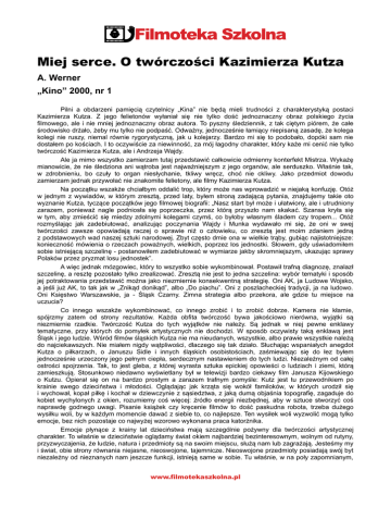 Miej serce. O twórczoci Kazimierza Kutza A. Werner „Kino” 2000, nr 1 Pilni a obdarzeni pamici czytelnicy „Kina” nie bd mieli trudnoci z charakterystyk postaci Kazimierza Kutza. Z jego felietonów wyania si nie tylko do jednoznaczny obraz polskiego ycia filmowego, ale i nie mniej jednoznaczny obraz autora. To pyszny ledziennik, z tak citym piórem, e cae rodowisko drao, eby mu tylko nie podpa. Odwany, jednoczenie amicy niepisan zasad, e kolega kolegi nie ruszy, niemal równie rygorystyczn, jak u kolejarzy. Bardzo mi si to podobao, dopóki sam nie dostaem po kociach. I to oczywicie za niewinno, za mój agodny charakter, który kae mi ceni nie tylko twórczo Kazimierza Kutza, ale i Andrzeja Wajdy. Ale ja mimo wszystko zamierzam tutaj przedstawi cakowicie odmienny konterfekt Mistrza. Wyka mianowicie, e nie ledziona ani wtroba jest najwaniejszym z jego organów, ale serduszko. Wanie tak, w zdrobnieniu, bo czuy to organ niesychanie, tkliwy wrcz, cho nie ckliwy. Jako przedmiot dowodu zamierzam jednak przywoa nie znakomite felietony, ale filmy Kazimierza Kutza. Na pocztku wszake chciabym oddali trop, który moe nas wprowadzi w niejak konfuzj. Otó w jednym z wywiadów, w którym zreszt, przed laty, byem stron zadajc pytania, znajdujemy takie oto wyznanie Kutza, tyczce pocztków jego filmowej biografii: „Nasz start by moe i uatwiony, ale i utrudniony zarazem, poniewa nagle podniosa si poprzeczka, przez któr przyszo nam skaka. Szansa krya si w tym, aby zmieci si miedzy zdolnymi kolegami czym, co byoby wasnym ladem czy tropem... Otó rozmylajc jak zadebiutowa, analizujc poczynania Wajdy i Munka wydawao mi si, e oni w swej twórczoci zawsze opowiadaj raczej o sprawie ni o czowieku, co zreszt jest moim zdaniem jedn z podstawowych wad naszej sztuki narodowej. Zbyt czsto dmie ona w wielkie trby, gubic najistotniejsze: konieczno mówienia o rzeczach powanych, wielkich, poprzez los jednostki. Sowem, gdy uwiadomiem sobie istniejc szczelin - postanowiem zadebiutowa w wymiarze jakby skromniejszym, ukazujc sprawy Polaków przez pryzmat losu jednostek”. A wic jednak mózgowiec, który to wszystko sobie wykombinowa. Postawi trafn diagnoz, znalaz szczelin, a reszt pozostao tylko zrealizowa. Zreszt nie jest to jedna szczelina: wybór tematyki i sposób jej potraktowania przedstawi mona jako niezmiernie konsekwentn strategi. Oni AK, ja Ludowe Wojsko, a jeli ju AK, to tak jak w „Znikd donikd”, albo „Do piachu”. Oni z poszlacheckiej tradycji, ja na ludowo. Oni Ksistwo Warszawskie, ja - lsk Czarny. Zimna strategia albo przekora, ale gdzie tu miejsce na uczucia? Co innego wszake wykombinowa, co innego zrobi i to zrobi dobrze. Kamera nie kamie, spójrzmy zatem od strony rezultatów. Kada obfita twórczo bywa jakociowo nierówna, wyjtki s niezmiernie rzadkie. Twórczo Kutza do tych wyjtków nie naley. S jednak w niej pewne enklawy tematyczne, przy których do pomyek artystycznych nie dochodzi. W sposób oczywisty tak enklaw jest lsk i jego ludzie. Wród filmów lskich Kutza nie ma nieudanych, wszystkie, albo prawie wszystkie nale do najciekawszych. Nie miaem nigdy wtpliwoci, dlaczego si tak dziao. Suchajc wspaniaych anegdot Kutza o pikarzach, o Januszu Sidle i innych lskich osobistociach, zamiewajc si do ez byem jednoczenie urzeczony jego penym ciepa, serdecznym nastawieniem do tych ludzi. Niezalenym od caej ostroci spojrzenia. Tak, to jest gleba, z której wyrasta sztuka epickiej opowieci o ludziach i ziemi, któr zamieszkuj. Stosunkowo niedawno wywietlany by w telewizji bardzo ciekawy film Janusza Kijowskiego o Kutzu. Opiera si on na bardzo prostym a zarazem trafnym pomyle: Kutz jest tu przewodnikiem po krainie swego dziecistwa i modoci. Ogldajc jak krzta si wokó familoków, w których urodzi si i wychowa, kopa pik i kocha w dziewczynie z ssiedztwa, z jak dum objania topografi, zagaduje do kobiet wychylonych z okien, rozumiemy co wicej: ródo energii niezbdnej, aby w sztuce stworzy co naprawd godnego uwagi. Pisanie ksiek czy krcenie filmów to do paskudna robota, trzeba duego wysiku woli, by w kadym momencie dawa z siebie to, co najlepsze. Ten wysiek woli wyzwoli mog tylko emocje, bez nich pozostaje co najwyej wzorowo wykonana praca katornika. Emocje pynce z krainy lat dziecistwa maj szczególnie poywny dla twórczoci artystycznej charakter. To wanie w dziecistwie ogldamy wiat okiem najbardziej bezinteresownym, wolnym od rutyny, przyzwyczajenia, e ludzie, natura i przedmioty s na swoim miejscu, su nam lub zagraaj. Jestemy my i wiat, obie strony równania niejasne, nieoswojone, tajemnicze. Nieoswojone przedmioty posiadaj swój byt niezaleny od nieznanych nam jeszcze funkcji, istniej same w sobie. Tu wanie, w na poy zapomnianym, www.filmotekaszkolna.pl ukrytym pod progiem wiadomoci wiecie dziecistwa bije ródo ywej, niezepsutej jeszcze przez edukacyjn tresur wyobrani. Sceny z wycieczki Kazimierza Kutza w magiczne miejsca dziecistwa i modoci s w filmie Kijowskiego montowane ze scenami, które autor „Soli ziemi czarnej” i „Pery w koronie” nasyci emocjami tak bardzo zwizanymi z krajobrazem wasnej przeszoci. Montuj si one lekko i atwo, bo przecie wyrastaj z tego samego wzoru mitycznego. Czas zmienia miejsca i ludzi, i jedynym ratunkiem staje si usytuowanie przeszoci poza czasem, a wic w sferze mitu. I wanie mitotwórcze waciwoci krainy utraconego czasu, tak bliskie materii wielkiej sztuki, skaniaj wielu twórców do uporczywego odwiedzania miejsc „ojczyzny swojej”. W naszej powojennej literaturze, a troch i w filmie, tym miejscem mitycznym jest najczciej Litwa czy szerzej - Kresy. Kutz potrafi stworzy mit pastelowego, jakby dym ze wszystkich kominów przysoni soce, lska. Najmniej entuzjastycznie ze wszystkich lskich filmów Kutza zostaa przyjta „mier jak kromka chleba”. Myl nawet, e z przesadn powcigliwoci; moim zdaniem by to udany film. Ale rzeczywicie róni si od innych filmów cyklu lskiego, moe byo w nim mniej oczekiwanej siy. Czy nie dlatego wanie, e tym razem Kutz nie lepi ju mi
