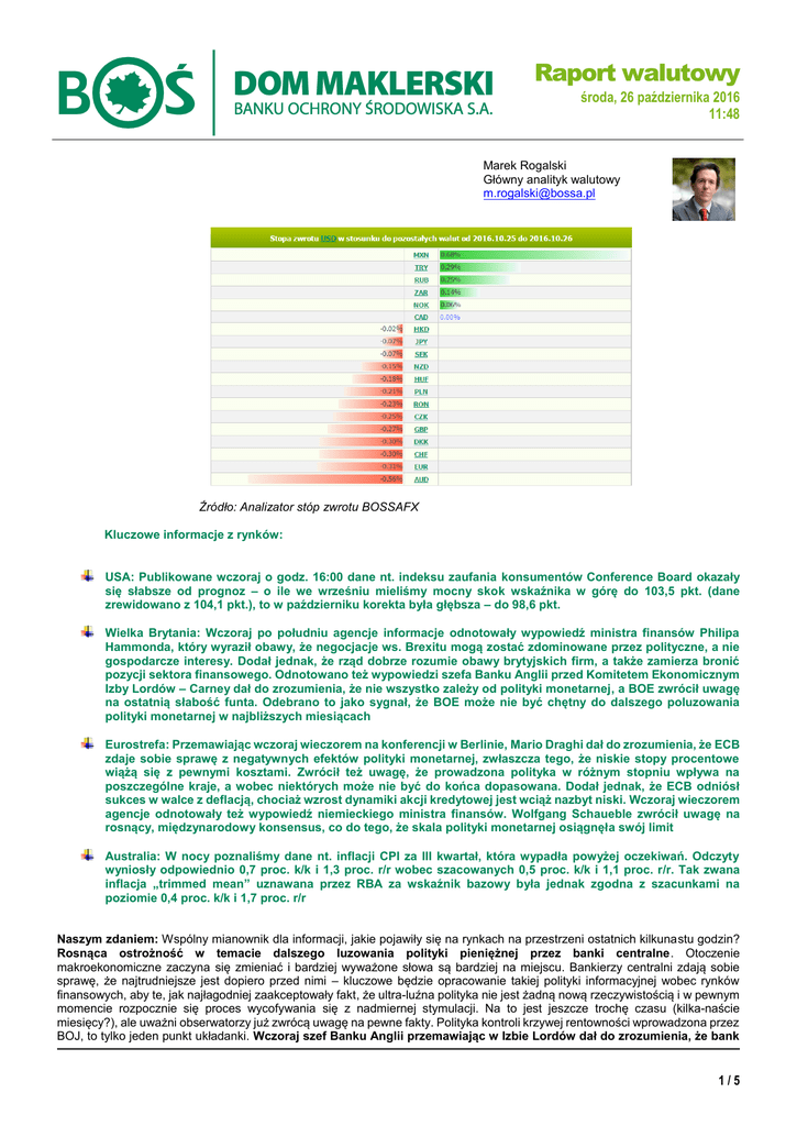 Raport walutowy środa, 26 października 2016 11:48 Marek Rogalski Główny analityk walutowy [email protected] Źródło: Analizator stóp zwrotu BOSSAFX Kluczowe informacje z rynków: USA: Publikowane wczoraj o godz. 16:00 dane nt. indeksu zaufania konsumentów Conference Board okazały się słabsze od prognoz – o ile we wrześniu mieliśmy mocny skok wskaźnika w górę do 103,5 pkt. (dane zrewidowano z 104,1 pkt.), to w październiku korekta była głębsza – do 98,6 pkt. Wielka Brytania: Wczoraj po południu agencje informacje odnotowały wypowiedź ministra finansów Philipa Hammonda, który wyraził obawy, że negocjacje ws. Brexitu mogą zostać zdominowane przez polityczne, a nie gospodarcze interesy. Dodał jednak, że rząd dobrze rozumie obawy brytyjskich firm, a także zamierza bronić pozycji sektora finansowego. Odnotowano też wypowiedzi szefa Banku Anglii przed Komitetem Ekonomicznym Izby Lordów – Carney dał do zrozumienia, że nie wszystko zależy od polityki monetarnej, a BOE zwrócił uwagę na ostatnią słabość funta. Odebrano to jako sygnał, że BOE może nie być chętny do dalszego poluzowania polityki monetarnej w najbliższych miesiącach Eurostrefa: Przemawiając wczoraj wieczorem na konferencji w Berlinie, Mario Draghi dał do zrozumienia, że ECB zdaje sobie sprawę z negatywnych efektów polityki monetarnej, zwłaszcza tego, że niskie stopy procentowe wiążą się z pewnymi kosztami. Zwrócił też uwagę, że prowadzona polityka w różnym stopniu wpływa na poszczególne kraje, a wobec niektórych może nie być do końca dopasowana. Dodał jednak, że ECB odniósł sukces w walce z deflacją, chociaż wzrost dynamiki akcji kredytowej jest wciąż nazbyt niski. Wczoraj wieczorem agencje odnotowały też wypowiedź niemieckiego ministra finansów. Wolfgang Schaueble zwrócił uwagę na rosnący, międzynarodowy konsensus, co do tego, że skala polityki monetarnej osiągnęła swój limit Australia: W nocy poznaliśmy dane nt. inflacji CPI za III kwartał, która wypadła powyżej oczekiwań. Odczyty wyniosły odpowiednio 0,7 proc. k/k i 1,3 proc. r/r wobec szacowanych 0,5 proc. k/k i 1,1 proc. r/r. Tak zwana inflacja „trimmed mean” uznawana przez RBA za wskaźnik bazowy była jednak zgodna z szacunkami na poziomie 0,4 proc. k/k i 1,7 proc. r/r Naszym zdaniem: Wspólny mianownik dla informacji, jakie pojawiły się na rynkach na przestrzeni ostatnich kilkunastu godzin? Rosnąca ostrożność w temacie dalszego luzowania polityki pieniężnej przez banki centralne. Otoczenie makroekonomiczne zaczyna się zmieniać i bardziej wyważone słowa są bardziej na miejscu. Bankierzy centralni zdają sobie sprawę, że najtrudniejsze jest dopiero przed nimi – kluczowe będzie opracowanie takiej polityki informacyjnej wobec rynków finansowych, aby te, jak najłagodniej zaakceptowały fakt, że ultra-luźna polityka nie jest żadną nową rzeczywistością i w pewnym momencie rozpocznie się proces wycofywania się z nadmiernej stymulacji. Na to jest jeszcze trochę czasu (kilka-naście miesięcy?), ale uważni obserwatorzy już zwrócą uwagę na pewne fakty. Polityka kontroli krzywej rentowności wprowadzona przez BOJ, to tylko jeden punkt układanki. Wczoraj szef Banku Anglii przemawiając w Izbie Lordów dał do zrozumienia, że bank 1/5 Raport walutowy centralny nie może lekceważyć wpływu ostatnich spadków funta (na inflację), co praktycznie oddala szanse na dalsze poluzowanie polityki (dodatkowo zwróćmy też uwagę, że zaszkodziłoby ono tamtejszemu sektorowi bankowemu, który już ma spore problemy przez niepewność związaną z negocjacjami ws. Brexitu). Z kolei szef Europejskiego Banku Centralnego zaczyna prowadzić podwójną politykę – o ile kilka dni wcześniej stanowczo ucinał spekulacje związane z możliwością redukowania skali programu QE za kilka miesięcy, o tyle wczoraj na konferencji zorganizowanej przez Bundesbank przyznał, że ultra-luźna polityka wiąże się z kosztami i nie jest do końca dopasowana do sytuacji w poszczególnych krajach. To nie tylko ukłon w stronę Niemców, którzy są coraz bardziej poirytowani tym, co robi ECB. Podobne słowa już słyszeliśmy kilka miesięcy temu. Ale nie strony ECB, a BOJ – w wakacje prezes Kuroda mówił o tym, że przy podejmowaniu decyzji o dalszym luzowaniu polityki trzeba dokonać zestawienia kosztów i korzyści z takiego ruchu. Wprawdzie wczoraj Draghi bardziej akcentował temat poziomu stóp procentowych, ale powiązania z programem QE łatwo jest znaleźć. Bo to od poziomu stopy depozytowej zależy, czy ECB może skupować dane obligacje (ich rentowności nie mogą być od niego niższe). Teoretycznie oczekuje się, że przy okazji grudniowej decyzji o wydłużeniu QE w czasie poza marzec 2017 r., zapadną też ustalenia zmieniające techniczne aspekty działania programu, ale czy ECB rzeczywiście zniesie to powiązanie – jego celem miało być nie dopuszczenie do wypaczeń na rynku długu, których i tak nie dało się uniknąć (ECB jest zbyt dużym graczem). Co, zatem ostatecznie zaproponuje Europejski Bank Centralny w grudniu? Może wzorem BOJ będzie to jakaś forma programu kontroli krzywej rentowności? Tak czy inaczej euro, funt, ale i też jen, dzisiaj odbijają w górę. Najsilniejszą walutą dzisiaj rano jest dolar australijski, którego wsparły lepsze od oczekiwań dane nt. inflacji CPI w III kwartale. Warto jednak zauważyć, że wskaźnik CPI trimmed mean, będący bazowym dla analizy trendów przez RBA nie pobił już oczekiwań, a w ujęciu kwartalnym jego dynamika jest nawet nieco niższa, niż poprzednim okresie (0,4 proc. k/k wobec 0,5 proc. k/k). Niemniej rynkowa interpretacja jest taka, że dane zmniejszają prawdopodobieństwo poluzowania polityki przez RBA w najbliższych miesiącach. I trudno odmówić jej słuszności. Warto jednak dodać, że słowo „zmniejszają” nie oznacza „wykluczają”. Naszym zdaniem ryzykiem