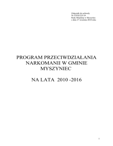 Załącznik do uchwały Nr XXXI/225/10 Rady Miejskiej w Myszyńcu z dnia 27 września 2010 roku PROGRAM PRZECIWDZIAŁANIA NARKOMANII W GMINIE MYSZYNIEC NA LATA 2010 -2016 1 MYSZYNIEC 2010 Wstęp Gminny program przeciwdziałania narkomanii został opracowany w oparciu o ustawę z dnia 29 lipca 2005 roku o przeciwdziałaniu narkomanii (Dz. U. Nr. 179, poz. 1485 z późn. zm.), z której wynika między innymi, że przeciwdziałanie narkomanii realizuje się przez odpowiednie kształtowanie polityki społecznej, oświatowo-wychowawczej i zdrowotnej, w tym m.in. poprzez działalność wychowawczą, edukacyjną i zapobiegawczą, także ograniczenie szkód zdrowotnych. Poniższy program współdziała z „Programem Gminnej Komisji Rozwiązywania Problemów Alkoholowych w Myszyńcu na 2010 rok” Ogólna charakterystyka problemu: Narkomania stała się ogólno polskim problemem społecznym. Obcość kulturowa zjawiska, często dramatyczne konsekwencje brania narkotyków, stwarza zagrożenie dla dzieci i młodzieży. Stan wiedzy społeczeństwa na temat narkotyków i narkomanii pozostawia wiele do życzenia. Dla większości osób narkoman to ktoś uzależniony od narkotyków, dla innych to osoba , która czasami używa narkotyków, dla jeszcze innych ktoś, kto obraca się w kręgach subkultury towarzyszącej narkotykom. Zarówno narkomania, jak okazjonalne używanie narkotyków mogą być definiowane w kategoriach problemu społecznego. Narkomania prowadzi do społecznej marginalizacji, współegzystuje z zachowaniami niedostosowanymi, destrukcyjnymi zagrażającymi zdrowiu i życiu. Zatacza ona coraz szersze kręgi, obejmując swym zasięgiem bliższe i dalsze środowisko osób używających i uzależnionych. Badania przeprowadzone przez Instytut Psychiatrii i Neurologii w 2007 roku na próbie losowej uczniów dwóch roczników: 15-16 lat (III kasa gimnazjum) i 17-18 lat (II klasa szkół ponadgimnazjalnych) wskazują na: Ø obniżeniu wieku inicjacji narkotykowej, Ø miejsca szczególnej dostępności narkotyków – szkoła, bar, dyskoteka, ulica, Ø szeroki wachlarz narastających problemów związanych z narkotykami doświadczanych przez młodzież tj. problemy z rodzicami, przyjaciółmi, w szkole, konflikty z prawem, Ø postawę akceptacji dla narkotyków i innych środków psychoaktywnych. Cel główny programu: Prowadzenie działań związanych z profilaktyką, ograniczenie spożywania narkotyków i substancji psychotropowych wśród młodzieży oraz integracja społeczna osób uzależnionych. Cele szczegółowe: 1. zmniejszenie problemów wynikających z używania substancji psychoaktywnych, 2. zwiększenie świadomości i poparcia dla działań podejmowanych na rzecz społeczności lokalnej, a w szczególności dzieci i młodzieży – z zakresu zapobiegania narkomanii, 3. zwiększenie liczby efektywnych programów profilaktycznych, 2 4. zmniejszenie skali problemów dotykających rodziny, a wynikających z podejmowania różnych zachowań problemowych, 5. zwiększenie umiejętności i zasobów społecznych młodzieży, niezbędnych do radzenia sobie z problemami oraz wdrożenia form profilaktyki opartych na kształtowaniu dojrzałych postaw i wartości akceptowanych społecznie, 6. promowanie zdrowego stylu życia. Zadania własne gminy i kierunki działań I. zwiększenie dostępności pomocy terapeutycznej i rehabilitacyjnej dla osób uzależnionych i zagrożonych uzależnieniem: 1. udzielanie porad i konsultacji psychologicznych dla osób uzależnionych i eksperymentujących z narkotykami oraz członków ich rodzin w ramach punktu konsultacyjnego GKRPA, 2. prowadzenie działań motywujących do podjęcia terapii, 3. rozpoczęcie współpracy z ośrodkami terapeutycznymi w celu zwiększenia dostępności do terapii stacjonarnej. II. Prowadzenie profilaktycznej działalności informacyjnej, edukacyjnej, szkoleniowej w zakresie wczesnej profilaktyki: 1. prowadzenie programów profilaktyki w szkołach, 2. dofinansowanie realizowanych programów profilaktyki na terenie szkół oraz ich koordynacja i nadzór nad ich realizacją, 3. prowadzenie profilaktycznej działalności pozaszkolnej w zakresie różnych form rekreacji i rozwoju osobistego (świetlice środowiskowe, socjoterapeutyczne, opiekuńczo wychowawcze, kluby sportowe – organizujące czas wolny dzieci i młodzieży, stanowiące alternatywę dla zażywania substancji psychoaktywnych), 4. dofinansowanie profilaktycznych i terapeutycznych obozów i kolonii dla dzieci i młodzieży z programem przeciwdziałania zażywania narkotyków i stosowania agresji. 5. promowanie programów opierających się na pracy liderów młodzieżowych w środowisku rówieśniczym, 6. realizacja profilaktyki skierowanej jednocześnie do dzieci, młodzieży, rodziców nauczycieli, 7. dożywianie dzieci uczestniczących w pozalekcyjnych programach opiekuńczo – wychowawczych, 8. dofinansowanie imprez gminnych ugruntowujących postawy promujące zdrowy styl życia, właściwe wzorce rodzinne i społeczne, 9. wspieranie i podnoszenie kwalifikacji osób pracujących z osobami uzależnionymi poprzez organizowanie i dofinansowanie szkoleń, 10. organizowanie kampanii społeczno-edukacyjnych w środowisku lokalnym poprzez: Ø opracowywanie i upowszechnianie materiałów informacyjno – edukacyjnych z zakresu promocji zdrowia i profilaktyki narkomanii ( ulotki, broszury, plakaty, filmy) Ø współpraca z mediami w zakresie upowszechniania wiedzy na temat narkomanii i związanych z nią problemów oraz w zakresie promocji zdrowego stylu życia, 3 III. Wskazywanie rodzinom, w których występuje problem narkomanii, pomocy psychospołecznej i prawnej , którą mogą uzyskać w placówkach zajmujących się rodzinami osób uzależnionych w zakresie diagnozy stanu aktualnego i koordynacji. IV. Wspomaganie działalności instytucji, organizacji pozarządowych 1. współpraca z policją w celu prowadzenia wspólnych działań profilaktycznych wynikających z u