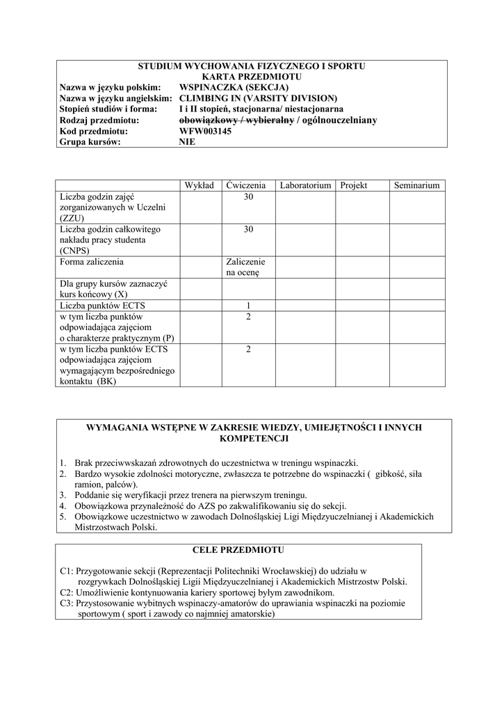 STUDIUM WYCHOWANIA FIZYCZNEGO I SPORTU KARTA PRZEDMIOTU Nazwa w języku polskim: WSPINACZKA (SEKCJA) Nazwa w języku angielskim: CLIMBING IN (VARSITY DIVISION) Stopień studiów i forma: I i II stopień, stacjonarna/ niestacjonarna Rodzaj przedmiotu: obowiązkowy / wybieralny / ogólnouczelniany Kod przedmiotu: WFW003145 Grupa kursów: NIE Wykład Liczba godzin zajęć zorganizowanych w Uczelni (ZZU) Liczba godzin całkowitego nakładu pracy studenta (CNPS) Forma zaliczenia Dla grupy kursów zaznaczyć kurs końcowy (X) Liczba punktów ECTS w tym liczba punktów odpowiadająca zajęciom o charakterze praktycznym (P) w tym liczba punktów ECTS odpowiadająca zajęciom wymagającym bezpośredniego kontaktu (BK) Ćwiczenia 30 Laboratorium Projekt Seminarium 30 Zaliczenie na ocenę 1 2 2 WYMAGANIA WSTĘPNE W ZAKRESIE WIEDZY, UMIEJĘTNOŚCI I INNYCH KOMPETENCJI 1. Brak przeciwwskazań zdrowotnych do uczestnictwa w treningu wspinaczki. 2. Bardzo wysokie zdolności motoryczne, zwłaszcza te potrzebne do wspinaczki ( gibkość, siła ramion, palców). 3. Poddanie się weryfikacji przez trenera na pierwszym treningu. 4. Obowiązkowa przynależność do AZS po zakwalifikowaniu się do sekcji. 5. Obowiązkowe uczestnictwo w zawodach Dolnośląskiej Ligi Międzyuczelnianej i Akademickich Mistrzostwach Polski. CELE PRZEDMIOTU C1: Przygotowanie sekcji (Reprezentacji Politechniki Wrocławskiej) do udziału w rozgrywkach Dolnośląskiej Ligii Międzyuczelnianej i Akademickich Mistrzostw Polski. C2: Umożliwienie kontynuowania kariery sportowej byłym zawodnikom. C3: Przystosowanie wybitnych wspinaczy-amatorów do uprawiania wspinaczki na poziomie sportowym ( sport i zawody co najmniej amatorskie) PRZEDMIOTOWE EFEKTY KSZTAŁCENIA Z zakresu wiedzy: PEK_W01: Zna aktualne przepisy zawodów wspinaczkowych – na czas, na trudność, AMP, Puchar Polski. PEK_W02: Posiada podstawową wiedzę z metodyki treningu sportowego, zwłaszcza treningu wspinaczki. Z zakresu umiejętności: PEK_U01: Opanował określony zasób zachowań techniczno - taktycznych podczas wspinaczki z dolną asekuracją w stylu on sight (bez znajomości), i RP oraz Flash (ze znajomością). PEK_U02: Jest w stanie samodzielnie przygotować się pod względem fizycznym i technicznym w okresie przerwy wakacyjnej. Z zakresu kompetencji społecznych: PEK_K01: Ma świadomość wagi aktywności fizycznej dla zdrowia fizycznego i psychicznego. PEK_K02: Promuje społeczne i kulturowe znaczenie sportu i aktywności fizycznej, pielęgnuje własne upodobania z zakresu kultury fizycznej, współpracuje w zespole, uczestniczy w rywalizacji sportowej, stosuje zasady fair play. TREŚCI PROGRAMOWE Forma zajęć – ćwiczenia Ćw. 1 Ćw. 2-14 Ćw. 15 Zajęcia organizacyjne: omówienie przeciwwskazań zdrowotnych do udziału w zajęciach sekcji wspinaczkowej, zapoznanie z regulaminem sekcji, zapoznanie się z umiejętnościami studentów. Dokonanie selekcji. Wybranie kierownika sekcji. Omówienie ogólnych zasad treningu wspinaczkowego. Ćwiczenia ogólnorozwojowe i specyficzne. Treningi techniki i umiejętności. Treningi siły, wytrzymałości, gibkości. Trening mentalny. Treningi taktyki. Planowanie swojego programu treningowego. Terapia i profilaktyka kontuzji. Prowadzenie dziennika treningu, testy samooceny rozwoju wspinaczkowego. Przygotowanie do samodzielnych treningów i wyjazdów w skały podczas wakacji. Komentarze do kart samooceny, ocena rozwoju wspinaczkowego. Zaliczenie. Suma godzin Liczba godzin 4 54 2 30 STOSOWANE NARZĘDZIA DYDAKTYCZNE N1. Trening sportowy. N2. Wykład. N3. Zawody sportowe. N4. Ćwiczenia praktyczne. OCENA OSIĄGNIĘCIA PRZEDMIOTOWYCH EFEKTÓW KSZTAŁCENIA Oceny (F – formująca (w Numer efektu Sposób oceny osiągnięcia efektu kształcenia trakcie semestru), P – kształcenia podsumowująca (na koniec semestru) F1 PEK_W01,W02 Odpowiedź ustna, demonstracja studenta. Zawody wspinaczkowe. F2 PEK_ U01,U02 Zawody wspinaczkowe. Przejścia dróg wspinaczkowych w hali i w skałach. F3 PEK_ K02 Współorganizowanie ewentów wspinaczkowych. P Frekwencja, aktywność i postawa na zajęciach oraz średnia ocen F1, F2, F3. LITERATURA PODSTAWOWA I UZUPEŁNIAJĄCA LITERATURA PODSTAWOWA: [1] Horst E.J.: Trening Wspinaczkowy. Warszawa: RM, 2011. [2] Macia D.: Planowanie treningu we wspinaczce sportowej. Wydawnictwo: Sudetica Verticalia Wrocław 2008. LITERATURA UZUPEŁNNIAJĄCA: [1] Dróżdż P. (pod red.): 100 porad gór. Wydawnictwo: Góry Books 2011. [2] Hague D., Hunter D.: Wspinaczka skałkowa. Poradnik. Wydawnictwo: Bellona Warszawa 2009. OPIEKUN PRZEDMIOTU (IMIĘ, NAZWISKO, ADRES E-MAIL) Bogna Jakubowicz, [email protected] MACIERZ POWIĄZANIA EFEKTÓW KSZTAŁCENIA DLA PRZEDMIOTU WSPINACZKA SPORTOWA SEKCJA Przedmiotowy Odniesienie przedmiotowego efektu efekt kształcenia do efektów kształcenia zdefiniowanych dla obszarowych efektów kształcenia Posiada podstawową wiedzę z zakresu wybranej dyscypliny sportu (kursu wf) spośród kilkudziesięciu oferowanych Posiada podstawowe umiejętności z PEK_U01 (umiejętności) zakresu dyscyplin, którą wybrał, posiada, umiejętność włączenia się w PEK_U02 prozdrowotny styl życia z wybraniem aktywności na całe życie oraz kształtowania postaw sprzyjających całożyciowej aktywności fizycznej. Promuje społeczne i kulturowe PEK_K01 (kompetencje), znaczenie sportu i aktywności fizycznej oraz pielęgnuje własne PEK_K02 upodobania z zakresu kultury fizycznej. PEK_W01 (wiedza) PEK_W02 Cele Treści Numer narzędzia przedmiotu** programowe** dydaktycznego** C1, C2, C3 Ćw. 1-15 1, 2, 3, 4 C1, C2, C3 Ćw. 1-15 1, 2, 3, 4 C1, C2, C3 Ćw. 1-15 1, 2, 3, 4 C1, C2, C3 Ćw. 1-15 1, 2, 3, 4 C1, C2, C3 Ćw. 1-15 1, 2, 3, 4