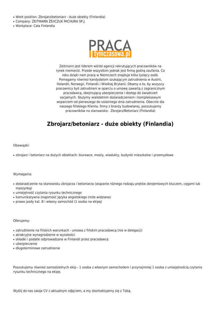 ● ● ● Work position: Zbrojarz/betoniarz - duże obiekty (Finlandia) Company: ZEITMANN ŻEńCZUK MICHURA SP.J. Workplace: Cała Finlandia Zeitmann jest liderem wśród agencji rekrutujących pracowników na rynek niemiecki. Przede wszystkim jednak jest firmą godną zaufania. Co roku dzięki nam pracę w Niemczech znajduje kilka tysięcy osób. Pomagamy również kandydatom szukającym zatrudnienia w Austrii, Holandii, Norwegii, Finlandii i Wielkiej Brytanii. Dbamy o to, by wszyscy pracownicy byli zatrudnieni w oparciu o umowę zawartą z zagranicznym pracodawcą, obejmującą ubezpieczenie i dostęp do świadczeń socjalnych. Służymy wieloletnim doświadczeniem i kompleksowym wsparciem od pierwszego do ostatniego dnia zatrudnienia. Obecnie dla naszego fińskiego Klienta, firmy z branży budowlanej, poszukujemy pracowników na stanowisko: Zbrojarz/Betoniarz (Finlandia) Zbrojarz/betoniarz - duże obiekty (Finlandia) Obowiązki: ● zbrojarz i betoniarz na dużych obiektach: biurowce, mosty, wiadukty, budynki mieszkalne i przemysłowe Wymagania: ● ● ● ● doświadczenie na stanowisku zbrojarza i betoniarza (wiązanie różnego rodzaju prętów zbrojeniowych kluczem, cęgami lub maszynką) umiejętność czytania rysunku technicznego komunikatywna znajomość języka angielskiego (mile widziana) prawo jazdy kat. B i własny samochód (1 osoba na ekipę) Oferujemy: ● ● ● ● ● zatrudnienie na fińskich warunkach - umowa z fińskim pracodawcą (nie w delegacji) atrakcyjne wynagrodzenie w wysokości składki i podatki odprowadzane w Finlandii przez pracodawcę ubezpieczenie długoterminowe zatrudnienie Poszukujemy również samodzielnych ekip - 1 osoba z własnym samochodem i przynajmniej 1 osoba z umiejętnością czytania rysunku technicznego na ekipę. Wyślij do nas swoje CV z aktualnym zdjęciem, a my skontaktujemy się z Tobą. Masz pytania? Zadzwoń do nas! Jesteśmy do Twojej dyspozycji od poniedziałku do piątku w godzinach 9-17 pod numerem tel. 12 661 64 00. Chcesz jako pierwszy wiedzieć o najnowszych ofertach pracy? Polub naszą stronę na Facebooku. Życzymy powodzenia! Zespół Rekrutacji Zeitmann Informujemy, że administratorem zbieranych danych osobowych jest Zeitmann sp.j., ul. Walerego Sławka 3, 30-633 Kraków (nr wpisu do rejestru agencji zatrudnienia: 9212). Pani/Pana dane osobowe przetwarzane będą w celach rekrutacyjnych i mogą być udostępniane innym odbiorcom w ramach prowadzonych projektów rekrutacyjnych. Posiada Pani/Pan prawo dostępu do treści swoich danych oraz ich poprawiania, a podanie Spółce danych osobowych jest dobrowolne. Wysłanie do nas CV jest jednoznaczne z wyrażeniem zgody na przetwarzanie danych osobowych, udostępnianie ich klientom w ramach prowadzonych projektów rekrutacyjnych oraz na otrzymywanie w przyszłości nowych ofert pracy i informacji marketingowych z naszej firmy. W przypadku nie wyrażenia zgody prosimy o odesłanie wiadomości zwrotnej wraz z stosowną informacją. Aplikuj Dane kontaktowe: ZEITMANN ŻEńCZUK MICHURA SP.J. Send Save Print Tweet