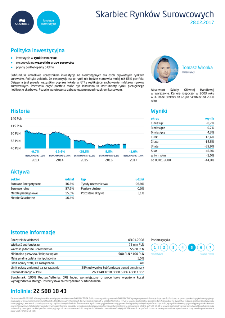 Skarbiec Rynków Surowcowych 28.02.2017 Polityka inwestycyjna • • • inwestycje w rynki towarowe ekspozycja na wszystkie grupy surowców Tomasz Wronka płynny portfel oparty o ETFy Subfundusz umożliwia uczestnikom inwestycje na niedostępnych dla osób prywatnych rynkach surowców. Polityka zakłada, że ekspozycja na te rynki nie będzie stanowiła mniej niż 66% portfela. Osiągana jest przede wszystkim poprzez lokaty w ETFy replikujące zachowanie indeksów rynków surowcowych. Pozostała część portfela może być lokowana w instrumenty rynku pieniężnego i obligacje skarbowe. Pozycje walutowe są zabezpieczane przed ryzykiem kursowym. Historia 140 PLN140 PLN RYNK SUROWC 140 PLN RYNK SUROWC 140 PLN RYNK SUROWC 140 PLN RYNK SUROWC 140 PLN 115 PLN115 PLN 115 PLN 115 PLN 115 PLN 115 PLN 90 PLN 90 PLN 90 PLN 90 PLN 90 PLN 90 PLN 65 PLN 65 PLN 65 PLN 40 PLN 40 PLN -9,7% 65 PLN 40 PLN 40 PLN -19,6% 65 PLN 40 PLN 8,5% Absolwent Szkoły Głównej Handlowej w Warszawie. Karierę rozpoczął w 2003 roku w X-Trade Brokers. W Grupie Skarbiec od 2008 roku. Wyniki okres wynik 1 miesiąc -0,7% 3 miesiące 0,7% 6 miesięcy 65 PLN 40 PLN -28,5% RYNK SUROWC zarządzający -1,0% BENCHMARK: -7,9% BENCHMARK: -21,8% BENCHMARK: -27,5% BENCHMARK: -6,1% BENCHMARK: -1,8% 2013 2014 2015 2016 2017 4,3% 1 rok 12,4% 2 lata -18,6% 3 lata -39,9% 5 lat -48,9% w tym roku -1,0% od 03.01.2008 -44,8% Aktywa sektor udział typ udział Surowce Energetyczne 36,5% Tytuły uczestnictwa 96,9% Surowce rolne 37,6% Papiery dłużne 0,0% Metale przemysłowe 15,5% Pozostałe aktywa 3,1% Metale Szlachetne 10,4% Istotne informacje Początek działalności 03.01.2008 Wielkość subfunduszu 73 mln PLN Wartość jednostki uczestnictwa Minimalna pierwsza / kolejna wpłata Maksymalna opłata manipulacyjna Limit opłaty stałej za zarządzanie Limit opłaty zmiennej za zarządzanie Rachunek nabyć w PLN 55,20 PLN 500 PLN / 100 PLN Poziom ryzyka 1 2 niższe ryzyko 3 4 5 6 7 wyższe ryzyko 5,5% 4% 25% od wyniku Subfunduszu ponad benchmark 26 1140 1010 0000 5206 4600 1002 Benchmark: 100% Reuters/Jefferies CRB Index, pomniejszony o procentowo wyrażony koszt wynagrodzenia stałego Towarzystwa za zarządzanie Subfunduszem Infolinia: 22 588 18 43 Dane na dzień 28.02.2017. Wykresy i wyniki stanowią opracowania własne SKARBIEC TFI SA. Subfundusz wydzielony w ramach SKARBIEC FIO. Wymagane prawem informacje dotyczące Subfunduszu, w tym o czynnikach ryzyka inwestycyjnego, znajdują się w prospekcie informacyjnym SKARBIEC FIO i kluczowych informacjach dla inwestora dostępnych w siedzibie SKARBIEC TFI SA, w serwisie skarbiec.pl i w sieci sprzedaży. Subfundusz nie gwarantuje realizacji określonego celu i wyniku inwestycyjnego, a uczestnik ponosi ryzyko utraty części wpłaconych środków. Prezentowane wyniki inwestycyjne nie stanowią gwarancji osiągnięcia podobnych wyników w przyszłości, są wynikiem inwestycyjnym osiągniętym w konkretnym okresie historycznym. Tabela opłat manipulacyjnych oraz informacje o podatku bezpośrednio obciążającym dochód z inwestycji dostępne są pod numerem infolinii: (22) 588 18 43, w serwisie skarbiec.pl. Wartość aktywów netto cechuje się dużą zmiennością ze względu na skład portfela inwestycyjnego lub na stosowane techniki zarządzania. Subfundusz może lokować więcej niż 35% wartości aktywów funduszu w papiery wartościowe wyemitowane, poręczone lub gwarantowane przez Skarb Państwa lub NBP.