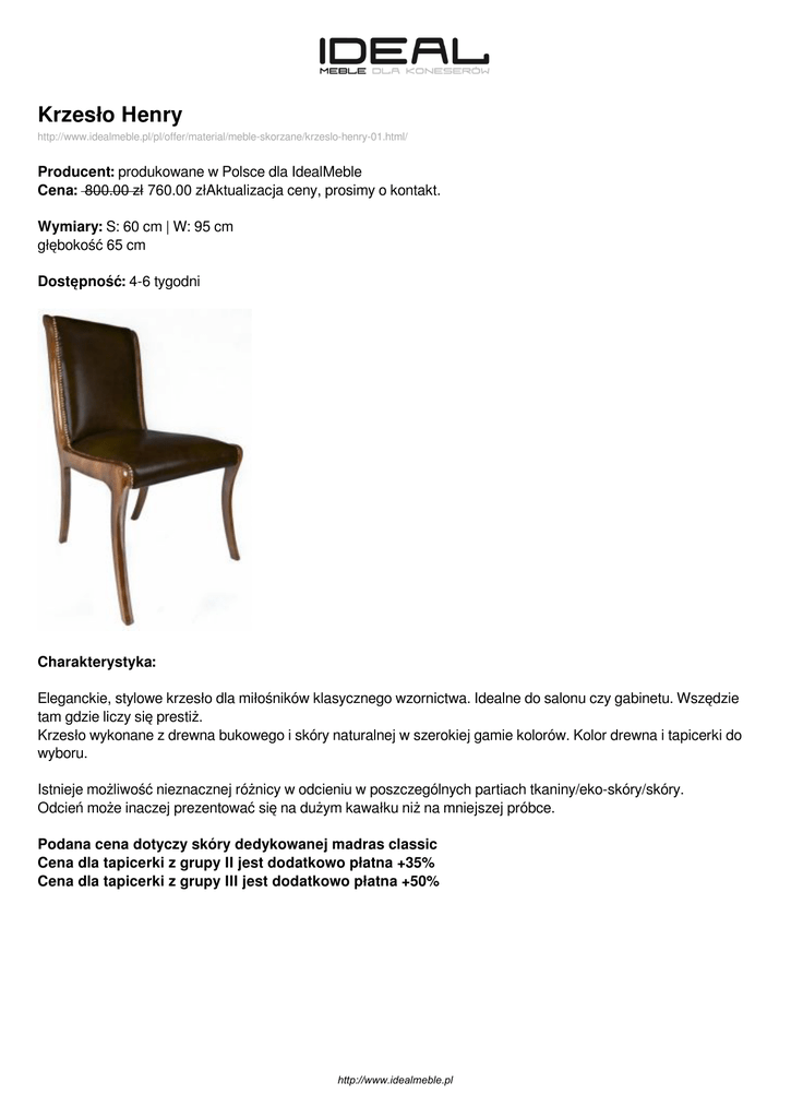 Krzesło Henry http://www.idealmeble.pl/pl/offer/material/meble-skorzane/krzeslo-henry-01.html/ Producent: produkowane w Polsce dla IdealMeble Cena: 800.00 zł 760.00 złAktualizacja ceny, prosimy o kontakt. Wymiary: S: 60 cm | W: 95 cm głębokość 65 cm Dostępność: 4-6 tygodni Charakterystyka: Eleganckie, stylowe krzesło dla miłośników klasycznego wzornictwa. Idealne do salonu czy gabinetu. Wszędzie tam gdzie liczy się prestiż. Krzesło wykonane z drewna bukowego i skóry naturalnej w szerokiej gamie kolorów. Kolor drewna i tapicerki do wyboru. Istnieje możliwość nieznacznej różnicy w odcieniu w poszczególnych partiach tkaniny/eko-skóry/skóry. Odcień może inaczej prezentować się na dużym kawałku niż na mniejszej próbce. Podana cena dotyczy skóry dedykowanej madras classic Cena dla tapicerki z grupy II jest dodatkowo płatna +35% Cena dla tapicerki z grupy III jest dodatkowo płatna +50% http://www.idealmeble.pl http://www.idealmeble.pl Zdjęcia produktu: http://www.idealmeble.pl Powered by TCPDF (www.tcpdf.org)