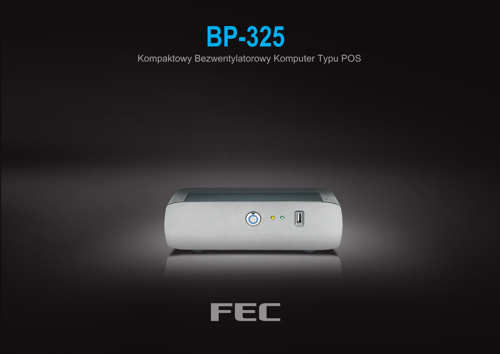 BP-325 Kompaktowy Bezwentylatorowy Komputer Typu POS BP-325 Dążymy do zaspokojenia Państwa oczekiwań poprzez dostarczenie stylowo wykonanych produktów wysokiej jakości. BP-325 to kopaktowy, bezwentylatorowy komputer POS z procesorem Intel® Atom™ D525, 1.8GHz. BP-325 został zaprojektowany tak, by dzięki radiatorom i aluminiowej obudowie skutecznie odprowadzać ciepło i zapewnić niezawodność działania. Komputer ten posiada cztery różne warianty interfejsów wejść/wyjść, dzięki czemu można go dostosować do konkretnych zastosowań biznesowych. 2in1 MSR + RFID 2in1 MSR + iButton 2in1 MSR + Czytnik linii papilarnych RFID Czytnik linii papilarnych iButton Cechy • Połączenie BP-325 z AerMonitorem i innymi urządzeniami dodatkowymi daje nam kompletne rozwiązanie typu POS. Typ A: Standard • Wiele interfejsów wejść/wyjść pozwala na zastosowanie w różnych aplikacjach. • Może być użyty jako urządzenie typu kiosk dla rozwiązań samoobsługowych. • Modułowa budowa ułatwia konserwację. Typ B: Dual VGA Opcjonalnie SATA DOM Łatwy dostęp do dysku HDD lub SSD. Dzięki specjalnemu systemowi odprowadzania ciepła BP-325 zawsze zachowuje odpowiednią temperaturę pracy. BP-325 może zostać przytwierdzone do każdej płaskiej powierzchni dzięki specjalnemu mocowaniu. Przycisk zasilania, wskaźnik połączenia internetowego, wskaźnik dysku twardego oraz port USB zostały umieszczone na płycie czołowej. Typ C: Drukarka 24V Typ D: Dual LAN Wygodny dostęp do płyty głównej. BP-325 waży zaledwie 2,4 kilograma Ma niezwykle kompaktową budowę: 23cm szerokości, 6,5cm wysokości oraz 19cm głębokości. Zastosuj swoje własne Logo MSR Specyfikacja Model BP-325A Procesor Intel® Atom™ D525, 1MB L2 Cache, 1.8GHz Pamięć Standard 1GB, Maksymalnie 4GB (1 x 204-pin DDR3) Zasilanie 60W (12V / 5A) zewnętrzny zasilacz Twardy dysk 1 x 2.5” SATA HDD lub SATA SSD Opcjonalny twardy dysk 1 x SATA DOM Chipset Intel® GMA 3150 Konstrukcja Obudowa aluminiowa Kolor obudowy Szary BP-325B BP-325C BP-325D Port szeregowy: COM1, COM6 (DB9) COM3, COM5 (RJ-45) Wyjście DC: 1 x 24V DIN 3p do drukarki; 1 x Mic-in Port szeregowy: COM1, COM3, COM5, COM6 (DB9) Port LAN: 1x RJ45 Giga LAN; 1 x Mic-in Porty wejść/wyjść Port Szeregowy 2 x Zewnętrzne: COM2 (DB9) COM4 (RJ45) Port USB 5 x Zewnętrznych (1 x Front, 4 x Tył) Port Drukarki 1 x Dwukierunkowy port równoległy Port Szuflady 1 x RJ11 (12V) Klawiatura / Mysz 1 x PS/2 Port LAN 1 x RJ45 Giga LAN Gniazdo Rozszerzeń 1 x Mini PCI-e (wewnętrzny) Port Audio 1 x Wyjście liniowe Port Wideo 1 x VGA, 1 x DVI-D Wyjście DC 1 x 12V DC Jack 2.5 mm Górna płytka wejść/wyjść Dodatkowe wejścia/wyjścia Port szeregowy: COM1, COM3, COM5, COM6 (DB9); 1 x Mic-in Port szeregowy COM1, COM6 (DB9), COM3, COM5 (RJ45) Port Wideo: 1 x VGA; DC Wyjście: 1 x 24V; 1 x Mic-in Obsługiwane systemy operacyjne Windows Windows XP, POSReady 2009, Windows 7, POSReady 7 Wymiary fizyczne Wymiary (szer x wys x głęb) 230.24 x 65 x 190.04 mm Wymiary kartonu (szer x wys x głęb) 400 x 130 x 245 mm Waga 2.4kg (Netto), 3.5kg (Brutto)
