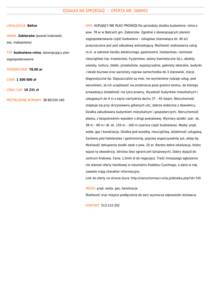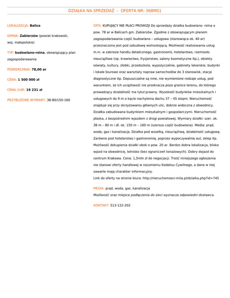 DZIAŁKA NA SPRZEDAŻ - OFERTA NR: 368MS1 LOKALIZACJA: Balice GMINA: Zabierzów (powiat krakowski, woj. małopolskie) OPIS: KUPUJĄCY NIE PŁACI PROWIZJI Do sprzedaży działka budowlano- rolna o pow. 78 ar w Balicach gm. Zabierzów. Zgodnie z obowiązującym planem zagospodarowania część budowlano – usługowa (stanowiąca ok. 40 ar) przeznaczona jest pod zabudowę wolnostojącą. Możliwość realizowania usług TYP: budowlano-rolna, obowiązujący plan m.in. w zakresie handlu detalicznego, gastronomii, hotelarstwo, rzemiosło zagospodarowania nieuciążliwe (np. krawiectwo, fryzjerstwo, salony kosmetyczne itp.), obiekty oświaty, kultury, żłobki, przedszkola, wypożyczalnie, gabinety lekarskie, budynki POWIERCHNIA: 78,00 ar CENA: 1 500 000 zł i lokale biurowe oraz warsztaty napraw samochodów do 3 stanowisk, stacje diagnostyczne itp. Dopuszczalne są inne, nie wymienione rodzaje usług, pod warunkiem, że ich uciążliwość nie przekracza poza granice terenu, do którego CENA /1AR: 19 231 zł PRZYBLIŻONE WYMIARY: 38-80/150-160 prowadzący działalność ma tytuł prawny. Wysokość budynków mieszkalnych i usługowych do 9 m o kącie nachylenia dachu 37 – 45 stopni. Nieruchomość znajduje się przy skrzyżowaniu głównych ulic, dobrze widoczna z obwodnicy. Działka zabudowana budynkiem mieszkalnym i gospodarczymi. Nieruchomość płaska, z bezpośrednim wjazdem z drogi powiatowej. Wymiary działki: szer. ok. 38 m – 80 m i dł. ok. 150 m – 160 m (szersza część budowlana). Media: prąd, woda, gaz i kanalizacja. Działka pod wszelką, nieuciążliwą, działalność usługową. Zarówno pod hotelarstwo i gastronomię, poprzez wypoczywalnię aut, sklep itp. Możliwość dokupienia działki obok o pow. 20 ar. Bardzo dobra lokalizacja, blisko wjazd na obwodnicę, lotnisko (bez ograniczeń tonażowych). Dobry dojazd do centrum Krakowa. Cena: 1,5mln zł do negocjacji. Treść niniejszego ogłoszenia nie stanowi oferty handlowej w rozumieniu Kodeksu Cywilnego, a dane w niej zawarte mają charakter informacyjny. Link do oferty na stronie biura: http://nieruchomosci-mila.pl/dzialka.php?id=745 MEDIA: prąd, woda, gaz, kanalizacja Możliwość oraz miejsce podłączenia do sieci wyznacza odpowiedni dostawca. KONTAKT: 513-122-202 TREŚĆ NINIEJSZEGO OGŁOSZENIA NIE STANOWI OFERTY HANDLOWEJ W ROZUMIENIU KODEKSU CYWILNEGO, A DANE W NIEJ ZAWARTE MAJĄ CHARAKTER INFORMACYJNY I MOGĄ ULEC ZMIANIE NIERUCHOMOŚCI MILA | 30-148 Kraków, ul. Lindego 1 | www.nieruchomosci-mila.pl