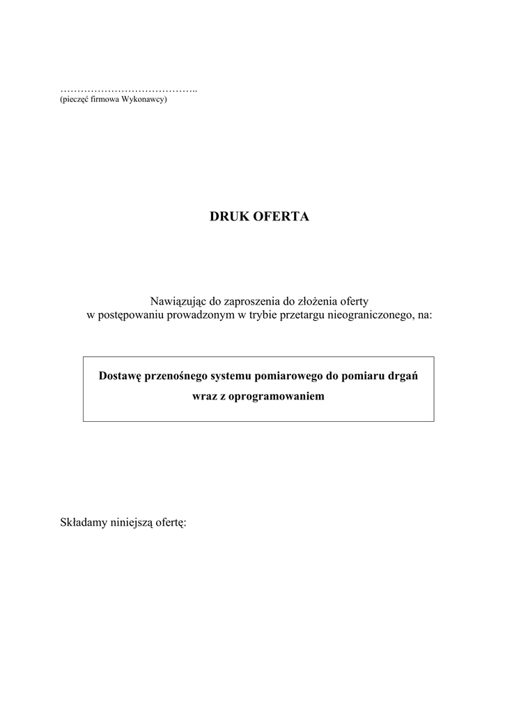 ………………………………….. (pieczęć firmowa Wykonawcy) DRUK OFERTA Nawiązując do zaproszenia do złożenia oferty w postępowaniu prowadzonym w trybie przetargu nieograniczonego, na: Dostawę przenośnego systemu pomiarowego do pomiaru drgań wraz z oprogramowaniem Składamy niniejszą ofertę: Nazwa i adres ZAMAWIAJĄCEGO: AKADEMIA TECHNICZNO-HUMANISTYCZNA ul. Willowa 2 43-309 Bielsko-Biała Nazwa Wykonawcy: ……………………………………………………………………………………………………… ………………………………………………………………………………………………… Adres Wykonawcy: ul.: …………………………………………… nr budynku: …………………………………... kod pocztowy: ………………………………. miejscowość: …………………………………. Tel.: ………………………….Fax.: ………………………………e-mail: …………………… REGON: …………………………………….. NIP: …………………………………………... Numer właściwego rejestru lub numer wpisu do ewidencji działalności gospodarczej: ………. …………………………………………………………………………………………………... Bank: …………………………………………………………………………………………… Nr konta: ……………………………………………………………………………………….. I. Wykonanie przedmiotu zamówienia oferuję za: Wartość ofertowa brutto (z Załącznika nr 1): ........................................... zł słownie: ................................................................................................................................... zł Wartość ofertowa netto (z Załącznika nr 1): ........................................... zł słownie: ................................................................................................................................... zł II. Deklaruję ponadto: 1. Termin dostawy nie przekroczy 8 tygodni od dnia podpisania umowy. 2. Warunki płatności: 14 dniowy termin płatności od pełnej realizacji przedmiotu zamówienia i wystawienia faktury VAT. III. Oświadczamy, że: 1. Oświadczamy zgodnie z art. 44 ustawy Pzp, że spełniamy warunki udziału w postępowaniu określone w SIWZ oraz, że zapoznaliśmy się ze SIWZ i uznajemy się za związanych określonymi w niej warunkami i zasadami postępowania oraz zawartymi w niej istotnymi warunkami umowy. 2. Oświadczamy, że uważamy się za związanych niniejszą ofertą na czas wskazany w SIWZ, tj. 30 dni od daty jej otwarcia. 3. Oświadczamy, że oferujemy przedmiot zamówienia zgodny z wymaganiami i warunkami opisanymi w ustawie Pzp oraz określonymi przez Zamawiającego w SIWZ. 4. Akceptujemy warunki przyszłej umowy zawarte we „Wzorze umowy” i w przypadku wybrania naszej oferty zobowiązujemy się do podpisania umowy na warunkach zawartych w SIWZ w terminie i miejscu wskazanym przez Zamawiającego. 5. Szkolenie pracowników z zakresu obsługi urządzenia w ramach zawartej umowy wyniesie …………. godzin. 6. Okres gwarancji obejmujące całe urządzenie określone w SIWZ liczy się od daty podpisania Protokołu zdawczo-odbiorczego i wynosi: ………………….……(minimum 12 miesięcy). 7. Zapewniamy serwis gwarancyjny. Czas reakcji na wezwanie Zamawiającego nie może przekroczyć 2 dni roboczych. Naprawa uszkodzonego sprzętu nie może przekroczyć 14 dni roboczych. 8. Oświadczamy, że niniejsze zamówienie, w zakresie serwisu gwarancyjnego powierzone zostanie następującym podwykonawcom (podać co i zakres oraz nazwę podwykonawcy z danymi teleadresowymi. ........................................................................................................................................................... .......................................................................................................................................................... .......................................................................................................................................................... .......................................................................................................................................................... IV. Do kontaktów ze strony naszej Firmy upoważniamy: ......................................................................................... tel. ...................................., fax ...................................... ……………………………… (data) ………………………………………. (podpis i pieczęć osoby uprawnionej do składania oświadczeń woli w imieniu Wykonawcy Załącznik nr 2 ………………………………….. (pieczęć firmowa Wykonawcy) Oświadczenie Zgodnie z art. 22 ust. 1 ustawy „Prawo zamówień Publicznych” Przystępując do udziału w postępowaniu o zamówienie publiczne na: „Dostawę przenośnego systemu pomiarowego do pomiaru drgań wraz z oprogramowaniem” w trybie przetargu nieograniczonego zgodnie z art. 22 ust. 1 ustawy Pzp oświadczam, że firma: ……………………………………………………………………………. Nazwa Wykonawcy ……………………………………………………………………………. ……………………………………………………………………………. Adres …………………………………………………………………………….. …………………………………………………………………………….. 1. Posiada uprawnienia do wykonywania określonej działalności lub czynności. 2. Posiada niezbędną wiedzę i doświadczenie oraz dysponuje potencjałem technicznym i osobami zdolnymi do wykonania zamówienia, 3. Znajduje się w sytuacji ekonomicznej i fi
