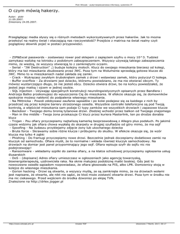 Piotr Witczak - audyt bezpieczenstwa informacji, systemów IT O czym mówią hakerzy. Autor: piotr 11.05.2007. Zmieniony 24.05.2007. Przeglądając media słyszy się o różnych metodach wykorzystywanych przez hakerów. Jak to mozna przełożyć na realny świat i otaczającą nas rzeczywistość? Przejście z matrixa na świat realny czyli poglądowy słownik pojeć w postaci przypowieści. - ZIP&Excel passwords - zostawiasz rower pod sklepem z zapięciem szyfru o mocy 10^3. Tudzież zamykasz walizkę na lotnisku z podobnym zabezpieczeniem. Wszyscy używają takiego zabezpieczenia mimo, że wiedzą, że wszyscy otwierają to z zamkniętymi oczami. - Serial - "JW Destruction" ;) buduje kolejny moloch. Klucz do swojego mieszkania bierzesz od kolegi, który ma też mieszkanie zbudowane przez JWC. Poza tym na Wolumenie sprzedają gotowe klucze do JWC. Mimo to w mieszkaniach nadal zakłada się zamki. - Crack - Wykręcasz zwykłym śrubokrętem zamek z drzwi i wstawiasz zamek, który pożyczył Ci kolega. - Buffer overflow - Za drzwiami jest dziecko, któremu powiedziano, że ma nie otwierać obcym. Ty mówisz wystarczająco długo, że nie jesteś obcy. Dziecko otwiera drzwi, bo na końcu powiedziałeś, że jesteś jego matką i ojcem w jednej osobie. - SQL injection - Używając specjalnych konstrukcji neurolingwistycznych opisanych przez Bandlera i Andrzeja Batko przekonujesz do wpuszczenia Cię do mieszkania. W efekcie okazuje się, że domowników spokojnie możesz nakłonić do podpalenia własnego mieszkania. - Na Mittnicka - Powoli zdobywasz zaufanie sąsiadów i po kolei podajesz się za każdego z nich by przedrzeć się przez kolejne bariery strzeżonego osiedla. Wszystkie centralki telefoniczne są pod Twoją kontrolą, a właściciel mieszkania sam podaje Ci typy zamków we wszystkich drzwiach i zapasowe klucze - Backdoor - Twojego domu bronią tytanowe drzwi. Złodziej wchodzi przez balkon od Twojego znajomego - Man in the middle - Twoja żona przekazuje Ci klucz przez kuriera Masterlink, ten po drodze dorabia klucz - Trojan - Psu ofiary przyczepiamy najtańszą kamerkę bezprzewodową z Allegro plus podsłuch. Po jakimś czasie widzimy jak ofiara chowa wypłatę do skarpety w drugiej szufladzie od góry mimo, że ma sejf - Spoofing - Na Judaszu przyklejamy zdjęcie żony lub ukochanego dziecka - Brute force - Skrawamy sobie różne klucze i próbujemy do skutku. W efekcie okazuje się, że wzór klucza ma tylko 4 ząbki - Phishing - Do framugi przyczepiamy nowe drzwi. Bezczelnie jednak doczepiamy dodatkowe zamki na kluczyk od samochodu. Ofiara myśli, że to normalne i wkłada również kluczyk samochodowy. Na drzwiach na domiar jest panel przypominający jego sejf. Ofiara wpisuje szyfr do sejfu nic nie podejrzewając! - Ransomware - wkładamy szpilki do zamka ofiary, a na klatce schodowej przyczepiamy ogłoszenia usług ślusarskich - DoS - (dopisane) Adres ofiary umieszczasz w ogłoszeniach jako agencję towarzyską, bioenergoterapeutę, uzdrowiciela raka. Na oknie malujesz podobiznę matki boskiej. Gdy jest to nowoczesne osiedle sąsiadom rozpowiadasz, że ofiara głosowała na PIS, albo LPR. Domownicy stoją w kolejce do własnego mieszkania. - Gorion hacking - Drzwi są otwarte, a wszyscy myślą, ze są zamknięte mimo, że na drzwiach wołami jest napisane, że otwarte, ale nikt nie sądzi, że ktoś może zostawić otwarte drzwi. Poza tym w środku nie ma nic ciekawego. Przed wejściem do środka dzwonisz po ekipę TVN. Znalezione na http://drlex.jogger.pl http://www.witczak.priv.pl Kreator PDF Utworzono 7 March, 2017, 00:17