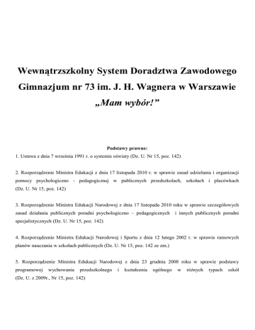 Wewnątrzszkolny System Doradztwa Zawodowego Gimnazjum nr 73 im. J. H. Wagnera w Warszawie „Mam wybór!” Podstawy prawne: 1. Ustawa z dnia 7 września 1991 r. o systemie oświaty (Dz. U. Nr 15, poz. 142) 2. Rozporządzenie Ministra Edukacji z dnia 17 listopada 2010 r. w sprawie zasad udzielania i organizacji pomocy psychologiczno - pedagogicznej w publicznych przedszkolach, szkołach i placówkach (Dz. U. Nr 15, poz. 142) 3. Rozporządzenie Ministra Edukacji Narodowej z dnia 17 listopada 2010 roku w sprawie szczegółowych zasad działania publicznych poradni psychologiczno – pedagogicznych i innych publicznych poradni specjalistycznych (Dz. U. Nr 15, poz. 142) 4. Rozporządzenie Ministra Edukacji Narodowej i Sportu z dnia 12 lutego 2002 r. w sprawie ramowych planów nauczania w szkołach publicznych (Dz. U. Nr 15, poz. 142 ze zm.) 5. Rozporządzenie Ministra Edukacji Narodowej z dnia 23 grudnia 2008 roku w sprawie podstawy programowej wychowania przedszkolnego (Dz. U. z 2009r., Nr 15, poz. 142) i kształcenia ogólnego w różnych typach szkół Spis treści Wstęp ........................................................................................................................................................ 2 Cele ogólne programu ............................................................................................................................... 2 Cele szczegółowe w podziale na adresatów programu ............................................................................. 3 A. Uczniowie.............................................................................................................................................. 3 B. Rodzice .................................................................................................................................................. 3 C. Nauczyciele i wychowawcy ................................................................................................................... 3 4. Zadania realizatorów programu ................................................................................................................ 3 A. Dyrekcja ................................................................................................................................................ 4 B. Koordynator do spraw doradztwa zawodowego................................................................................... 4 C. Pedagog i psycholog szkolny ................................................................................................................ 4 D. Nauczyciele i wychowawcy ................................................................................................................... 4 E. Pracownicy biblioteki ........................................................................................................................... 4 F. Instytucje wspierające szkolny system doradztwa edukacyjno-zawodowego ....................................... 4 5. Formy i treści realizacji programu ............................................................................................................ 4 A. Formy realizacji programu ................................................................................................................... 4 B. Treści tematyczne realizowane na poszczególnych poziomach nauczania........................................... 5 C. Przykładowe treści z zakresu doradztwa zawodowego realizowane na lekcjach przedmiotowych...... 5 6. Przewidywane rezultaty ............................................................................................................................ 6 A. Uczniowie i ich rodzice ......................................................................................................................... 6 B. Nauczyciele i wychowawcy ................................................................................................................... 6 1. 2. 3. 1. Wstęp Wewnątrzszkolny System Doradztwa Zawodowego (WSDZ) jest dokumentem określającym program działań z zakresu doradztwa edukacyjno-zawodowego, realizowany na terenie danej placówki szkolnej. Działania proponowane w programie „Mam wybór!”, realizowanym na terenie Gimnazjum nr 73 w Warszawie, pozwalają uczniom i ich rodzicom rozpoznać predyspozycje i preferencje zawodowe uczniów, przyjrzeć się ich mocnym i słabym stronom, określić ich cechy osobowościowe i temperamentalne mające znaczenie w planowaniu dalszej ścieżki edukacyjnozawodowej, a także zapoznać się z propozycją edukacyjną warszawskich szkół ponadgimnazjalnych. Efektem działań zawartych w WSDZ ma być świadomy i dojrzały wybór szkoły ponadgimnazjalnej przez uczniów, wsparty przez ich rodziców, opiekunów i nauczycieli. 2. Cele ogólne programu - przygotowanie uczniów do podjęcia decyzji o dalszym kształceniu i aktywności zawodowej - tworzenie i aktualizowanie bazy informacyjnej z zakresu doradztwa zawodowego - poradnictwo dla rodziców wspierających dzieci w dokonywaniu wyborów edukacyjno-zawodowych - wspieranie nauczycieli i wychowawców w realizacji zadań z zakresu doradztwa zawodowego - współpraca z instytucjami wspierającymi szkolny system doradztwa edukacyjno-zawodowego 2 3. Cele szczegółowe w podziale na adresatów programu A. Uczniowie - poznanie siebie, to jest swoich zainteresowań, umiejętności, cech osobowości i temperamentu - rozpoznanie własnych predyspozycji i preferencji zawodowych - kształtowanie w uczniach umiejętności skutecznej autoprezentacji i komunikacji - zapoznanie uczniów z możliwymi drogami dalszego kształcenia (przybliżenie różnic pomiędzy liceum, technikum i szkołą zawodową) - dostarczenie uczniom informacji na temat szkół ponadgimnazjalnych i istniejących zawodów - zapoznanie uczniów z aktualnymi trendami na rynku pracy - wspieranie uczniów w podejmowaniu decyzji edukacyjno-zawodowych z uwzględnieniem ich stanu fizycznego, zdrowotnego 