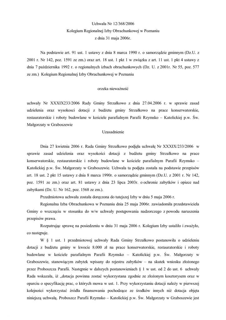 Uchwała Nr 12/368/2006 Kolegium Regionalnej Izby Obrachunkowej w Poznaniu z dnia 31 maja 2006r. Na podstawie art. 91 ust. 1 ustawy z dnia 8 marca 1990 r. o samorządzie gminnym (Dz.U. z 2001 r. Nr 142, poz. 1591 ze zm.) oraz art. 18 ust. 1 pkt 1 w związku z art. 11 ust. 1 pkt 4 ustawy z dnia 7 października 1992 r. o regionalnych izbach obrachunkowych (Dz. U. z 2001r. Nr 55, poz. 577 ze zm.) Kolegium Regionalnej Izby Obrachunkowej w Poznaniu orzeka nieważność uchwały Nr XXXIX233/2006 Rady Gminy Strzałkowo z dnia 27.04.2006 r. w sprawie zasad udzielenia oraz wysokosci dotacji z budżetu gminy Strzałkowo na prace konserwatorskie, restauratorskie i roboty budowlane w kościele parafialnym Parafii Rzymsko – Katolickiej p.w. Św. Małgorzaty w Graboszewie Uzasadnienie Dnia 27 kwietnia 2006 r. Rada Gminy Strzałkowo podjęła uchwałę Nr XXXIX/233/2006 w sprawie zasad udzielenia oraz wysokości dotacji z budżetu gminy Strzałkowo na prace konserwatorskie, restauratorskie i roboty budowlane w kościele parafialnym Parafii Rzymsko – Katolickiej p.w. Św. Małgorzaty w Graboszewie. Uchwała ta podjęta została na podstawie przepisów art. 18 ust. 2 pkt 15 ustawy z dnia 8 marca 1990r. o samorządzie gminnym (Dz.U. z 2001 r. Nr 142, poz. 1591 ze zm.) oraz art. 81 ustawy z dnia 23 lipca 2003r. o ochronie zabytków i opiece nad zabytkami (Dz. U. Nr 162, poz. 1568 ze zm.). Przedmiotowa uchwała została doręczona do tutejszej Izby w dniu 5 maja 2006 r. Regionalna Izba Obrachunkowa w Poznaniu dnia 25 maja 2006r. zawiadomiła przedstawiciela Gminy o wszczęciu w stosunku do w/w uchwały postępowania nadzorczego z powodu naruszenia przepisów prawa. Rozpatrując sprawę na posiedzeniu w dniu 31 maja 2006 r. Kolegium Izby ustaliło i zważyło, co następuje. W § 1 ust. 1 przedmiotowej uchwały Rada Gminy Strzałkowo postanowiła o udzieleniu dotacji z budżetu gminy w kwocie 8.000 zł na prace konserwatorskie, restauratorskie i roboty budowlane w kościele parafialnym Parafii Rzymsko – Katolickiej p.w. Św. Małgorzaty w Graboszewie, stanowiącym zabytek wpisany do rejestru zabytków – na skutek wniosku złożonego przez Proboszcza Parafii. Następnie w dalszych postanowieniach § 1 w ust. od 2 do ust. 6 uchwały Rada wskazała, iż „dotacja powinna zostać wykorzystana zgodnie ze złożonym kosztorysem oraz w oparciu o specyfikację prac, o których mowa w ust. 1. Przy wykorzystaniu dotacji należy w pierwszej kolejności wykorzystać źródła finansowania pochodzące ze środków innych niż dotacja objęta niniejszą uchwałą. Proboszcz Parafii Rzymsko – Katolickiej p.w. Św. Małgorzaty w Graboszewie jest zobowiązany do wykorzystania dotacji zgodnie z przeznaczeniem. Podstawą do rozliczenia dotacji będzie porozumienie, które zostanie podpisane przez Wójta Gminy Strzałkowo oraz przez Proboszcza Parafii. Termin rozliczenia dotacji powinien nastąpić nie później niż do 20 grudnia 2006 r. W razie wykorzystania dotacji w sposób niezgodny z przeznaczeniem lub niewykorzystania dotacji w całości podlega ona zwrotowi do budżetu gminy w odpowiedniej części”. W § 2 wykonanie uchwały powierzono Wójtowi Gminy Strzałkowo. Określając termin wejścia w życie uchwały Rada Gminy Strzałkowo postanowiła w § 3, iż wejdzie ona w życie z dniem podjęcia. Z powyższych ustaleń wynika, że uchwałą Nr XXXIX/233/2006 z dnia 27.04.2006r. Rada Gminy Strzałkowo, działając na podstawie upoważnienia z art. 81 ust. 1 ustawy o ochronie zabytków i opiece nad zabytkami udzieliła dotacji konkretnemu podmiotowi, a następnie dla tego podmiotu określiła zasady wykorzystania i rozliczania dotacji sprzecznie z powołanym przepisem art. 81 ust. 1 ustawy. Rada nie ustaliła zasad udzielania dotacji. W świetle bowiem wskazanego art. 81 ust. 1 ustawy o ochronie zabytków i opiece nad zabytkami organ stanowiący gminy najpierw powinien podjąć uchwał określającą zasady udzielania dotacji obowiązujące na terenie Gminy i odnoszące się do ogółu podmiotów mogących ubiegać się o dotację na prace konserwatorskie, restauratorskie i roboty budowlane przy zabytku wpisanym do rejestru, a następnie udzielić dotacji konkretnemu podmiotowi. O sposobie i terminie rozliczenia dotacji w tym wykorzystanych niezgodnie z przeznaczeniem przesądzają postanowienia zawarte w art. 145, 146 oraz w art. 190 ustawy z dnia 30 czerwca 2005 r. o finansach publicznych. Nadto uchwała określająca ogólne zasady udzielania dotacji, jako akt prawa miejscowego, podlega ogłoszeniu w Dzienniku Urzędowym zgodnie z ustawą z dnia 20 lipca 2000r. o ogłaszaniu aktów normatywnych i niektórych innych aktów prawnych (Dz. U. Nr 62, poz. 718 ze zm.). Mając powyższe na uwadze Kolegium orzekło jak na wstępie. Pouczenie: Na niniejsze rozstrzygnięcie nadzorcze przysługuje prawo wniesienia skargi do Wojewódzkiego Sądu Administracyjnego w Poznaniu w terminie trzydziestu dni od daty jego doręczenia, za pośrednictwem Kolegium Regionalnej Izby Obrachunkowej w Poznaniu.