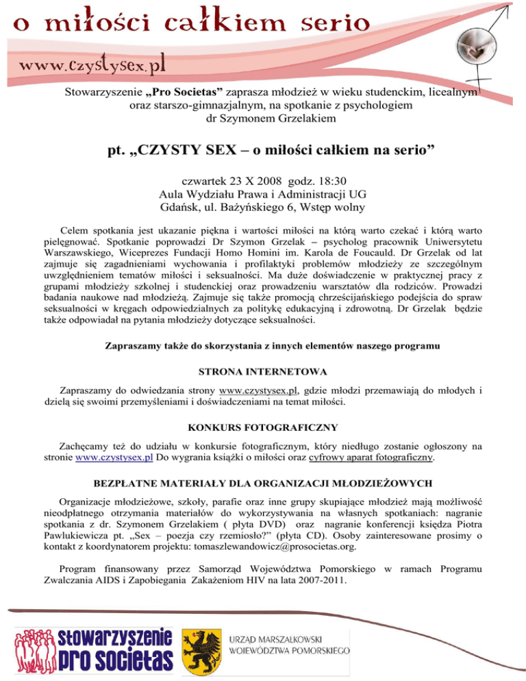 Stowarzyszenie „Pro Societas” zaprasza młodzieŜ w wieku studenckim, licealnym oraz starszo-gimnazjalnym, na spotkanie z psychologiem dr Szymonem Grzelakiem pt. „CZYSTY SEX – o miłości całkiem na serio” czwartek 23 X 2008 godz. 18:30 Aula Wydziału Prawa i Administracji UG Gdańsk, ul. BaŜyńskiego 6, Wstęp wolny Celem spotkania jest ukazanie piękna i wartości miłości na którą warto czekać i którą warto pielęgnować. Spotkanie poprowadzi Dr Szymon Grzelak – psycholog pracownik Uniwersytetu Warszawskiego, Wiceprezes Fundacji Homo Homini im. Karola de Foucauld. Dr Grzelak od lat zajmuje się zagadnieniami wychowania i profilaktyki problemów młodzieŜy ze szczególnym uwzględnieniem tematów miłości i seksualności. Ma duŜe doświadczenie w praktycznej pracy z grupami młodzieŜy szkolnej i studenckiej oraz prowadzeniu warsztatów dla rodziców. Prowadzi badania naukowe nad młodzieŜą. Zajmuje się takŜe promocją chrześcijańskiego podejścia do spraw seksualności w kręgach odpowiedzialnych za politykę edukacyjną i zdrowotną. Dr Grzelak będzie takŜe odpowiadał na pytania młodzieŜy dotyczące seksualności. Zapraszamy takŜe do skorzystania z innych elementów naszego programu STRONA INTERNETOWA Zapraszamy do odwiedzania strony www.czystysex.pl, gdzie młodzi przemawiają do młodych i dzielą się swoimi przemyśleniami i doświadczeniami na temat miłości. KONKURS FOTOGRAFICZNY Zachęcamy teŜ do udziału w konkursie fotograficznym, który niedługo zostanie ogłoszony na stronie www.czystysex.pl Do wygrania ksiąŜki o miłości oraz cyfrowy aparat fotograficzny. BEZPŁATNE MATERIAŁY DLA ORGANIZACJI MŁODZIEśOWYCH Organizacje młodzieŜowe, szkoły, parafie oraz inne grupy skupiające młodzieŜ mają moŜliwość nieodpłatnego otrzymania materiałów do wykorzystywania na własnych spotkaniach: nagranie spotkania z dr. Szymonem Grzelakiem ( płyta DVD) oraz nagranie konferencji księdza Piotra Pawlukiewicza pt. „Sex – poezja czy rzemiosło?” (płyta CD). Osoby zainteresowane prosimy o kontakt z koordynatorem projektu: [email protected]. Program finansowany przez Samorząd Województwa Pomorskiego w ramach Programu Zwalczania AIDS i Zapobiegania ZakaŜeniom HIV na lata 2007-2011.
