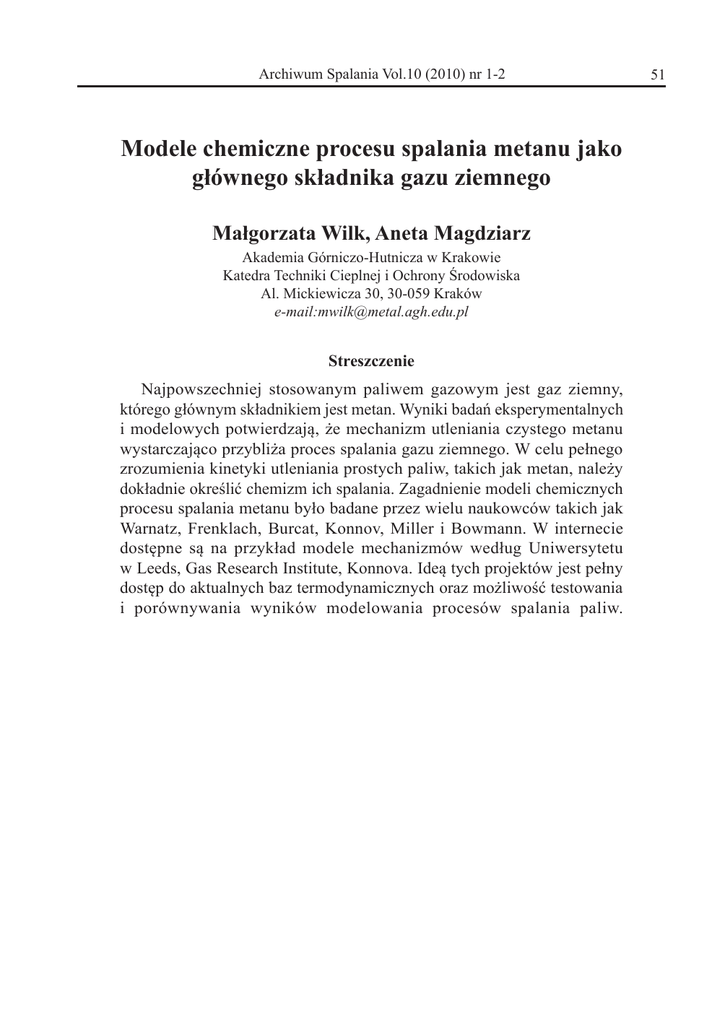 Archiwum Spalania Vol.10 (2010) nr 1-2 Modele chemiczne procesu spalania metanu jako głównego składnika gazu ziemnego Małgorzata Wilk, Aneta Magdziarz Akademia Górniczo-Hutnicza w Krakowie Katedra Techniki Cieplnej i Ochrony Środowiska Al. Mickiewicza 30, 30-059 Kraków e-mail:[email protected] Streszczenie Najpowszechniej stosowanym paliwem gazowym jest gaz ziemny, którego głównym składnikiem jest metan. Wyniki badań eksperymentalnych i modelowych potwierdzają, że mechanizm utleniania czystego metanu wystarczająco przybliża proces spalania gazu ziemnego. W celu pełnego zrozumienia kinetyki utleniania prostych paliw, takich jak metan, należy dokładnie określić chemizm ich spalania. Zagadnienie modeli chemicznych procesu spalania metanu było badane przez wielu naukowców takich jak Warnatz, Frenklach, Burcat, Konnov, Miller i Bowmann. W internecie dostępne są na przykład modele mechanizmów według Uniwersytetu w Leeds, Gas Research Institute, Konnova. Ideą tych projektów jest pełny dostęp do aktualnych baz termodynamicznych oraz możliwość testowania i porównywania wyników modelowania procesów spalania paliw. 51