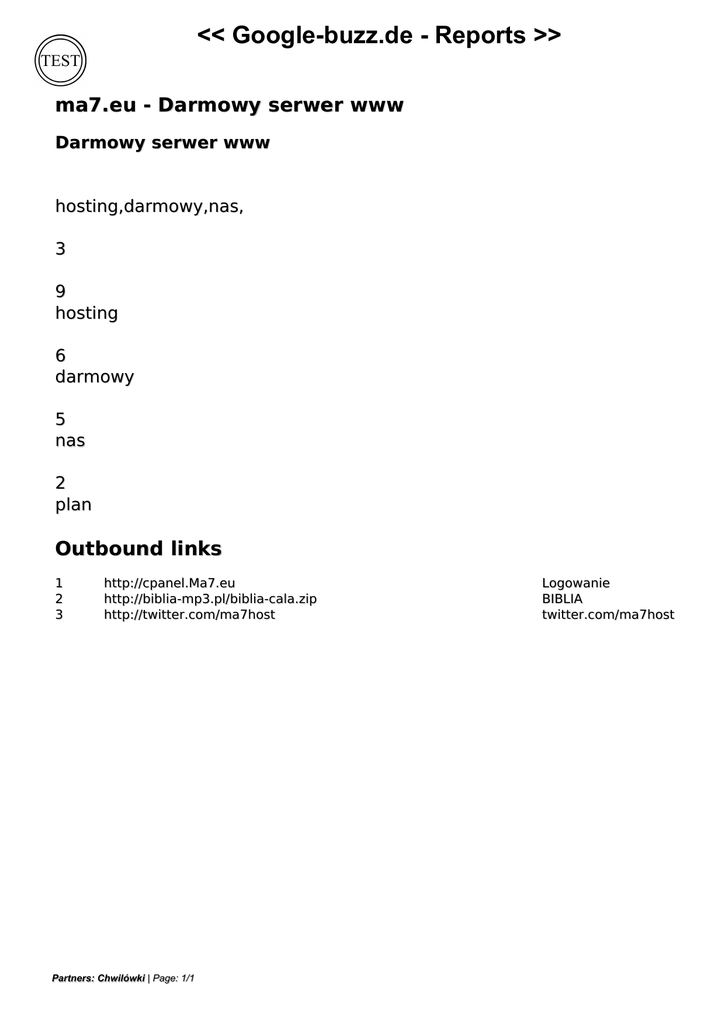 << Google-buzz.de - Reports >> ma7.eu - Darmowy serwer www Darmowy serwer www hosting,darmowy,nas, 3 9 hosting 6 darmowy 5 nas 2 plan Outbound links 1 2 3 http://cpanel.Ma7.eu http://biblia-mp3.pl/biblia-cala.zip http://twitter.com/ma7host Partners: Chwilówki | Page: 1/1 Powered by TCPDF (www.tcpdf.org) Powered by TCPDF (www.tcpdf.org) Logowanie BIBLIA twitter.com/ma7host