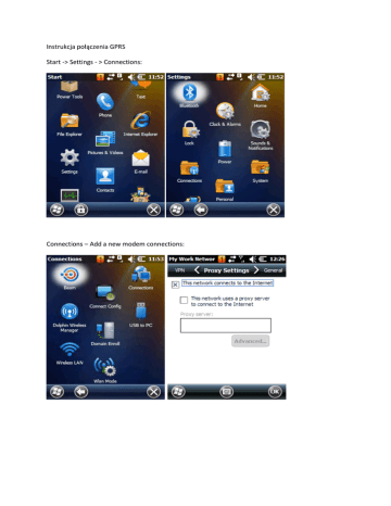 Instrukcja połączenia GPRS Start -> Settings - > Connections: Connections – Add a new modem connections: