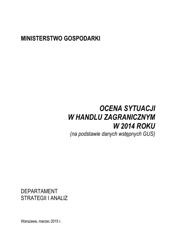 MINISTERSTWO GOSPODARKI OCENA SYTUACJI W HANDLU ZAGRANICZNYM W 2014 ROKU (na podstawie danych wstępnych GUS) DEPARTAMENT STRATEGII I ANALIZ Warszawa, marzec 2015 r. Misją Ministerstwa Gospodarki jest stworzenie najlepszych w Europie warunków prowadzenia działalności gospodarczej. Spis treści Synteza ............................................................................................................................ 5 1. Koniunkturalne uwarunkowania zmian obrotów towarowych w 2014 roku ................... 6 2. Zmiany obrotów w przekroju geograficznym ................................................................ 9 3. Zmiany obrotów w przekroju towarowym ................................................................... 16 4. Projekcja obrotów towarowych na rok 2015 ............................................................... 20 3 Synteza W 2014 r. eksport towarów z Polski wzrósł o 5,2%, osiągając wartość 163,1 mld EUR. Natomiast import wyniósł 165,6 mld EUR i był o 5,5% wyŜszy niŜ w roku 2013. W rezultacie deficyt obrotów towarowych osiągnął 2,4 mld EUR, czyli poziom o ok. 460 mln EUR wyŜszy niŜ w roku 2013. W 2014 roku, inaczej niŜ w kilku poprzednich latach, zdecydowanie lepsze wyniki eksportu osiągnięto z rynkami rozwiniętymi gospodarczo (gdzie eksport wzrósł o 7,7%, do ok. 136,8 mld EUR), niŜ z rynkami słabiej rozwiniętymi (gdzie wywóz spadł o 5,8%, do ok. 26,4 mld EUR). Jednocześnie nadwyŜka obrotów z rynkami rozwiniętymi gospodarczo osiągnęła 28,4 mld EUR, czyli powiększyła się o 5 mld EUR, natomiast deficyt z rynkami słabiej rozwiniętymi wyniósł 30,9 mld EUR, czyli pogłębił się o prawie 5,5 mld EUR. Wywóz do UE – będącej odbiorcą 77% sprzedaŜy zagranicznej Polski – zwiększył się w 2014 roku o 8,1% (do 125,8 mld EUR). Wolniejszy wzrost po stronie importu z UE przełoŜył się na powiększenie nadwyŜki wymiany z tą grupa państw o 4,3 mld EUR, do 28,8 mld EUR. Wśród waŜniejszych partnerów eksportowych Polski w UE, najszybciej wzrósł wywóz do: Łotwy (o 23,4%), Hiszpanii (o 15,5%), Niderlandów (o 10,6%), Włoch (o 10%), Niemiec (o 9,5%) oraz Belgii (o 7,8%). NajwaŜniejsze towary dominujące w eksporcie do UE to: części i pojazdy samochodowe (11,4 mld EUR), meble (6,4 mld EUR), aparatura odbiorcza dla telewizji (3,6 mld EUR) oraz aparatura do telefonii i telegrafii przewodowej (2,8 mld EUR). Notowany w 2014 r. spadek sprzedaŜy do szerokiej grupy rynków rozwijających się wynikał ze zmniejszenia eksportu do WNP (o 16,8%, do ok. 12,8 mld EUR), w tym do Rosji o 14%, na Ukrainę o 27% i na Białoruś o 11,9%. Jednocześnie import z tej grupy rynków spadł o 3,2% (do 21,2 mld EUR), w tym z Rosji o 8,7%. W rezultacie deficyt obrotów z WNP wyniósł 8,4 mld EUR, czyli pogłębił się w stosunku do poprzedniego roku o prawie 1,9 mld EUR. Względnie szybko natomiast wzrosła sprzedaŜ na inne niŜ WNP rynki rozwijające się – o 7,4%, do 13,6 mld EUR. Szczególnie dynamicznie w tej grupie państw zwiększył się eksport do Algierii (blisko 2-krotnie), Zjednoczonych Emiratów Arabskich (o 48%), Arabii Saudyjskiej (o 36,7%), Hongkongu (o 17,1%), Singapuru (o ok. 12%) oraz Indii (o 11,3%). W przekroju towarowym szybko zwiększył się eksport wyrobów przemysłu lekkiego (o 11,8%) oraz dominujących w polskich obrotach towarowych, wyrobów elektromaszynowych (o 6,3%). Z drugiej strony w 2014 r. odnotowano wyhamowanie wywozu artykułów rolno-spoŜywczych, których sprzedaŜ, inaczej niŜ w dwóch poprzednich latach, zwiększyła się wolniej niŜ przeciętnie, tj. o 4,5%. W 2014 r. pogorszenie salda obrotów odnotowano w przypadku 5 grup towarowych, w tym największe w wymianie wyrobami: chemicznymi (pogłębienie deficytu o ponad 0,7 mld EUR, do ok. 6,5 mld EUR), metalurgicznymi (przekształcenie nadwyŜki ok. 650 mln EUR w deficyt ok. 1,5 mln EUR), przemysłu lekkiego (zwiększenie deficytu o 640 mln EUR, do prawie 2,7 mld EUR).. Z drugiej strony poprawa bilansu nastąpiła w wymianie artykułami rolno-spoŜywczymi (zwiększenie nadwyŜki o ok. 440 mln EUR, do prawie 6,6 mld EUR). 5 1. Koniunkturalne uwarunkowania zmian obrotów towarowych w 2014 roku W generalnie optymistycznych projekcjach koniunktury światowej prezentowanych przez międzynarodowe ośrodki analityczno-prognostyczne na początku ubiegłego roku przewidywano, Ŝe znaczące oŜywienie globalnej gospodarki odnotowane w II półroczu 2013 roku będzie kontynuowane w roku 2014 i 2015, głównie za sprawą wzrostu aktywności w gospodarkach wysoko rozwiniętych. Zakładano, wówczas, Ŝe wzrost produktu globalnego przyśpieszy z 3% w roku 2013 do 3,7% w roku 2014 oraz do około 4% w roku 2015. Obserwowane wówczas duŜe oŜywienie popytu finalnego w gospodarkach dojrzałych - było głównie efektem odbudowy zapasów. Na rynkach wschodzących i rozwijających się główną siłą napędową oŜywienia był eksport, podczas, gdy popyt wewnętrzny, z wyjątkiem Chin, utrzymywał się na niskim poziomie. Na przełomie 2013 i 2014 r. w gospodarkach rozwiniętych zanotowano złagodzenie warunków finansowania, a takŜe nastąpiły dalsze obniŜki premii za ryzyko finansowania długu rządowego w gospodarkach strefy euro, dotkniętych kryzysem. Odmiennie na rynkach wschodzących – tam zostały utrzymane zaostrzone warunki finansowania. W optymistycznych projekcjach IMF ze stycznia 2014 r. przewidywano przyśpieszenie wzrostu gospodarki światowej z 3% w roku 2013 do 3,7% w roku 2014. Projekcja przyśpieszenia wzrostu gospodarczego w USA z 1,9% w roku 2013 do 2,8%, w 2014 r. opierała się głównie na załoŜeniu wyraźnego oŜywienia popytu wewnętrznego. Zakładano równieŜ wówczas, Ŝe strefa euro ostatecznie upora się z recesją i wejdzie na ścieŜkę oŜywienia gospodarczego i osiągnie w roku 2014 wzrost PKB w wysokości 1% oraz na poziomie 1,4% w roku 2015. Jednocześnie przewidywano, Ŝe tempo wzrostu poszczególnych kr