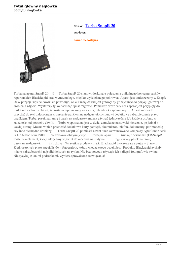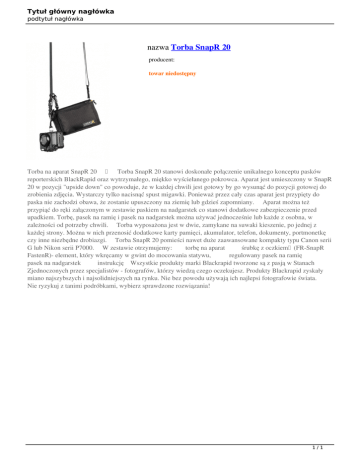 Tytuł główny nagłówka podtytuł nagłówka nazwa Torba SnapR 20 producent: towar niedostępny Torba na aparat SnapR 20 Torba SnapR 20 stanowi doskonałe połączenie unikalnego konceptu pasków reporterskich BlackRapid oraz wytrzymałego, miękko wyściełanego pokrowca. Aparat jest umieszczony w SnapR 20 w pozycji "upside down" co powoduje, że w każdej chwili jest gotowy by go wysunąć do pozycji gotowej do zrobienia zdjęcia. Wystarczy tylko nacisnąć spust migawki. Ponieważ przez cały czas aparat jest przypięty do paska nie zachodzi obawa, że zostanie upuszczony na ziemię lub gdzieś zapomniany. Aparat można też przypiąć do ręki załączonym w zestawie paskiem na nadgarstek co stanowi dodatkowe zabezpieczenie przed upadkiem. Torbę, pasek na ramię i pasek na nadgarstek można używać jednocześnie lub każde z osobna, w zależności od potrzeby chwili. Torba wyposażona jest w dwie, zamykane na suwaki kieszenie, po jednej z każdej strony. Można w nich przenosić dodatkowe karty pamięci, akumulator, telefon, dokumenty, portmonetkę czy inne niezbędne drobiazgi. Torba SnapR 20 pomieści nawet duże zaawansowane kompakty typu Canon serii G lub Nikon serii P7000. W zestawie otrzymujemy: torbę na aparat śrubkę z oczkiem (FR-SnapR FastenR)- element, który wkręcamy w gwint do mocowania statywu, regulowany pasek na ramię pasek na nadgarstek instrukcję Wszystkie produkty marki Blackrapid tworzone są z pasją w Stanach Zjednoczonych przez specjalistów - fotografów, którzy wiedzą czego oczekujesz. Produkty Blackrapid zyskały miano najszybszych i najsolidniejszych na rynku. Nie bez powodu używają ich najlepsi fotografowie świata. Nie ryzykuj z tanimi podróbkami, wybierz sprawdzone rozwiązania! 1/1