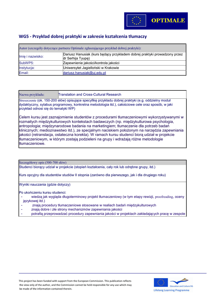 WG5 - Przykład dobrej praktyki w zakresie kształcenia tłumaczy Autor (szczegóły dotyczące partnera Optimale zgłaszającego przykład dobrej praktyki): Imię i nazwisko: SubWP5: Instytucja: Email: Nazwa przykładu: Dariusz Hanusiak (kurs będący przykładem dobrej praktyki prowadzony przez dr Serhija Tyupę) Zapewnienie jakości/kontrola jakości Uniwersytet Jagielloński w Krakowie [email protected] Translation and Cross-Cultural Research Streszczenie (ok. 150-200 słów) opisujące specyfikę przykładu dobrej praktyki (e.g. oddzielny moduł dydaktyczny, sylabus programowy, konkretna metodologia itd.), całościowe cele oraz sposób, w jaki przykład odnosi się do tematyki WP) Celem kursu jest zaznajomienie studentów z procedurami tłumaczeniowymi wykorzystywanymi w rozmaitych międzykulturowych kontekstach badawczych (np. międzykulturowa psychologia, antropologia; międzynarodowe badania na marketingiem; tłumaczenie dla potrzeb badań klinicznych; medioznawstwo itd.), ze specjalnym naciskiem położonym na narzędzia zapewniania jakości (retranslacja, ostateczna korekta). W ramach kursu studenci biorą udział w projekcie tłumaczeniowym, w którym zostają podzieleni na grupy i wdrażają różne metodologie tłumaczeniowe. Szczegółowy opis (500-700 słów) Studenci biorący udział w projekcie (stopień kształcenia, cały rok lub odrębne grupy, itd.) Kurs opcyjny dla studentów studiów II stopnia (zarówno dla pierwszego, jak i dla drugiego roku) Wyniki nauczania (gdzie dotyczy) Po ukończeniu kursu studenci: wiedzą jak wygląda długoterminowy projekt tłumaczeniowy (w tym etapy rewizji, proofreading, oceny językowej itd.) znają procedury tłumaczeniowe stosowane w realiach badań międzykulturowych znają dobre i złe strony mechanizmów zapewniania jakości potrafią przeprowadzać procedury zapewniania jakości w projektach zakładających pracę w zespole This project has been funded with support from the European Commission. This publication reflects the view only of the author, and the Commission cannot be held responsible for any use which may be made of the information contained therein. Wdrożone metodologie nauczania Kurs pokazuje studentom specyficzne cechy procesu przekładu w rozmaitych międzykulturowych kontekstach badawczych (np. międzykulturowa psychologia, antropologia; międzynarodowe badania na marketingiem; tłumaczenie dla potrzeb badań klinicznych; medioznawstwo itd.). Szczególny nacisk zostaje także położony na podstawy teoretyczne omawianych zagadnień, m. in.: - zwrot kulturowy w badaniach nad przekładem - przekład w kontekście postkolonialnym - narody i stereotypy - skrypty kulturowe - międzynarodowe badania marketingowe - psychologia międzykulturowa - ekwiwalencja w badaniach nad przekładem i badaniach międzykulturowych Metodologia kursu: przedstawienie najczęściej stosowanych metod przekładu w kontekście badań międzykulturowych; studenci tłumaczą modelowe kwestionariusze, następnie omawiają z nauczycielem w grupie proces tłumaczeniowy oraz jego efekty studenci pracują nad projektem w trzech grupach; każda z grup wykorzystuje inną metodę tłumaczeniową i inne procedury zapewniania jakości; wyniki prac są porównywane i omawiane małe zadania badawcze (np. porównanie przekładów materiałów reklamowych tego samego produktu w rozmaitych kontekstach kulturowych; przekaz medialny dotyczący tego samego wydarzenia w różnych językach i kontekstach kulturowych) - Wymagania (sprzęt, licencje, personel itd.) Jeden prowadzący, studenci podzieleni na role na potrzeby projektu, komputery (narzędzia CAT nieobowiązkowe), platforma zdalnego nauczania Pozostałe warunki (ramy prawne, sale itd.) pozwolenie na wykorzystanie autentycznych materiałów Szczególne znaczenie dla procesu kształcenia tłumaczy Studenci biorą udział w symulacji prawdziwego projektu tłumaczeniowego, który zakłada wykonanie wszystkich etapów takiego przedsięwzięcia. Studenci uczą się także jak wypełniać rozmaite role w tego typu projektach. Możliwość wykorzystania w innym ośrodku (150-200 słów) W jakim stopniu można zastosować powyższe rozwiązania w innych instytucjach? Opisywany projekt może być wykorzystany w dowolnym kursie dla tłumaczy, niezależnie od kombinacji językowych. Sugestie poprawek i ulepszeń Rozszerzenie kursu na dwa semestry, w wyniku czego studenci zdobędą większą praktykę i usłyszą więcej informacji zwrotnej. Dalsze informacje, np. odnośniki internetowe, publikacje This project has been funded with support from the European Commission. This publication reflects the view only of the author, and the Commission cannot be held responsible for any use which may be made of the information contained therein.