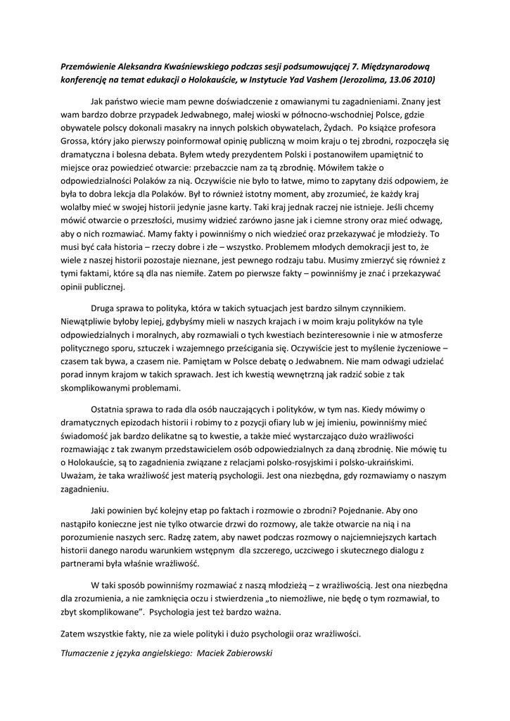 Przemówienie Aleksandra Kwaśniewskiego podczas sesji podsumowującej 7. Międzynarodową konferencję na temat edukacji o Holokauście, w Instytucie Yad Vashem (Jerozolima, 13.06 2010) Jak paostwo wiecie mam pewne doświadczenie z omawianymi tu zagadnieniami. Znany jest wam bardzo dobrze przypadek Jedwabnego, małej wioski w północno-wschodniej Polsce, gdzie obywatele polscy dokonali masakry na innych polskich obywatelach, Żydach. Po książce profesora Grossa, który jako pierwszy poinformował opinię publiczną w moim kraju o tej zbrodni, rozpoczęła się dramatyczna i bolesna debata. Byłem wtedy prezydentem Polski i postanowiłem upamiętnid to miejsce oraz powiedzied otwarcie: przebaczcie nam za tą zbrodnię. Mówiłem także o odpowiedzialności Polaków za nią. Oczywiście nie było to łatwe, mimo to zapytany dziś odpowiem, że była to dobra lekcja dla Polaków. Był to również istotny moment, aby zrozumied, że każdy kraj wolałby mied w swojej historii jedynie jasne karty. Taki kraj jednak raczej nie istnieje. Jeśli chcemy mówid otwarcie o przeszłości, musimy widzied zarówno jasne jak i ciemne strony oraz mied odwagę, aby o nich rozmawiad. Mamy fakty i powinniśmy o nich wiedzied oraz przekazywad je młodzieży. To musi byd cała historia – rzeczy dobre i złe – wszystko. Problemem młodych demokracji jest to, że wiele z naszej historii pozostaje nieznane, jest pewnego rodzaju tabu. Musimy zmierzyd się również z tymi faktami, które są dla nas niemiłe. Zatem po pierwsze fakty – powinniśmy je znad i przekazywad opinii publicznej. Druga sprawa to polityka, która w takich sytuacjach jest bardzo silnym czynnikiem. Niewątpliwie byłoby lepiej, gdybyśmy mieli w naszych krajach i w moim kraju polityków na tyle odpowiedzialnych i moralnych, aby rozmawiali o tych kwestiach bezinteresownie i nie w atmosferze politycznego sporu, sztuczek i wzajemnego prześcigania się. Oczywiście jest to myślenie życzeniowe – czasem tak bywa, a czasem nie. Pamiętam w Polsce debatę o Jedwabnem. Nie mam odwagi udzielad porad innym krajom w takich sprawach. Jest ich kwestią wewnętrzną jak radzid sobie z tak skomplikowanymi problemami. Ostatnia sprawa to rada dla osób nauczających i polityków, w tym nas. Kiedy mówimy o dramatycznych epizodach historii i robimy to z pozycji ofiary lub w jej imieniu, powinniśmy mied świadomośd jak bardzo delikatne są to kwestie, a także mied wystarczająco dużo wrażliwości rozmawiając z tak zwanym przedstawicielem osób odpowiedzialnych za daną zbrodnię. Nie mówię tu o Holokauście, są to zagadnienia związane z relacjami polsko-rosyjskimi i polsko-ukraioskimi. Uważam, że taka wrażliwośd jest materią psychologii. Jest ona niezbędna, gdy rozmawiamy o naszym zagadnieniu. Jaki powinien byd kolejny etap po faktach i rozmowie o zbrodni? Pojednanie. Aby ono nastąpiło konieczne jest nie tylko otwarcie drzwi do rozmowy, ale także otwarcie na nią i na porozumienie naszych serc. Radzę zatem, aby nawet podczas rozmowy o najciemniejszych kartach historii danego narodu warunkiem wstępnym dla szczerego, uczciwego i skutecznego dialogu z partnerami była właśnie wrażliwośd. W taki sposób powinniśmy rozmawiad z naszą młodzieżą – z wrażliwością. Jest ona niezbędna dla zrozumienia, a nie zamknięcia oczu i stwierdzenia „to niemożliwe, nie będę o tym rozmawiał, to zbyt skomplikowane”. Psychologia jest też bardzo ważna. Zatem wszystkie fakty, nie za wiele polityki i dużo psychologii oraz wrażliwości. Tłumaczenie z języka angielskiego: Maciek Zabierowski